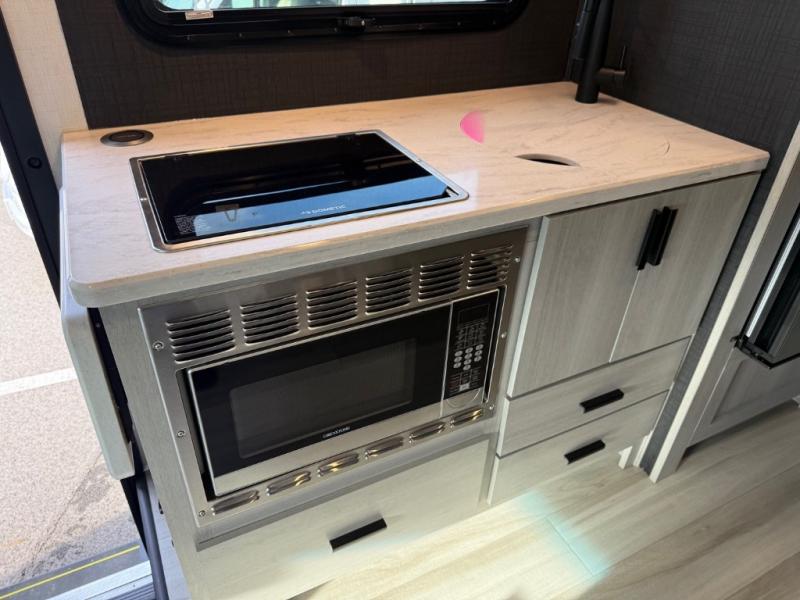 Well-Equipped Kitchen: Includes a cooktop, microwave, refrigerator, and generous counter space for meal prep on the road