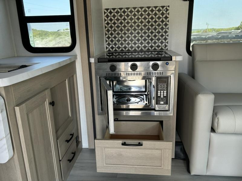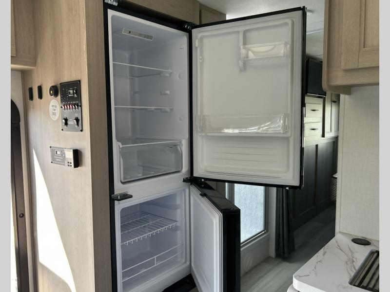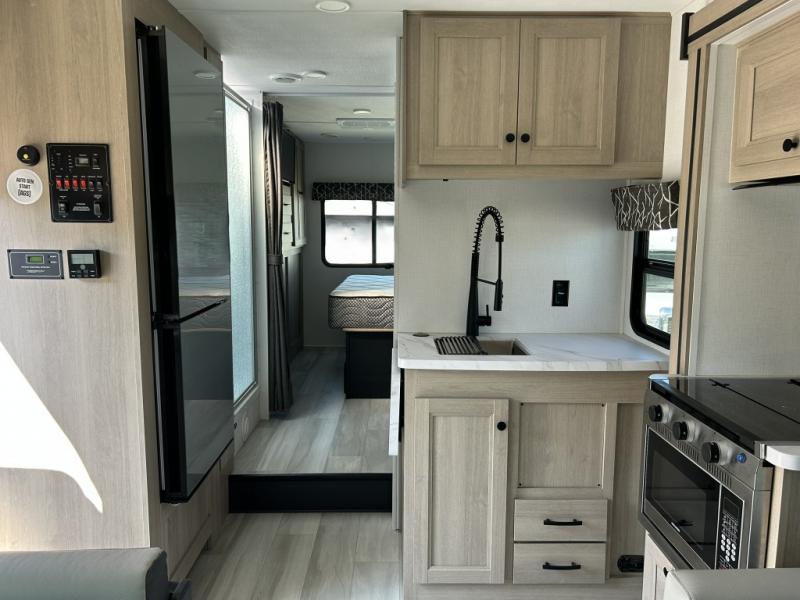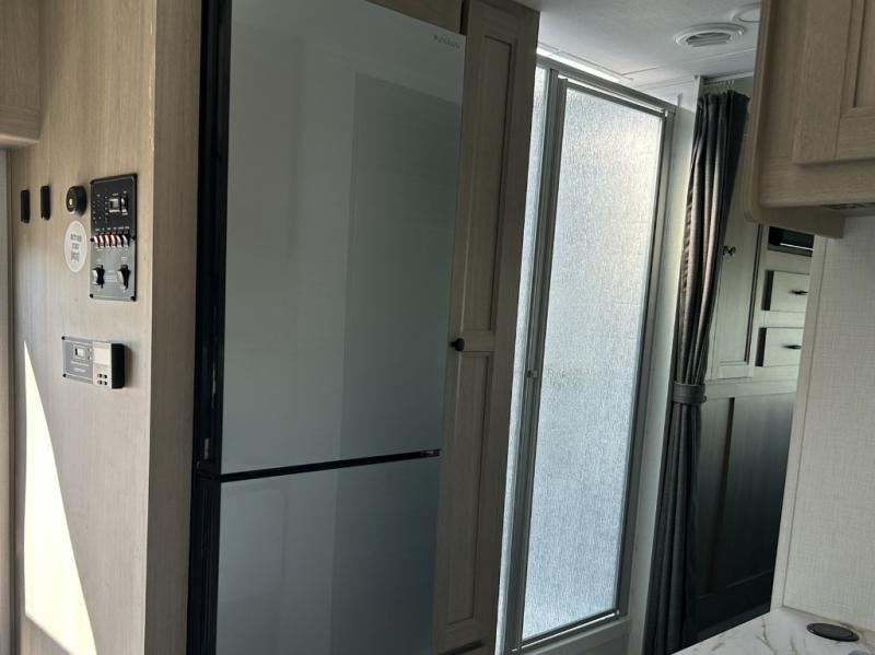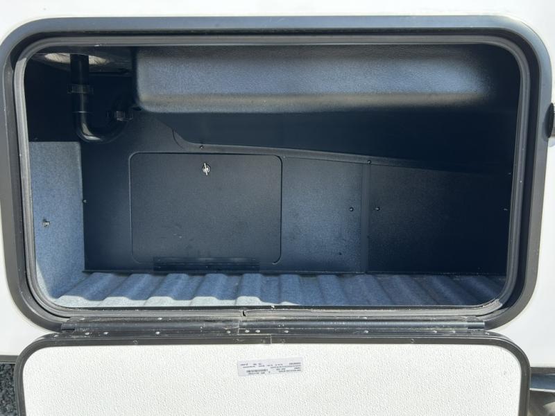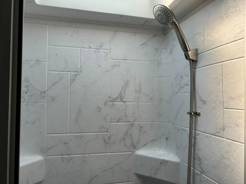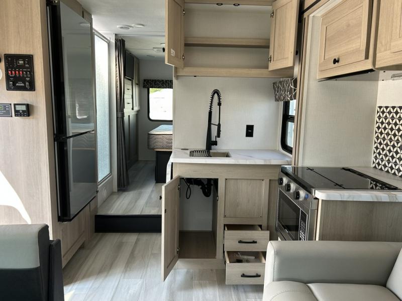 The rear private bedroom gives you your own retreat with a queen bed slide for added space. The split-style bathroom offers convenience and privacy, with a shower on one side and a separate vanity and lavatory on the other — ideal for couples or families traveling together.