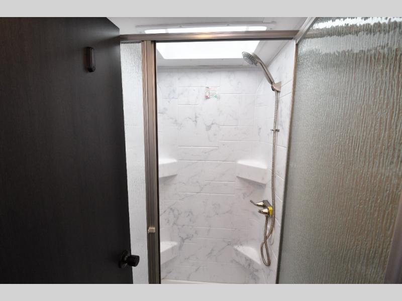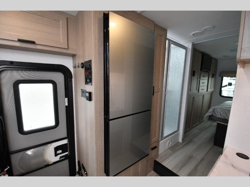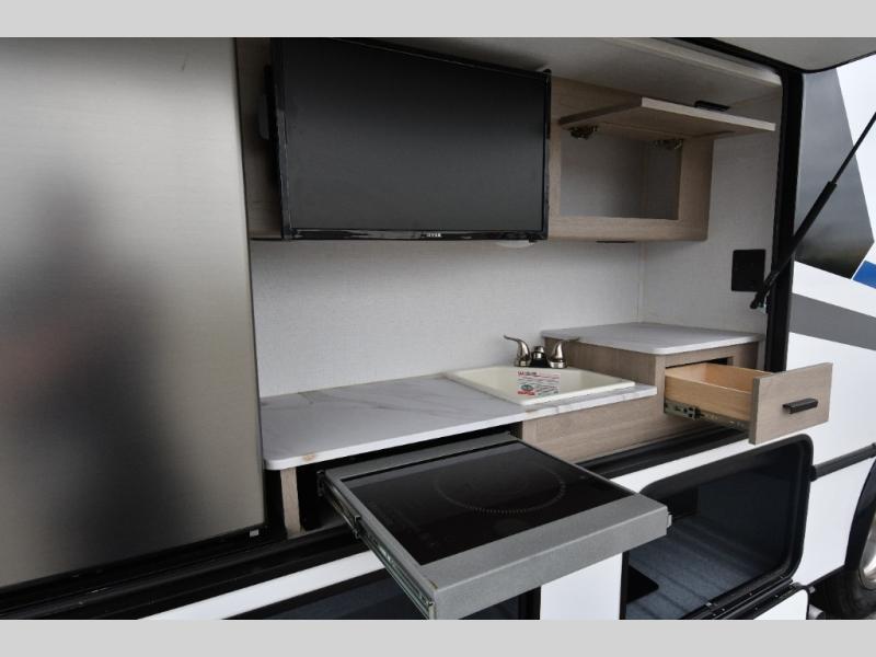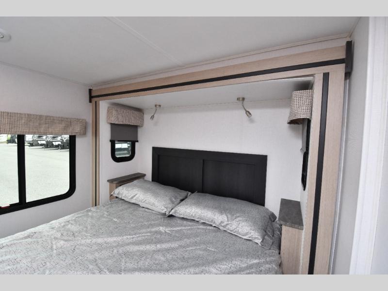 Step inside to a spacious interior with dual slide-outs that expand the living area. A private rear queen bedroom provides a restful retreat, while the U-shaped dinette and sofa offer additional sleeping space for family or guests. The fully equipped kitchen features solid-surface countertops, ample storage, and modern appliances, making meal prep simple whether you’re at the campground or on the road.