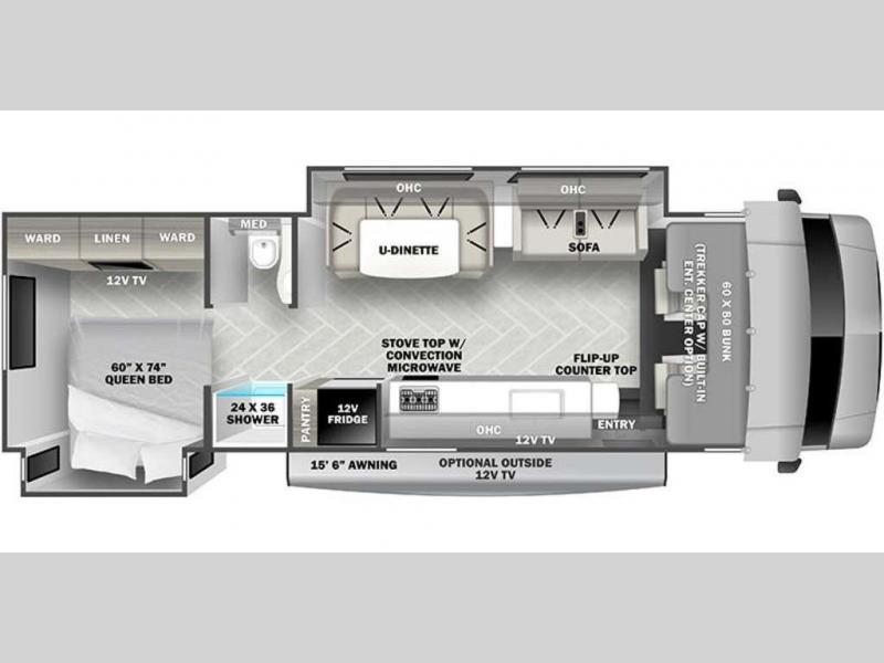 This Sunseeker Classic Class C gas motorhome has a rear private bedroom for you to sleep in each night, a sofa to rest on after you get home from mountain climbing, a split-style bathroom to clean up in each morning, and a complete kitchen to cook in when you're hungry. The RV queen bed, U-shaped dinette, sofa, and 60" x 80" bunk over the cab give you plenty of space to sleep eight people, and you can switch out the sofa for the optional power theater seating if you would like. Two slides add more space to this coach, and a 10.7-cubic foot refrigerator can hold lots of food.