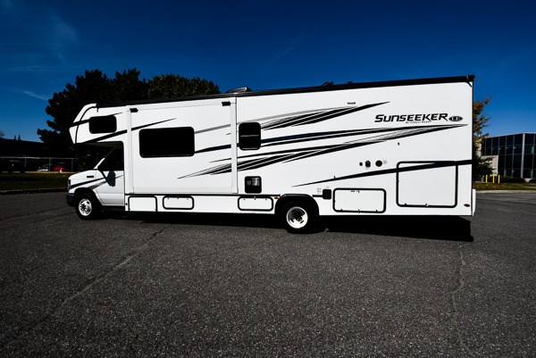 This Sunseeker LE Class C gas motorhome offers you quite a bit of sleeping space with its RV queen bed, kid's sofa sleeper, flip-down bunk, booth dinette, sofa, and 60" x 80" bunk over the cab. There are also two slides on this coach so that you can have more space for all of those travelers, and the great kitchen amenities, like the recessed three-burner range and convection microwave, will make it easy to feed all of those people. You will also have a full bathroom for everyone to use when they need to clean up, and the shower skylight will add some brightness to the bathroom. Head outside for an evening together underneath the 11' electric awning with LED lights.