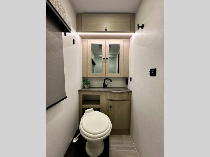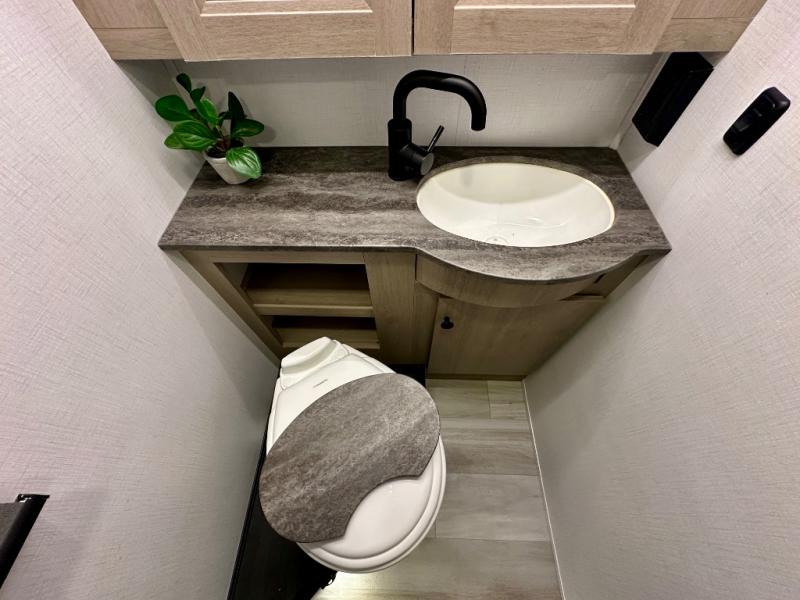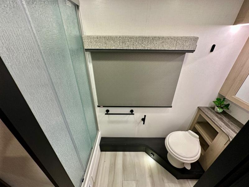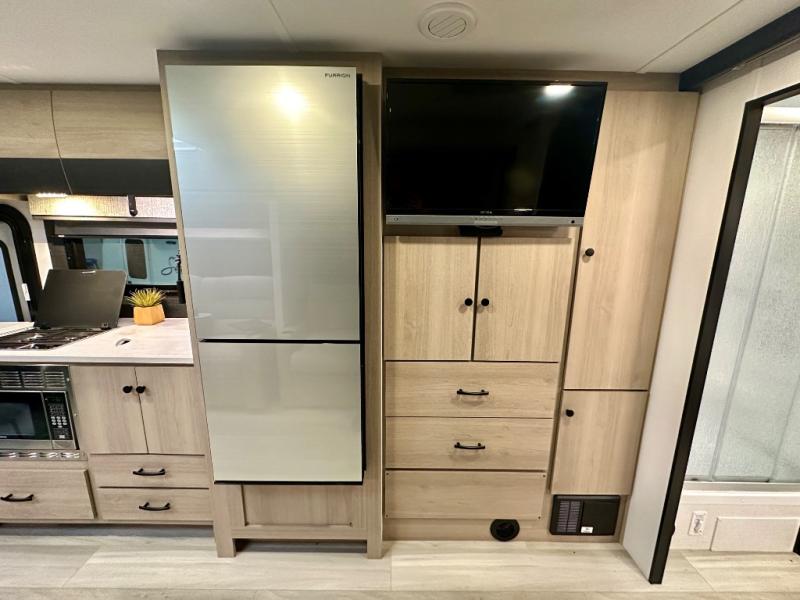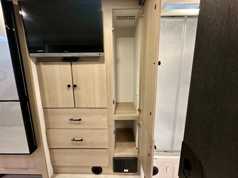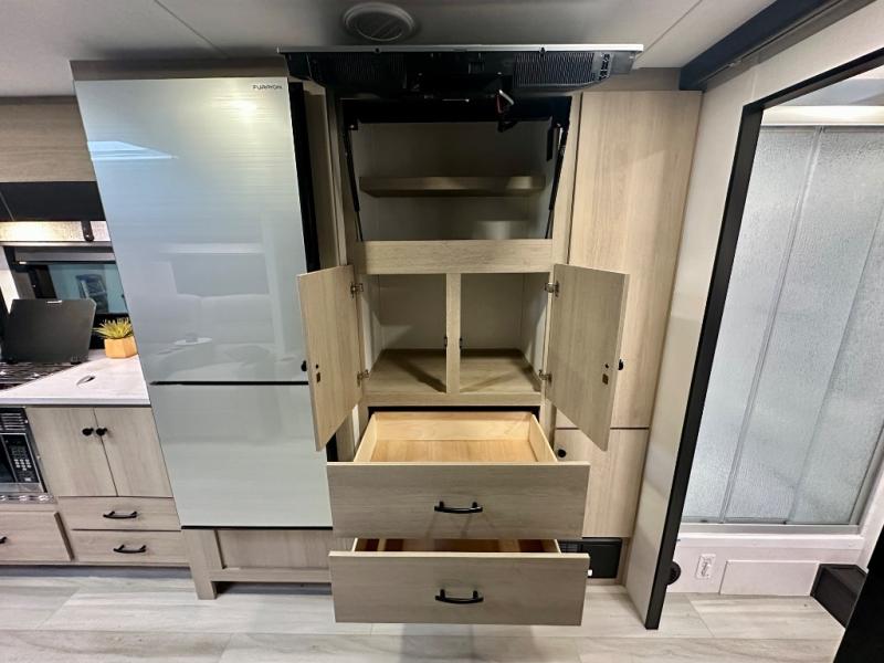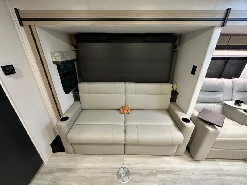 This versatile coach is perfect for the couple ready for adventure. The overhead bunk will allow one to two more to tag along, or you can choose the optional Trekker cap to replace the overhead bunk. After you park for the day, relax on the power theater seat with a good book, or enjoy a meal on the sofa with a removable table. And the queen Murphy bed can be folded down when you're ready for bed. You will find drawers with hidden storage behind the TV for your valuables, plus plenty of overhead compartments. This model also features a spacious full rear bath, allowing you to stay clean throughout your whole trip!