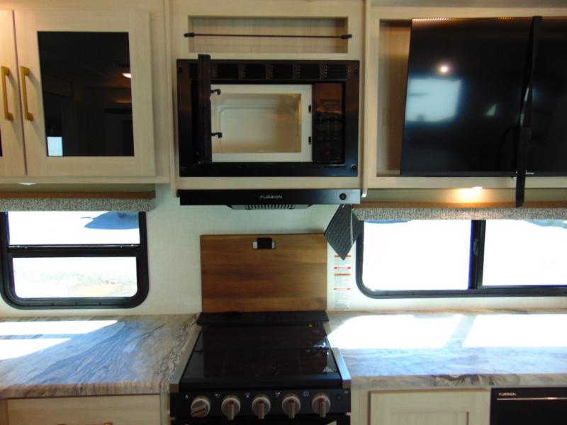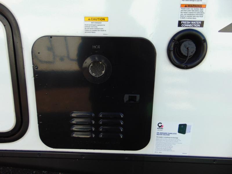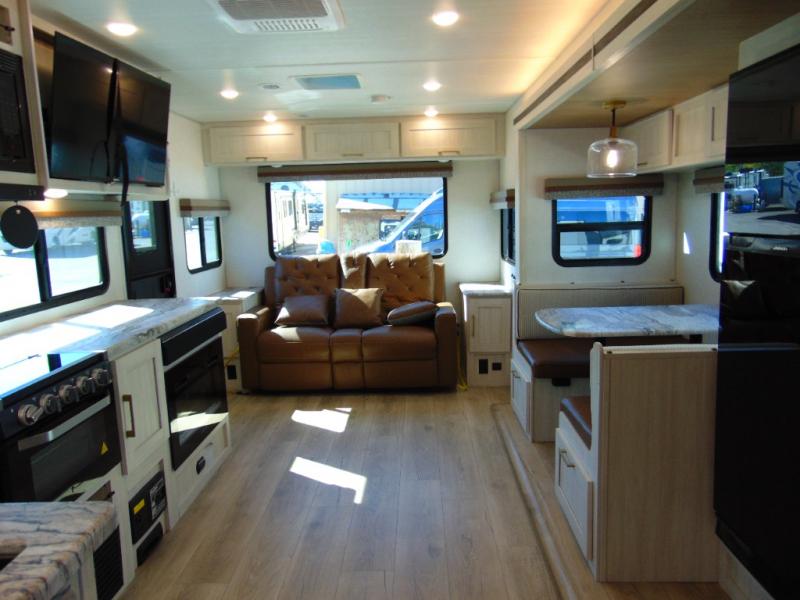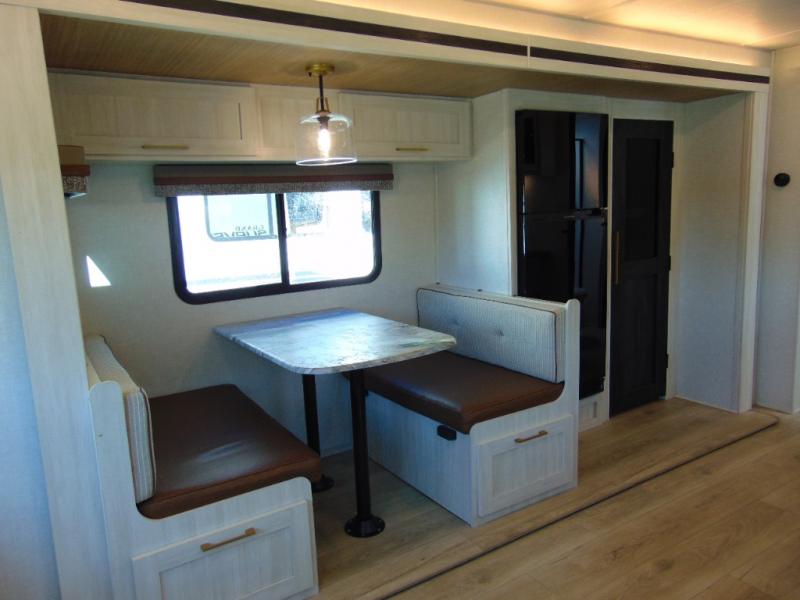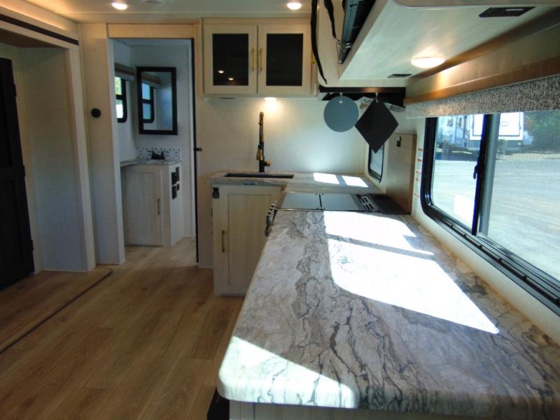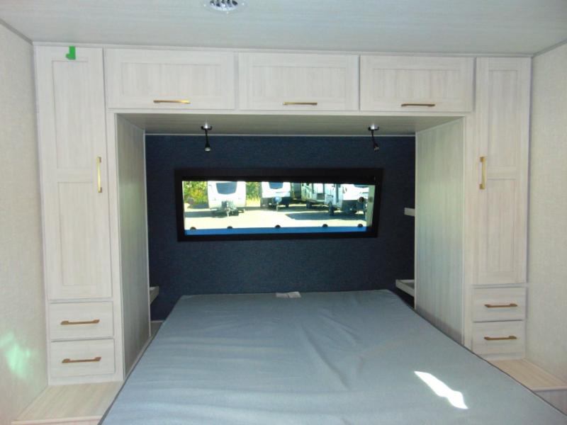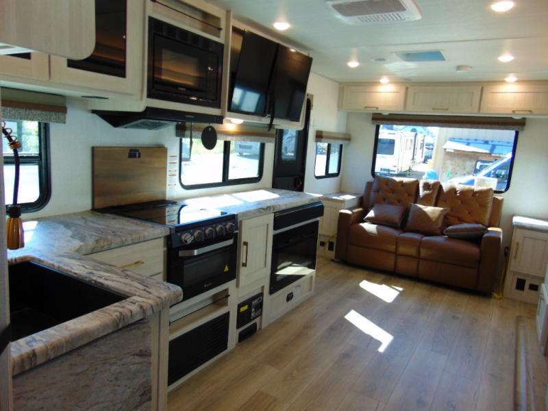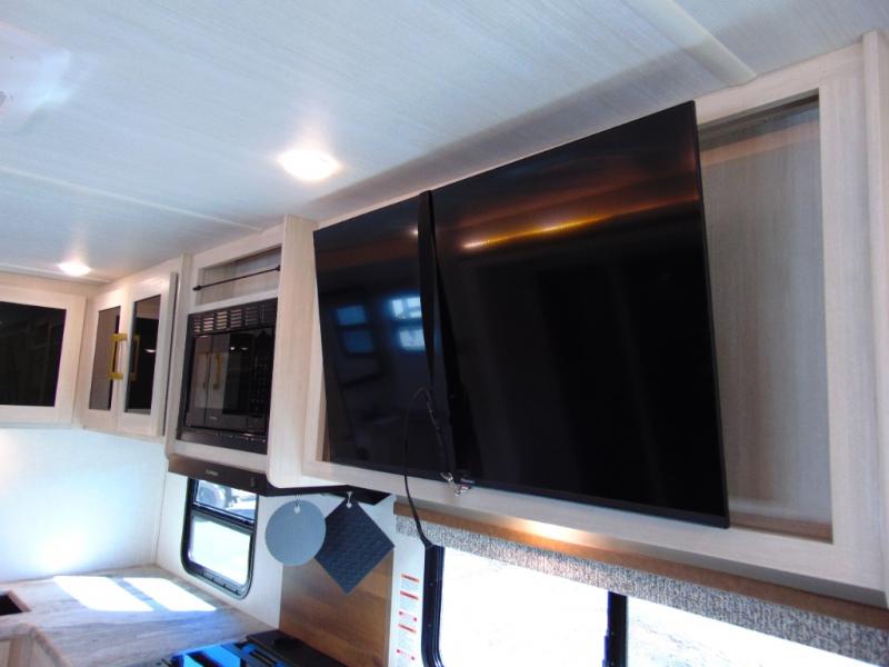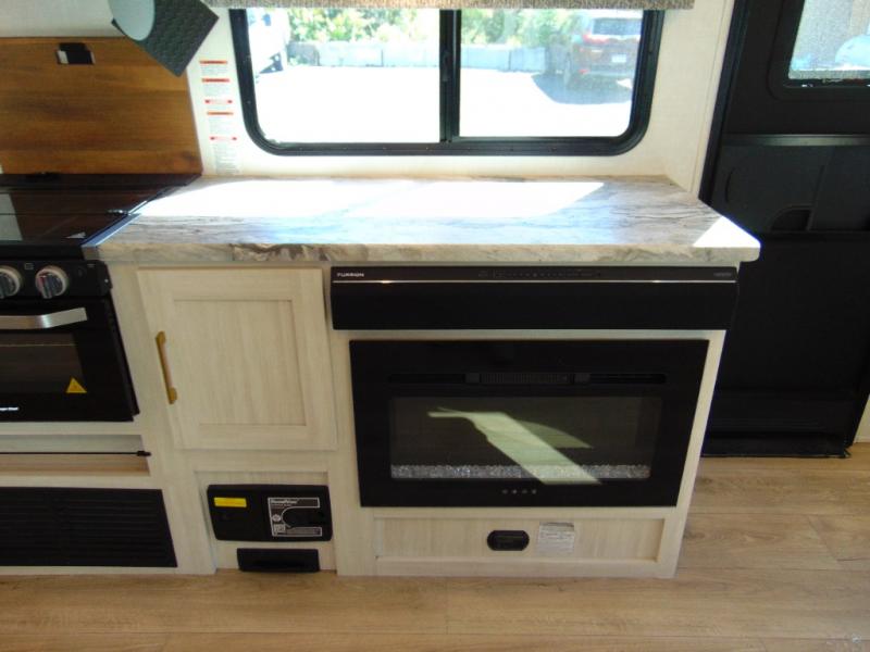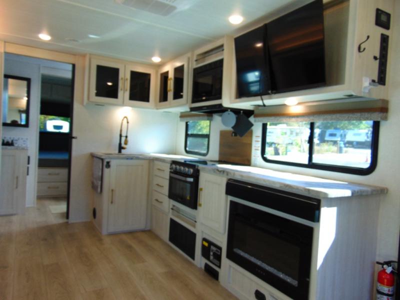 Camping your favorite site has never been more relaxing than in this travel trailer. You can comfortably sleep five to six each night with the custom king bed in the front master bedroom, plus the tri-fold sofa and booth dinette in the rear living area. There is also a walk-through bath that will easily accessible for everyone to use. Whip up your best meals on the residential range, or head outdoors to cook on the gas griddle included within the outdoor kitchen. You'll also find a sink and a refrigerator, and a 21' power awning with LED lights to create the perfect outdoor living space. After a day outdoors, you can relax by the fireplace or watch a movie on the HD TV, and there is a large kitchen pantry to stock up on snacks!