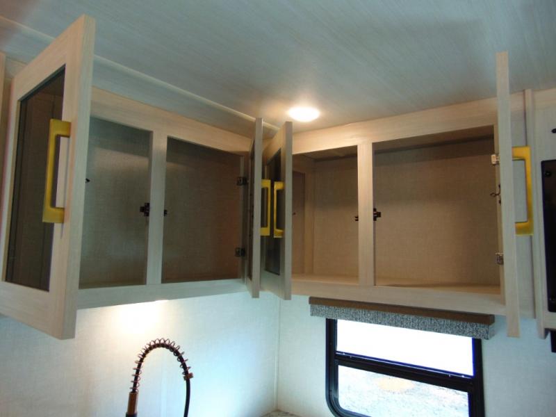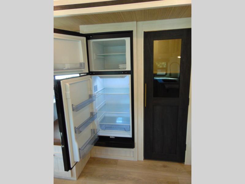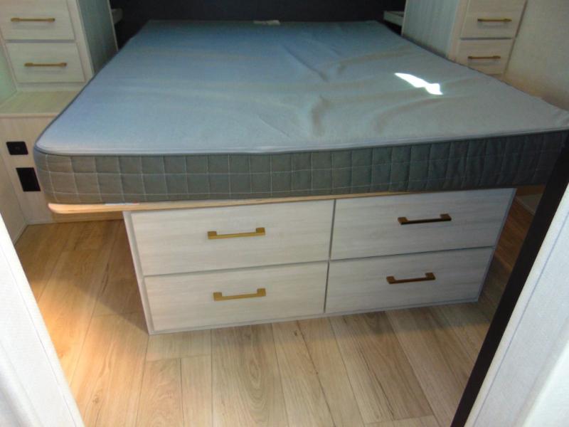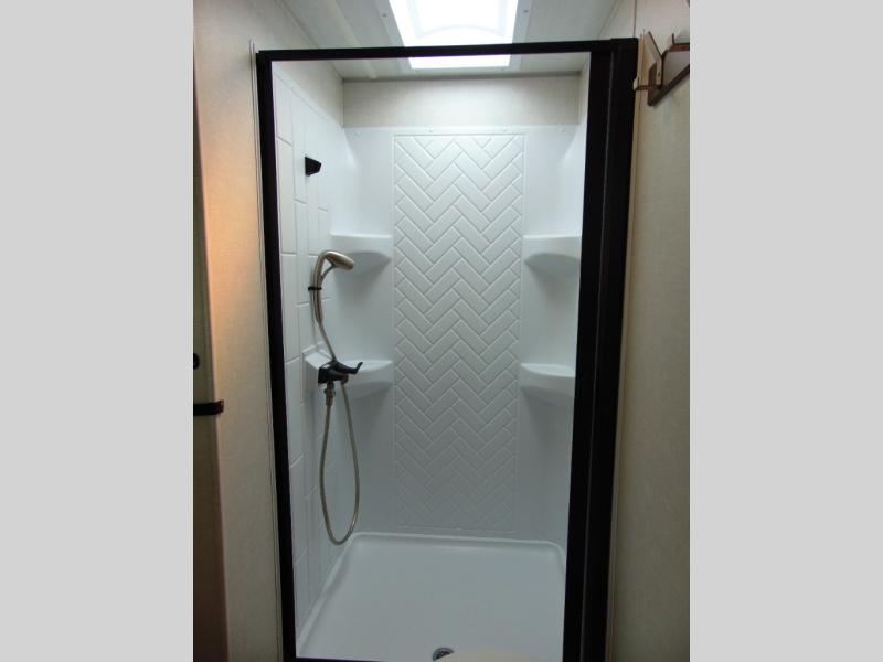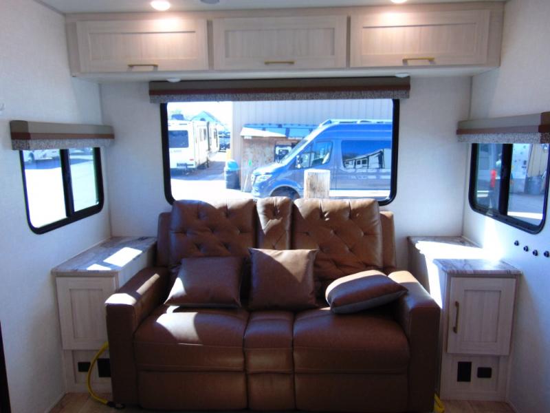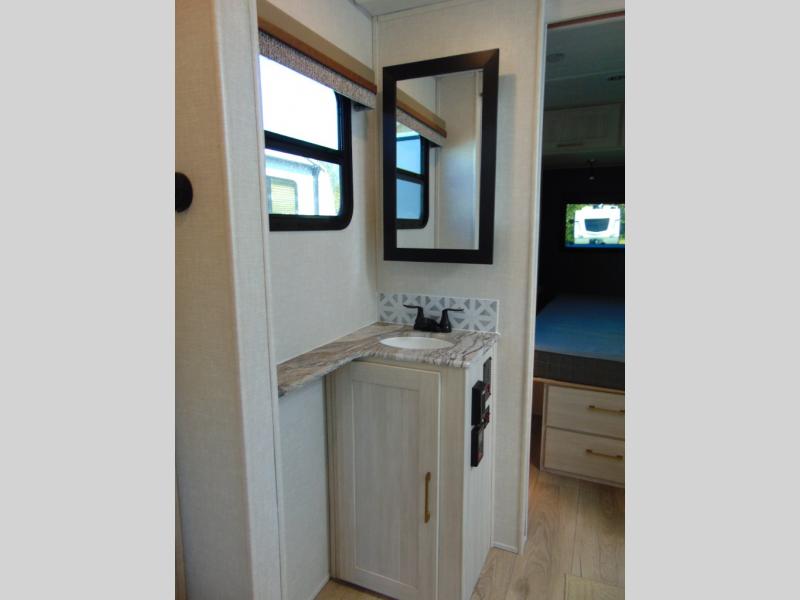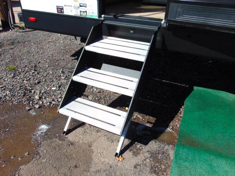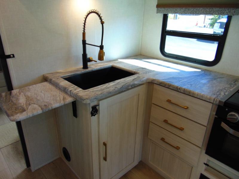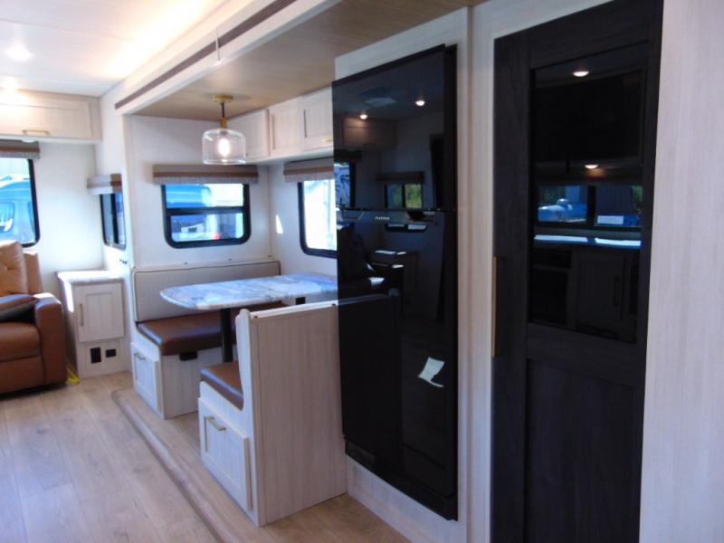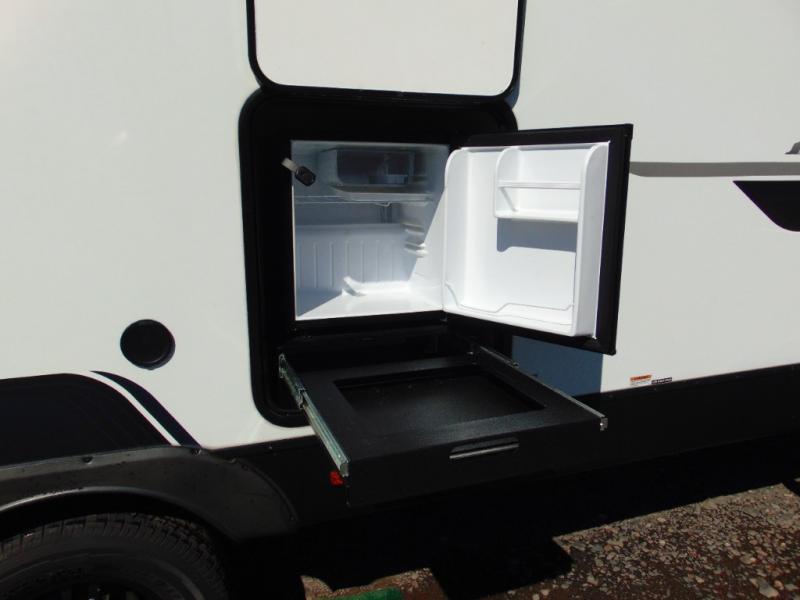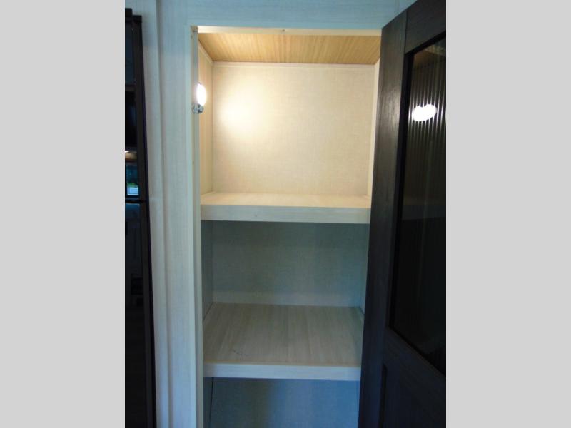 Camping your favorite site has never been more relaxing than in this travel trailer. You can comfortably sleep five to six each night with the custom king bed in the front master bedroom, plus the tri-fold sofa and booth dinette in the rear living area. There is also a walk-through bath that will easily accessible for everyone to use. Whip up your best meals on the residential range, or head outdoors to cook on the gas griddle included within the outdoor kitchen. You'll also find a sink and a refrigerator, and a 21' power awning with LED lights to create the perfect outdoor living space. After a day outdoors, you can relax by the fireplace or watch a movie on the HD TV, and there is a large kitchen pantry to stock up on snacks!