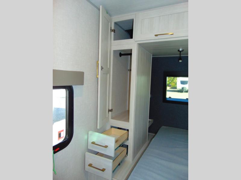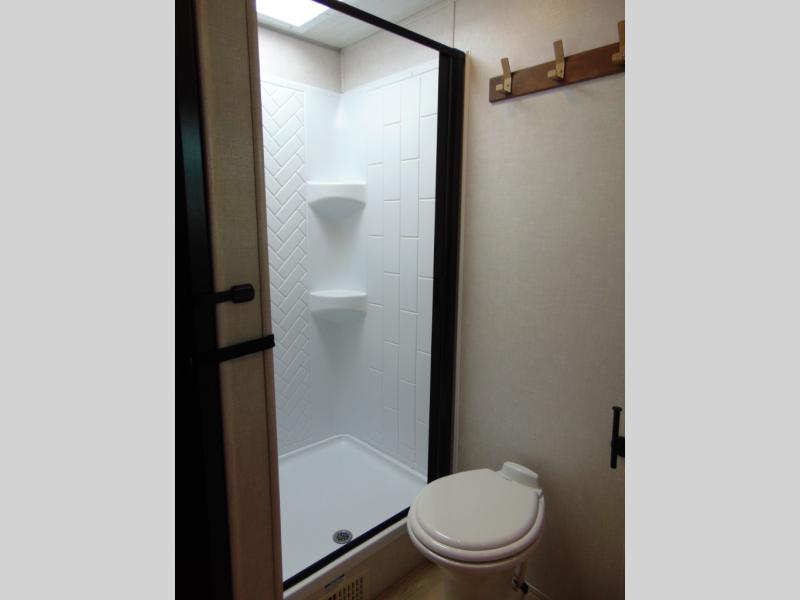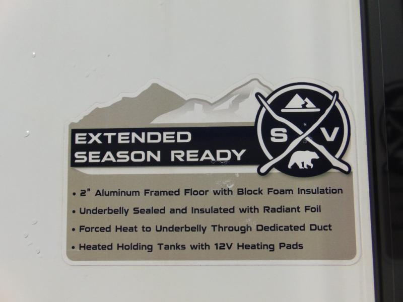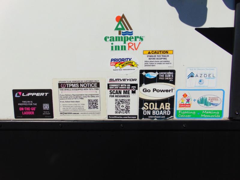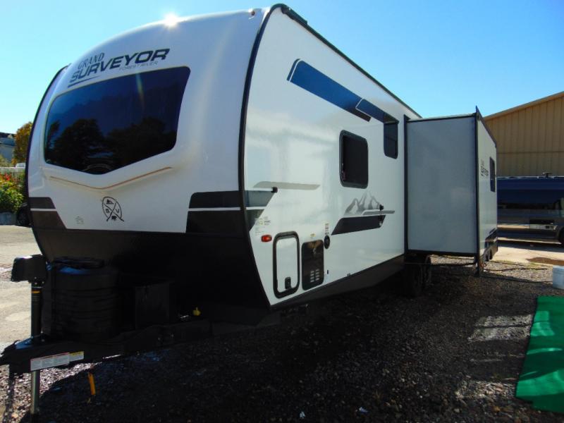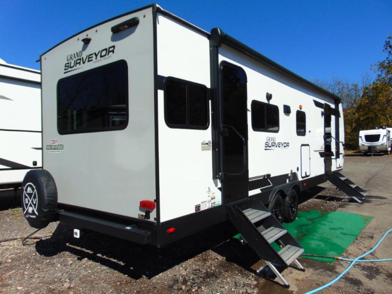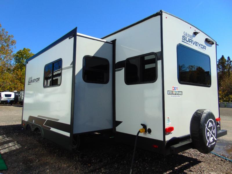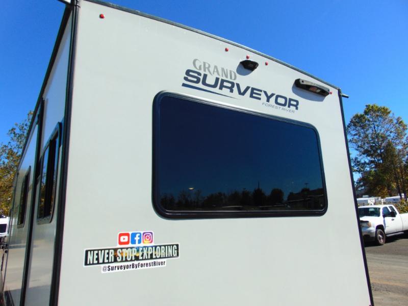 With any Grand Surveyor travel trailer by Forest River you will enjoy turn-key ready-to-go features and quality construction! Each model includes Azdel composite walls and a gel coated fiberglass front cap with an automotive style tinted windshield for a sleek look. There are friction hinge black glass entry door(s), an adjustable platform step with a night light, plus Goodyear tires and a power tongue jack for easy towing. The interior will have you feeling right at home with roller shades, residential faucets, sinks, and bathroom vanity, plus Surf(x) seamless countertops throughout. You can also plan for adventure with a 2" rear accessory and exterior spray port, and there are slam latch baggage doors throughout to keep all your gear secure. Other stand-out features include a central vacuum system, a 200 watt solar panel with a 30 amp controller, a tankless water heater, carpet-free interiors, and the list goes on!