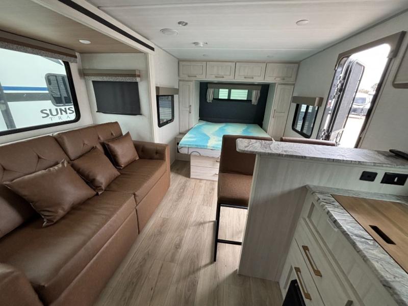 Hit the road with this Surveyor Legend trailer in tow, featuring a tri-fold sofa slide for added seating, sleeping, and interior space. You will also love the breakfast bar with two stools for dining. The queen bed up front will provide a great night's rest, and there is overhead storage at the head of the bed along with dual wardrobes for your things on either side. If you have an overnight guest or two little ones, they can sleep on the tri-fold sofa slide, and everyone will appreciate the privacy of the full rear bath. You will have everything needed each day to prepare meals, including a two burner cooktop, a convection microwave, and refrigerator for your perishables. The pass-through storage will be be perfect for fishing poles, outdoor chairs, yard games, plus there is additional outdoor storage along the rear curbside for your hiking gear!