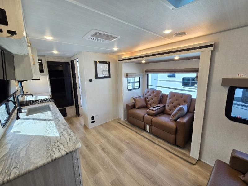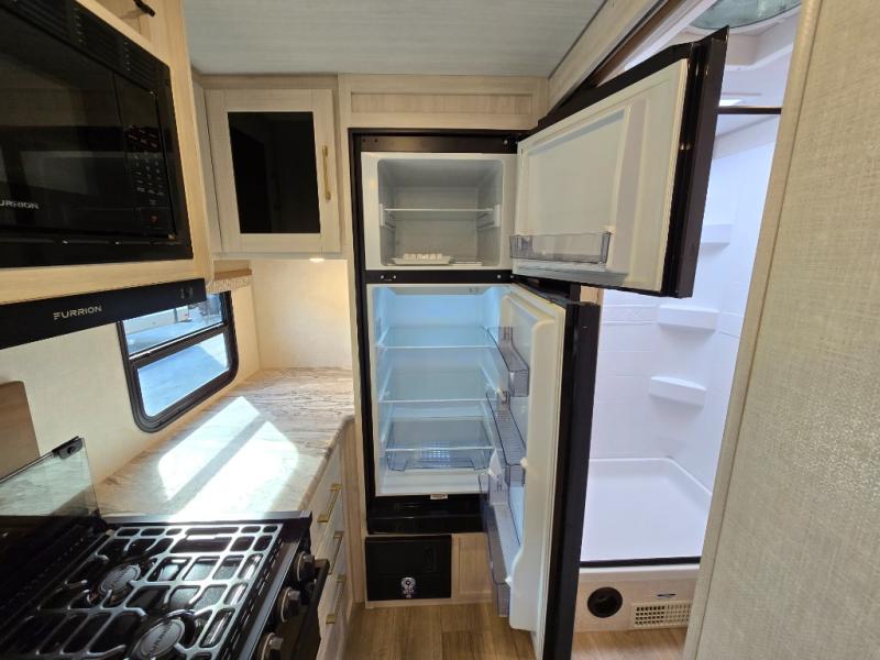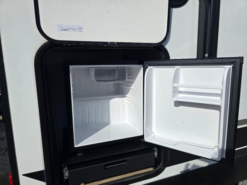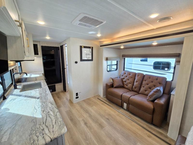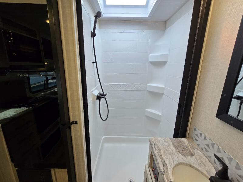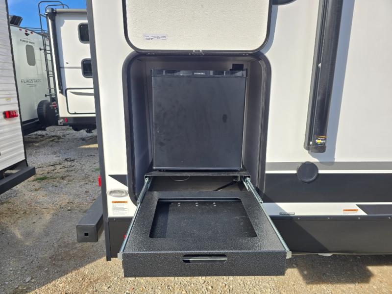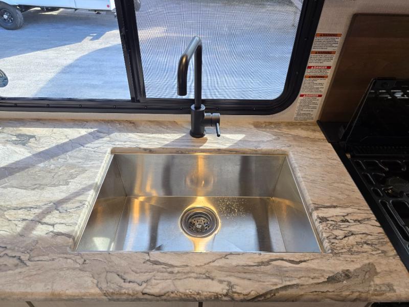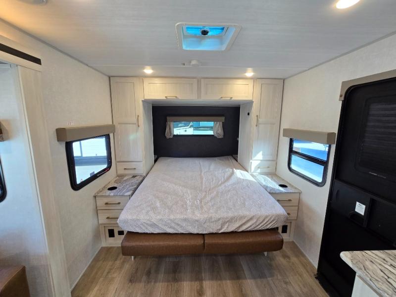 Head to your local state park for fun weekends in this cute couple's trailer. You can convert the sofa to a queen-size Murphy bed each night, and if you have guests they can sleep on the booth dinette. The chef of your group will have their choice to cook indoors on the three burner cooktop, or outdoors on the gas griddle. There is also an outdoor kitchen with a sink, a refrigerator, and a shelf to store spices. Each day you can clean up in the full bath with an upgraded slow-close shower door and a linen closet for clean towels. This model even includes decorative wall art to make you feel right at home.
