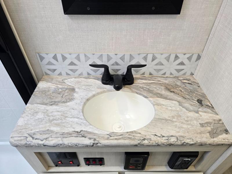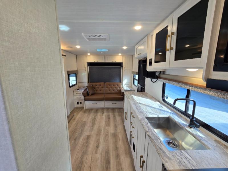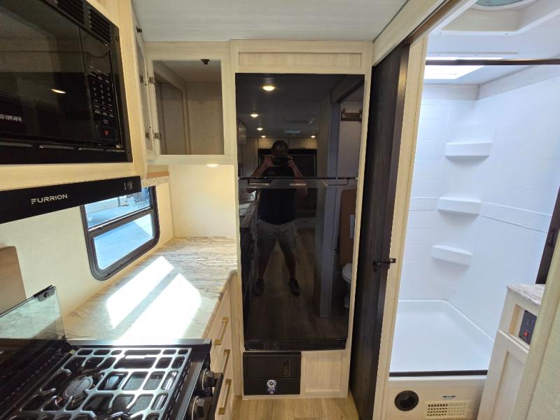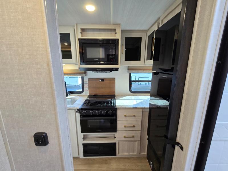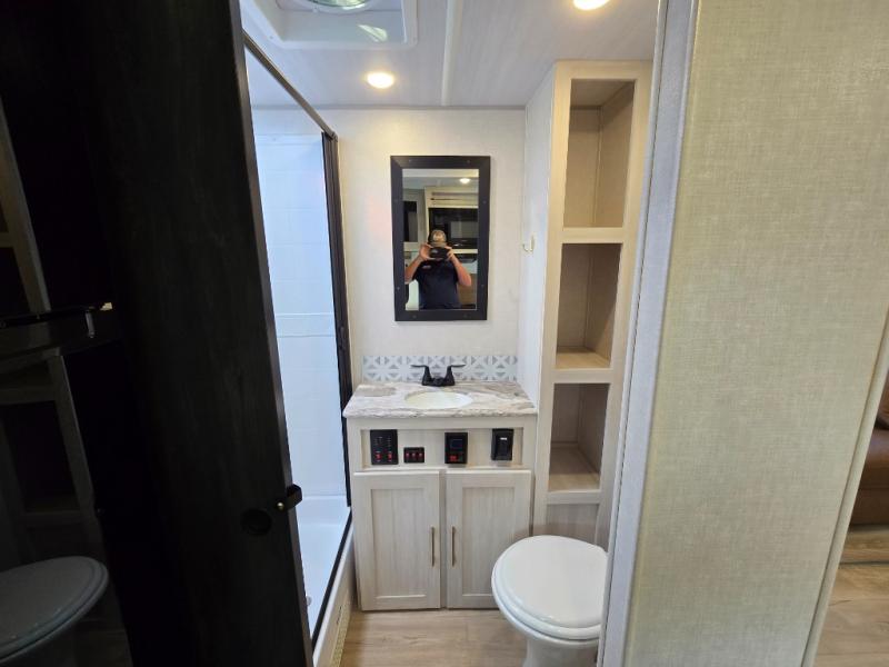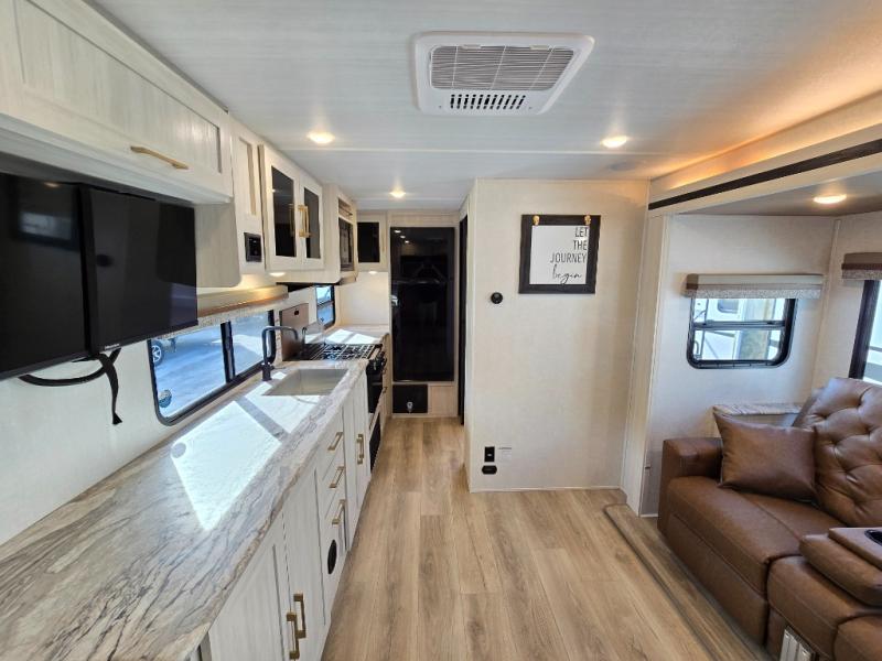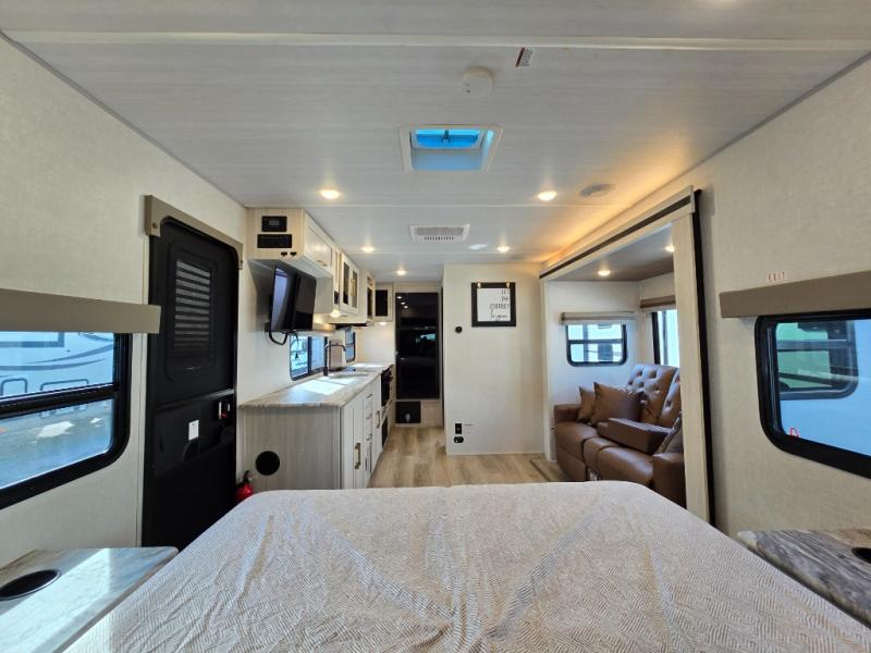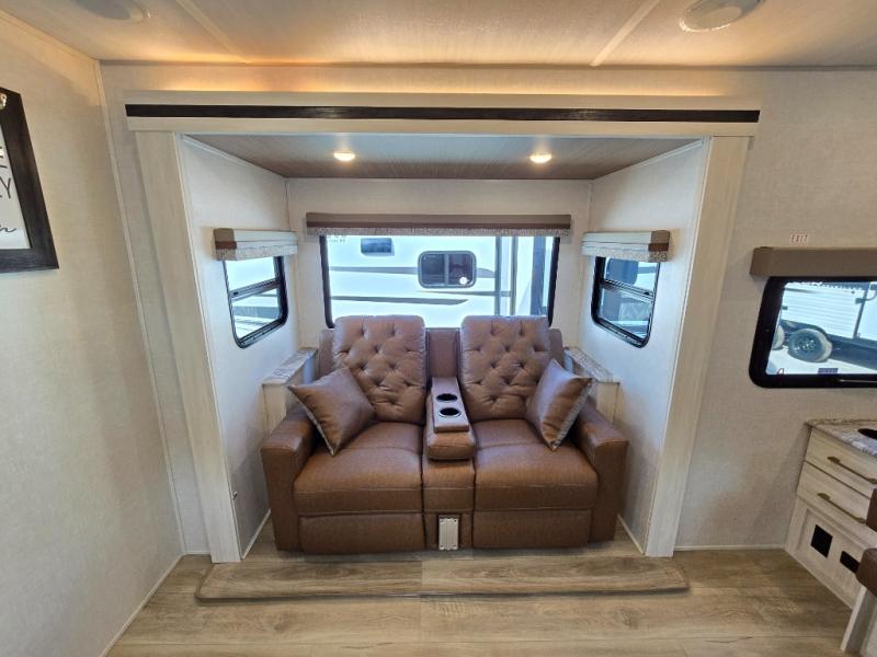 Head to your local state park for fun weekends in this cute couple's trailer. You can convert the sofa to a queen-size Murphy bed each night, and if you have guests they can sleep on the booth dinette. The chef of your group will have their choice to cook indoors on the three burner cooktop, or outdoors on the gas griddle. There is also an outdoor kitchen with a sink, a refrigerator, and a shelf to store spices. Each day you can clean up in the full bath with an upgraded slow-close shower door and a linen closet for clean towels. This model even includes decorative wall art to make you feel right at home.