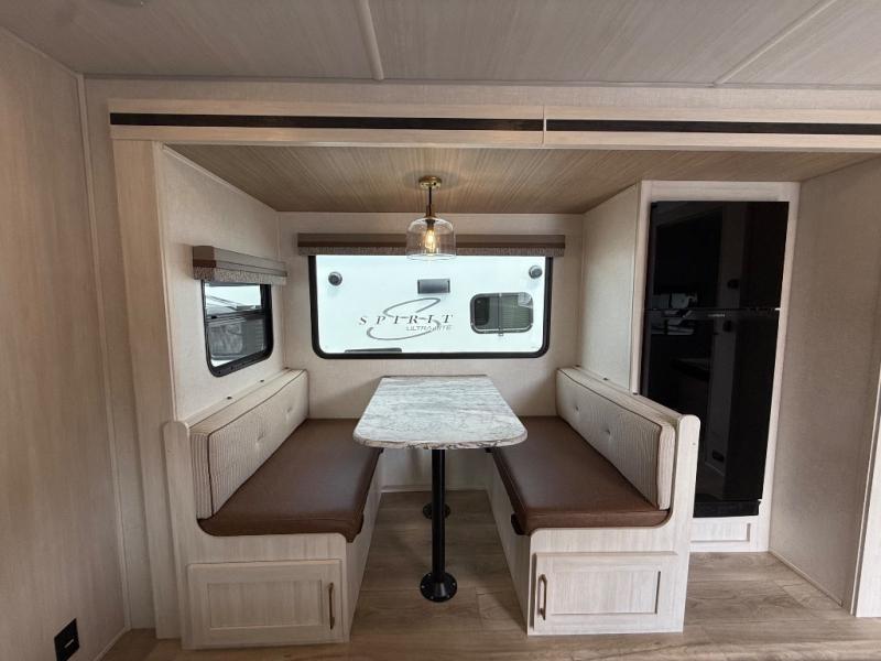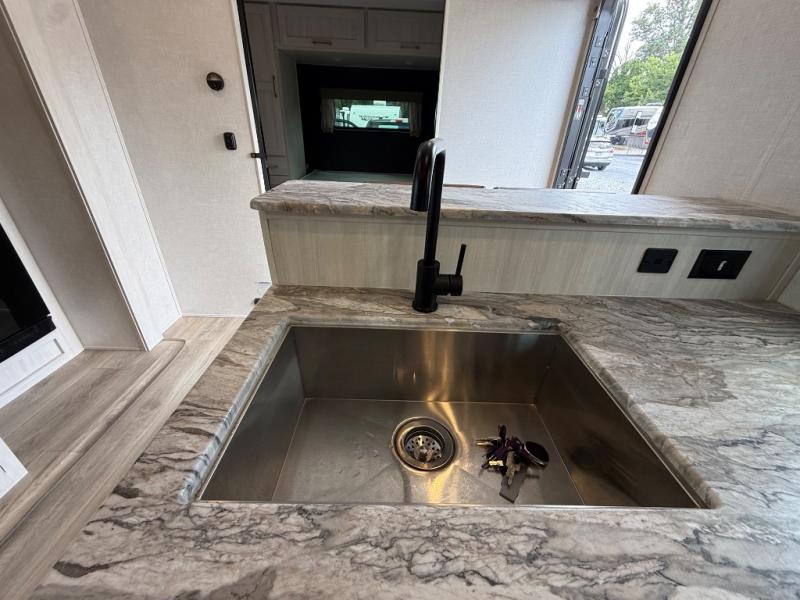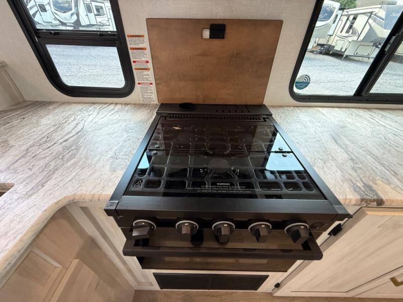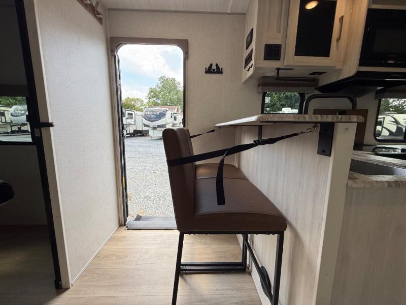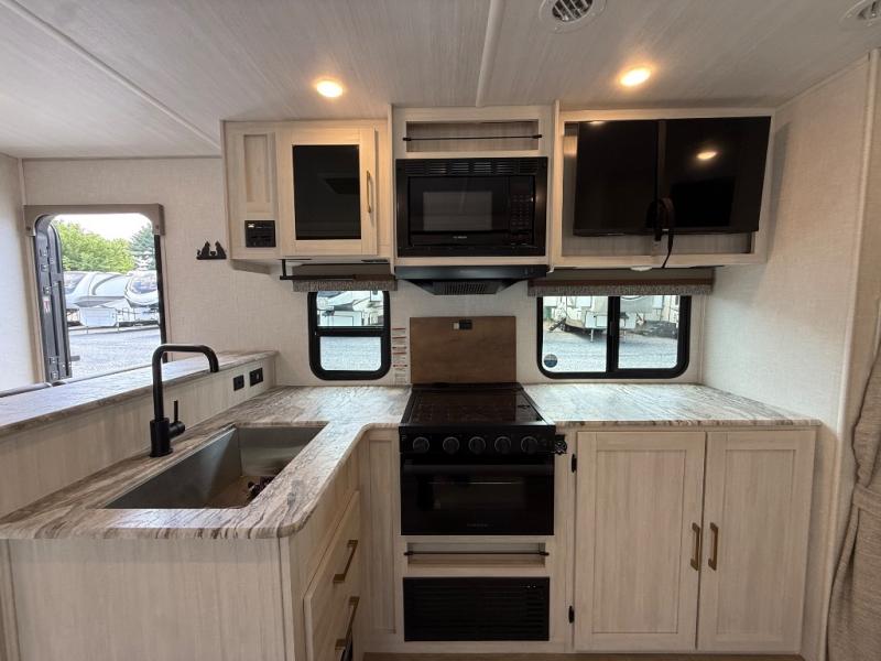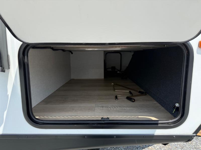 Every trip to the campground will be spent in comfort with this single slide out travel trailer. Once you arrive at the site, remove the kayaks or bikes from the rear storage door, start lunch on the outside kitchen, and put out the 15' power awning with LED lights. The interior includes a booth dinette slide with storage, a bar top with stools, plus an HD TV for movie nights. After a day of fun, head to the front private bedroom for a great night's rest on the queen bed, and you can store your belongings in the dual bedroom wardrobes!