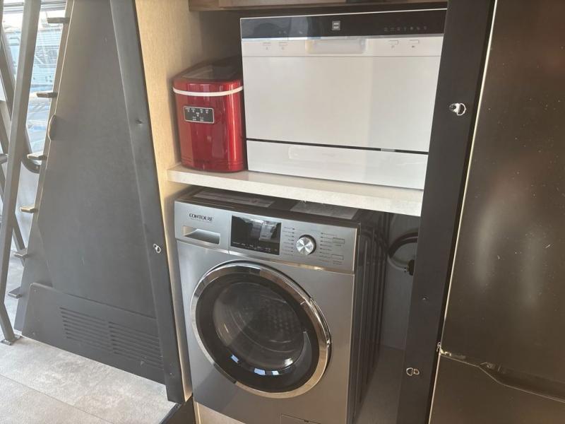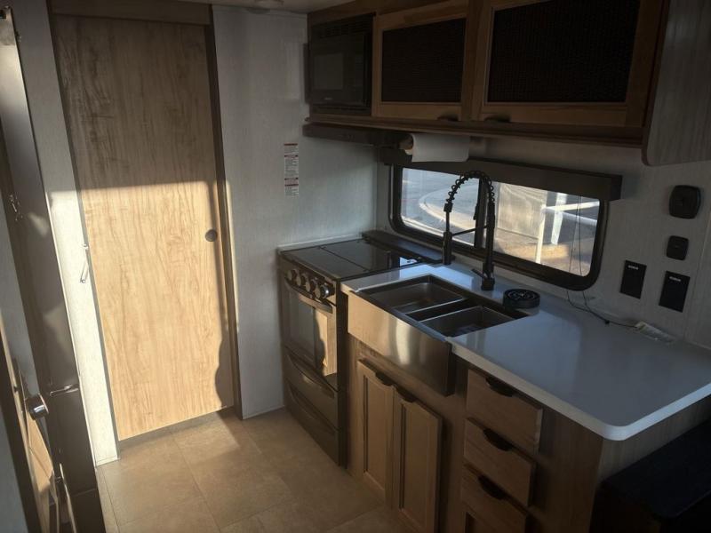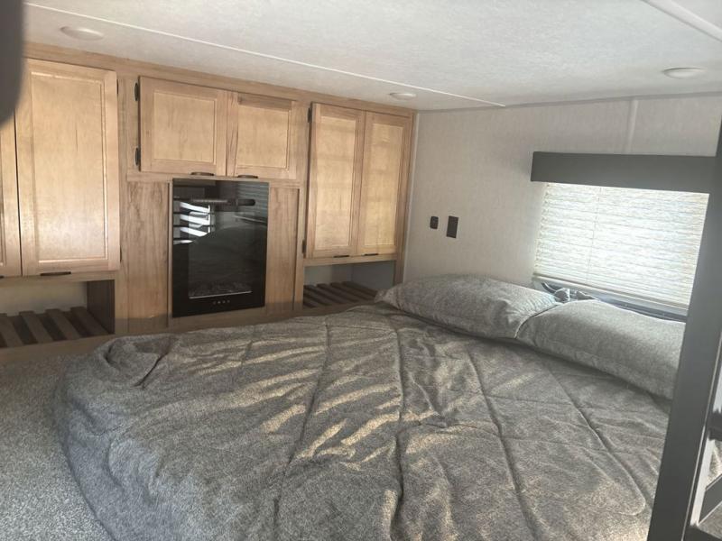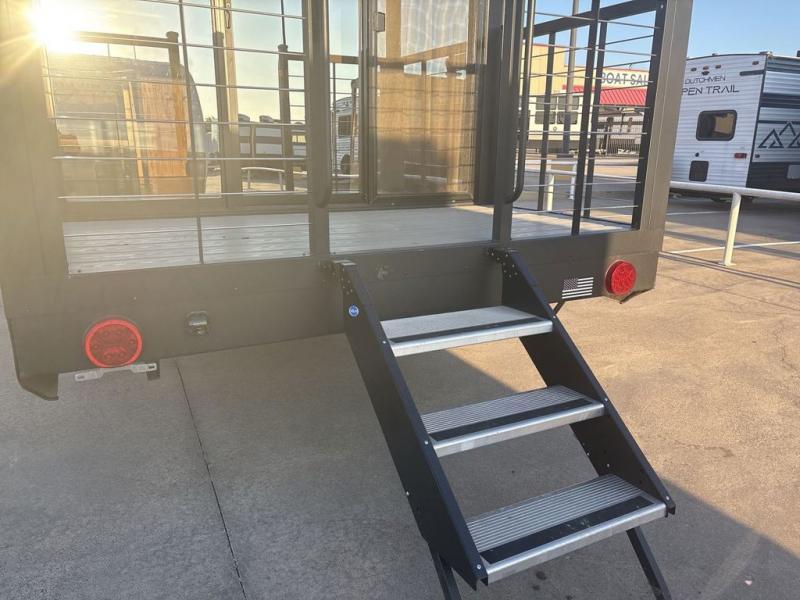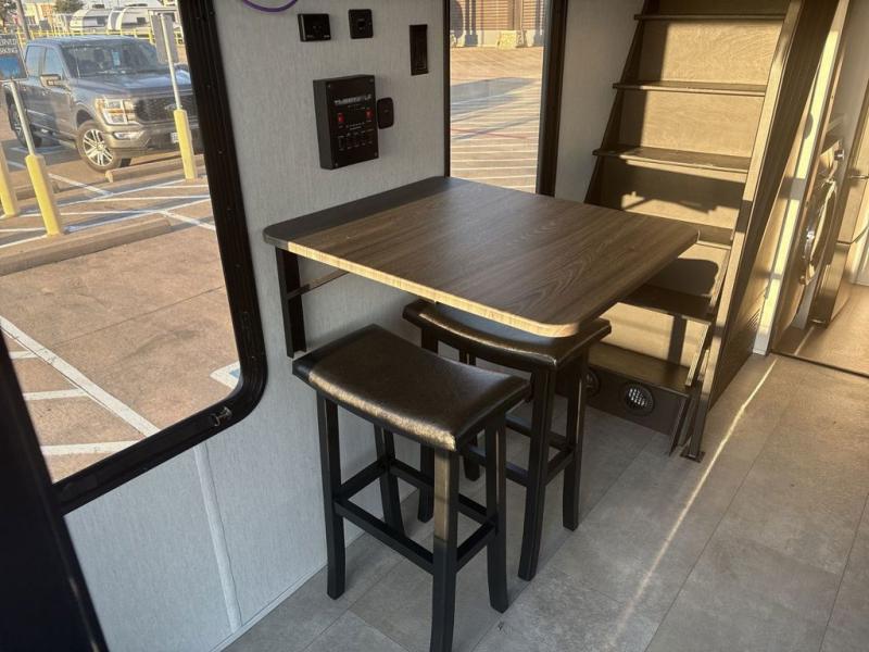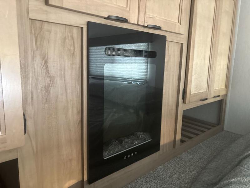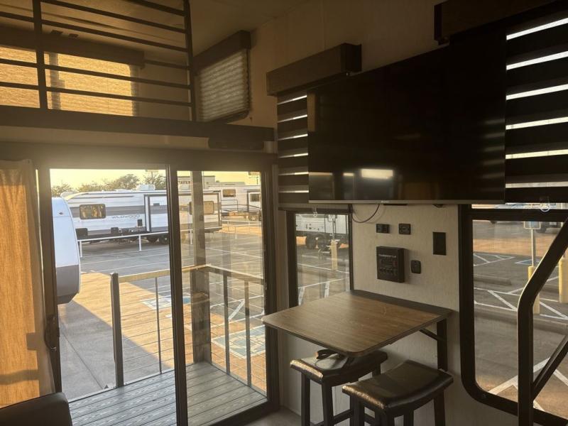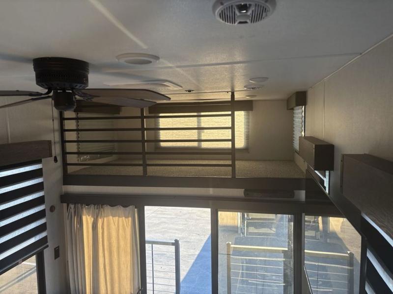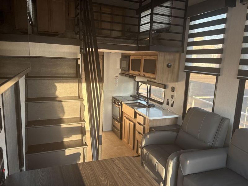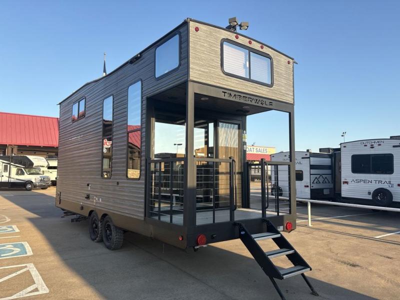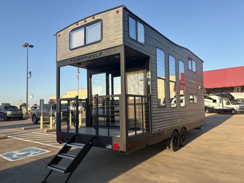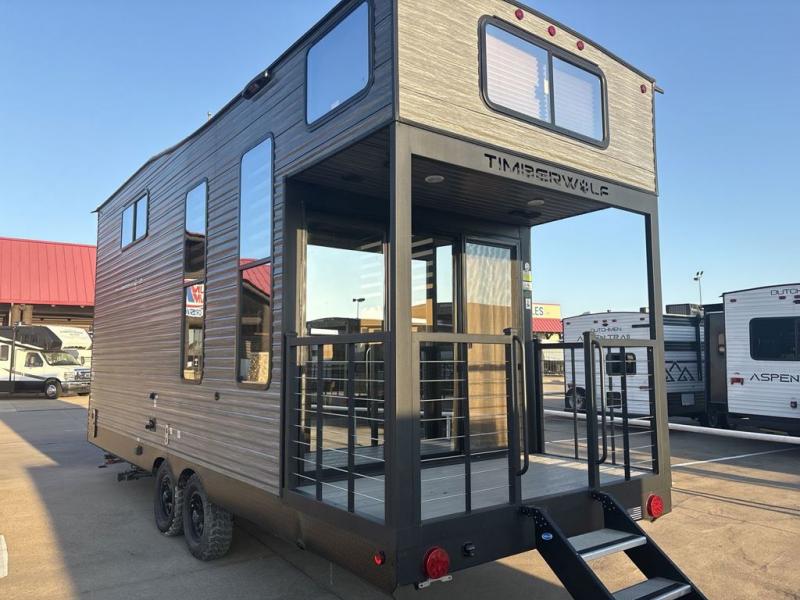 You will fall in love with this mini-loft Timberwolf that will feel more like a tiny home. There are steps leading up to the loft with a queen bed, cabinets, and even a fireplace! The kitchen includes a cooktop and a microwave oven to prepare meals, plus a refrigerator to keep perishables fresh. You'll enjoy relaxing on the 58" sofa, dining at the high top table, or reading a book on the lounge chair. There is also a rear deck with patio doors where you can spend your evenings together, and there is even a second loft above the deck for added sleeping or storage space!
