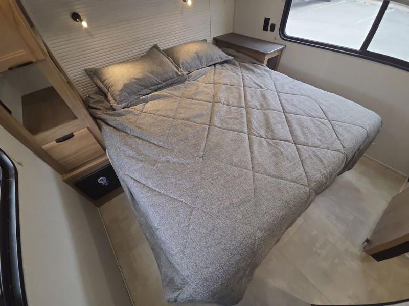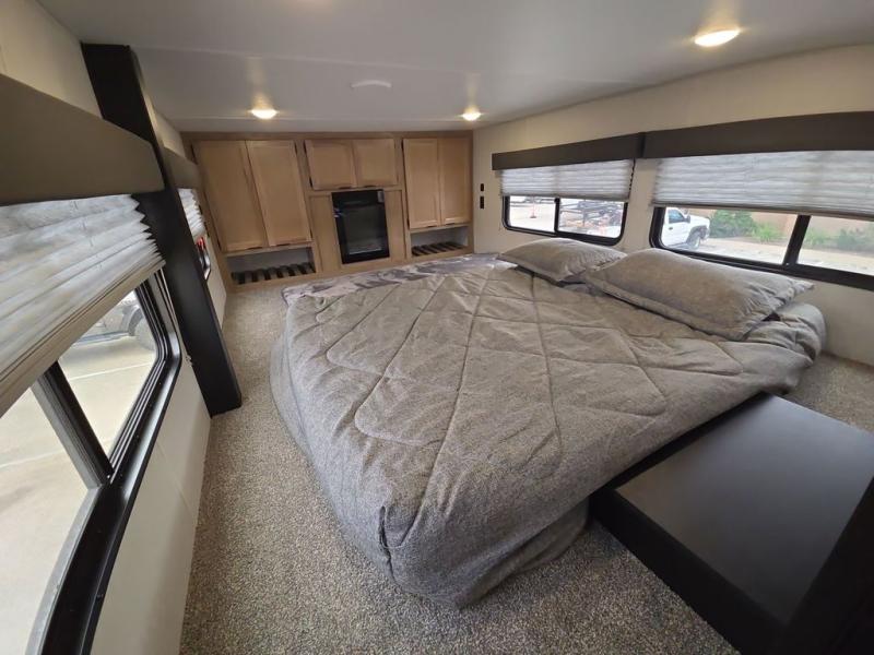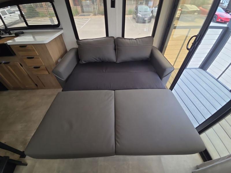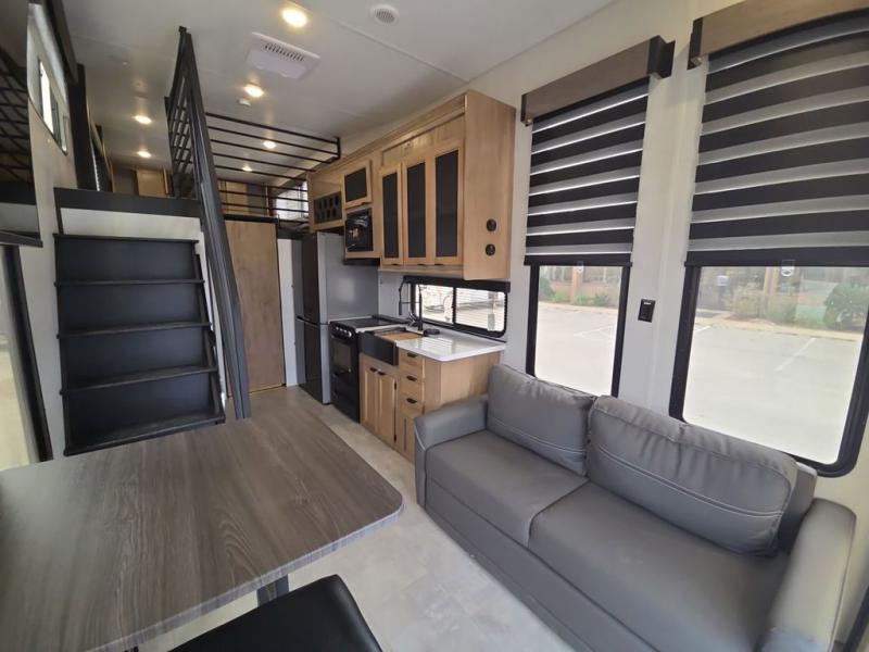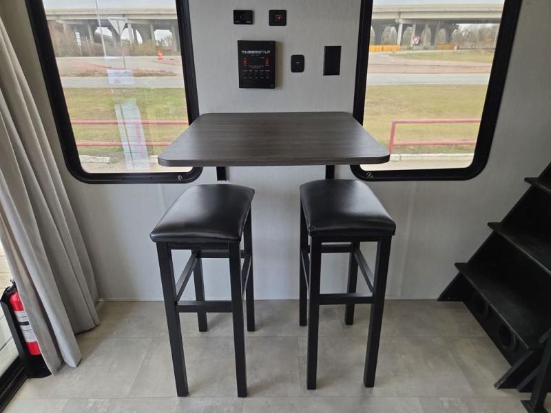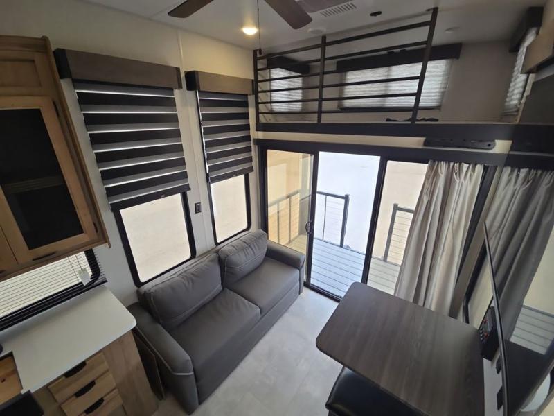 This model is similar to Timberwolf 16ML but larger! A bigger bathroom, king bed in the lower master, and two queen bunk mats in the upper loft. There is an 18 cu. ft. refrigerator so you can stock up for a week long vacation. There is also a sofa that can transform into added sleeping for guests, and there is a high top table that can collapse against the wall with two stools which is perfect for snacks or a game, but can also be out of the way when you don't need it. A ladder allows access into the upper front loft that is over the covered patio. The bathroom below is split with a shower on one side, and a private toilet area and sink opposite. And the view is amazing from just about anywhere inside.