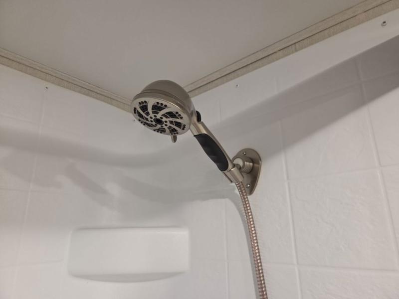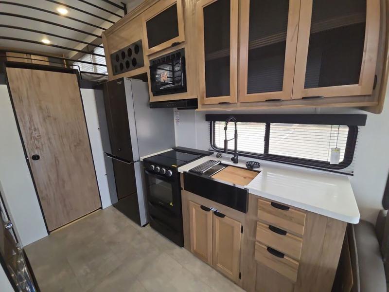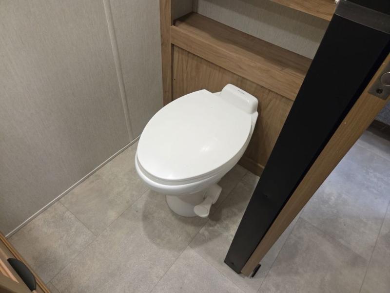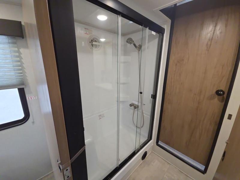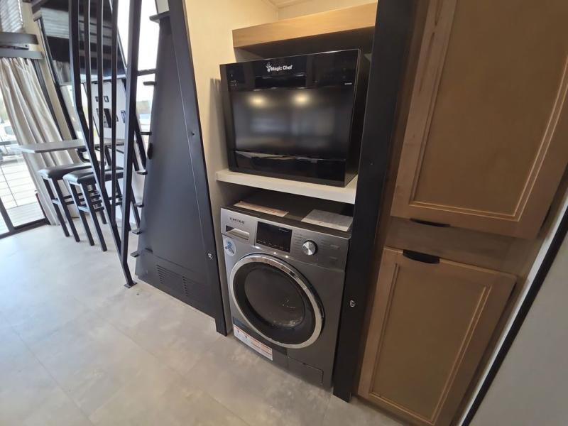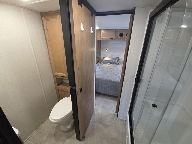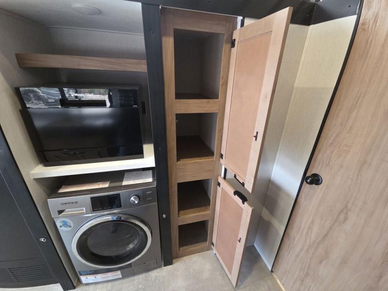 This model is similar to Timberwolf 16ML but larger! A bigger bathroom, king bed in the lower master, and two queen bunk mats in the upper loft. There is an 18 cu. ft. refrigerator so you can stock up for a week long vacation. There is also a sofa that can transform into added sleeping for guests, and there is a high top table that can collapse against the wall with two stools which is perfect for snacks or a game, but can also be out of the way when you don't need it. A ladder allows access into the upper front loft that is over the covered patio. The bathroom below is split with a shower on one side, and a private toilet area and sink opposite. And the view is amazing from just about anywhere inside.