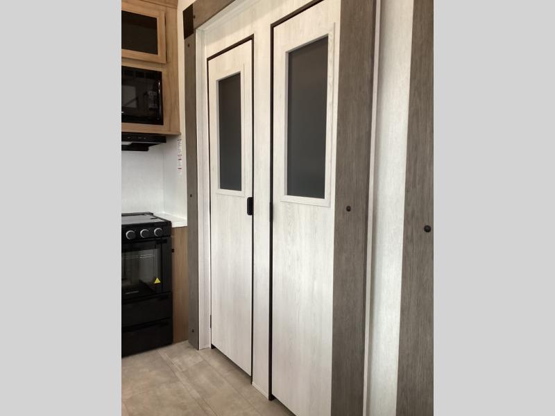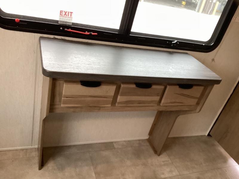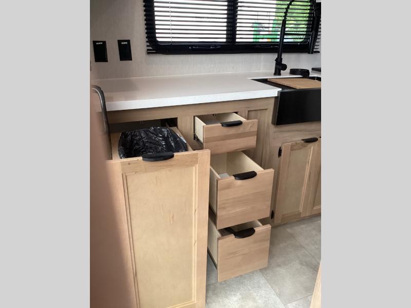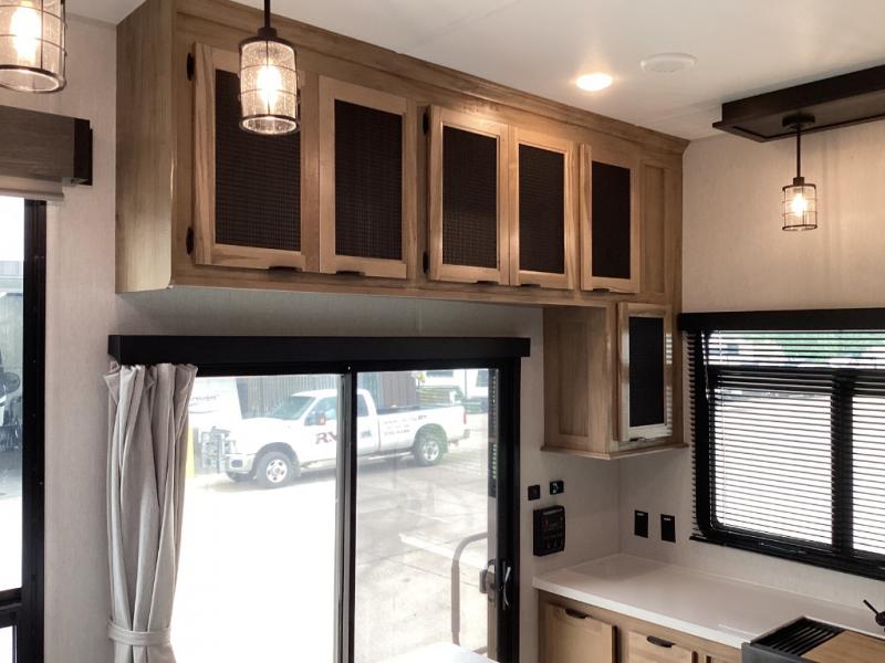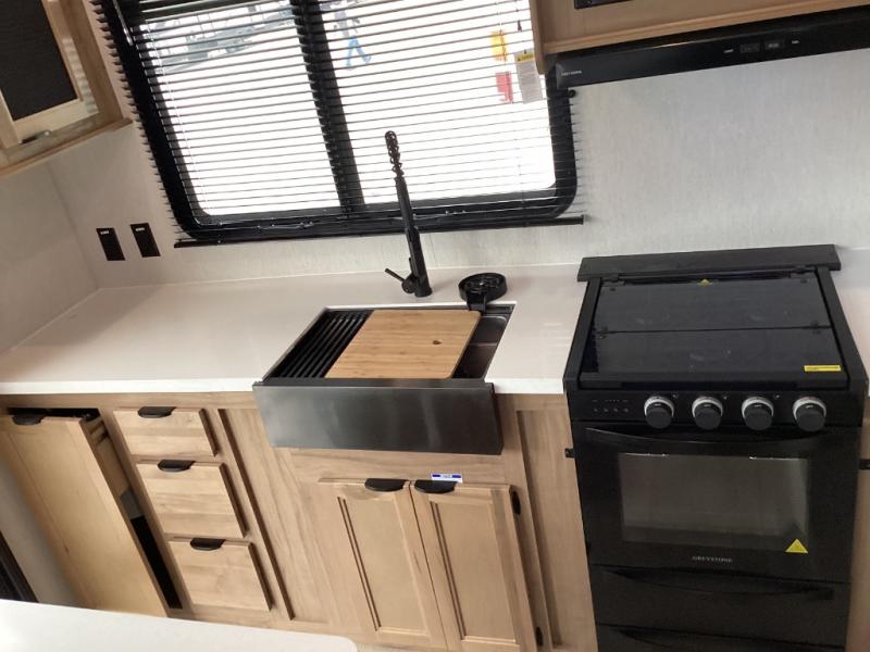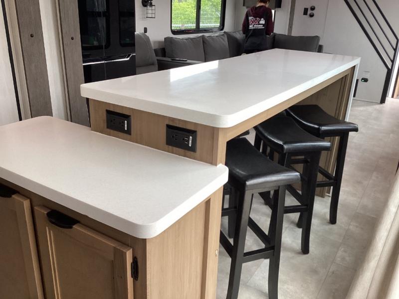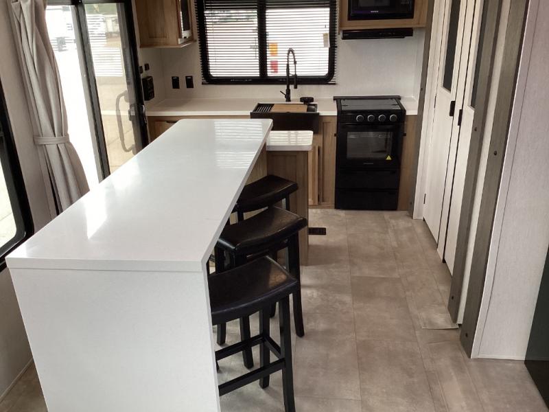 Rear kitchen layout with a kitchen island, ideal for meal prep, storage, and gathering with friends or family. Bish's RV+1
