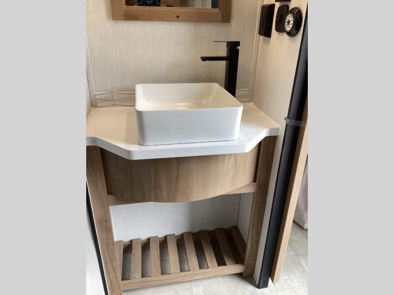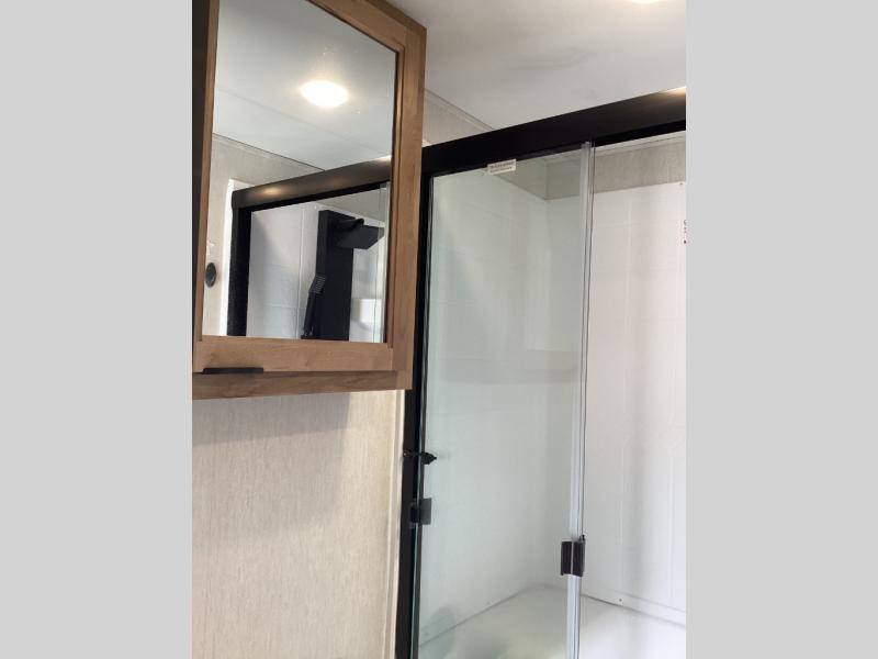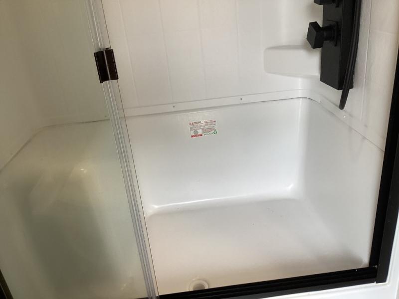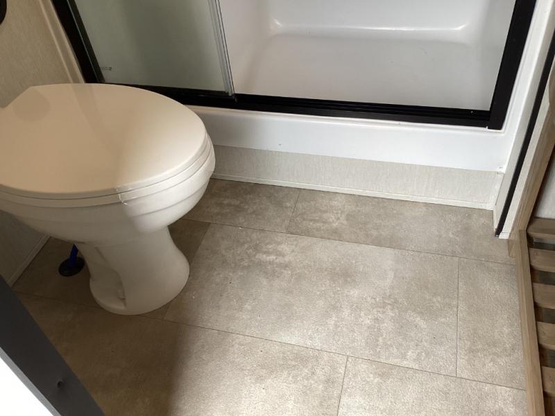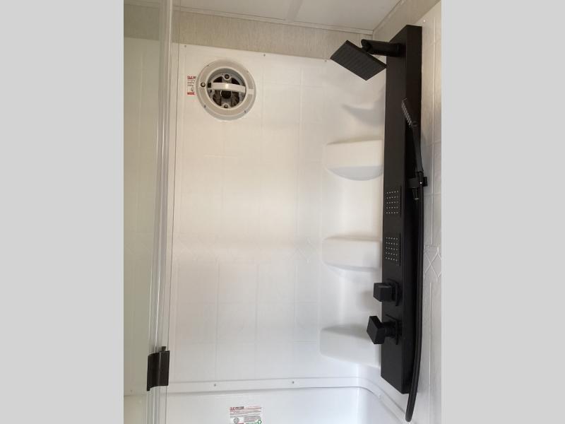 Spacious and well-appointed bathroom with seat, plus residential-style comfort, lighting, and blackout blinds. Bish's RV+1