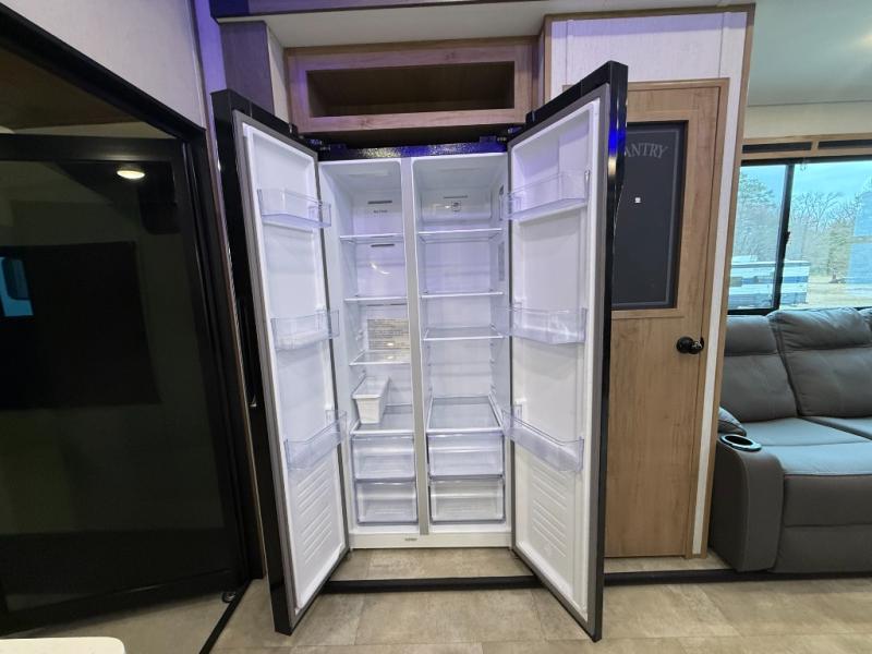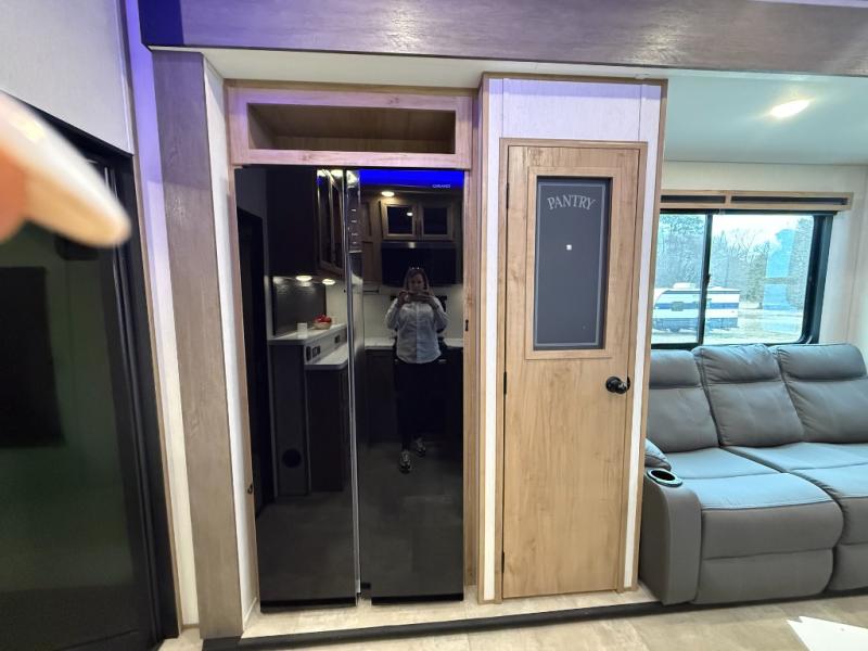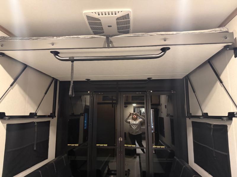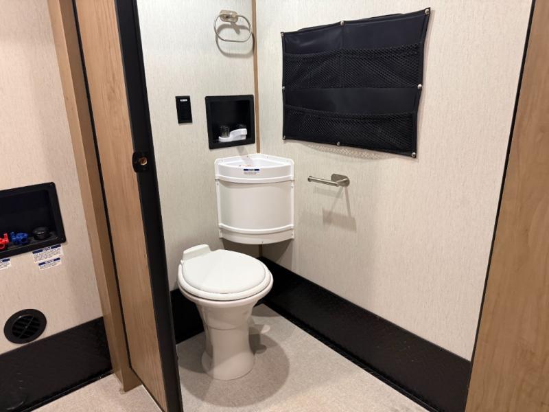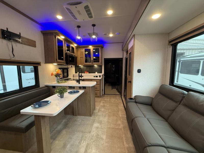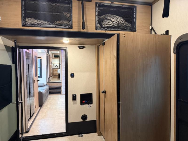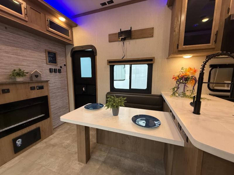 With dual entry doors, you will experience a smooth flow of traffic in and out of this fifth wheel toy hauler! The middle kitchen/living area is set up perfectly for the chef to prepare a delicious meal while others socialize with them at the dinette with a bench seat or from the sofa. You could even prepare breakfast at the outdoor kitchen to enjoy the beautiful sunrise. The 13' garage area has opposing flip-up sofas with a table in between and a raised queen bed above, as well as a loft and a half bathroom. The front private bedroom offers a king bed for a good night's rest, a wardrobe/dresser slide, and an entrance into the bathroom which can also be accessed from the hall!