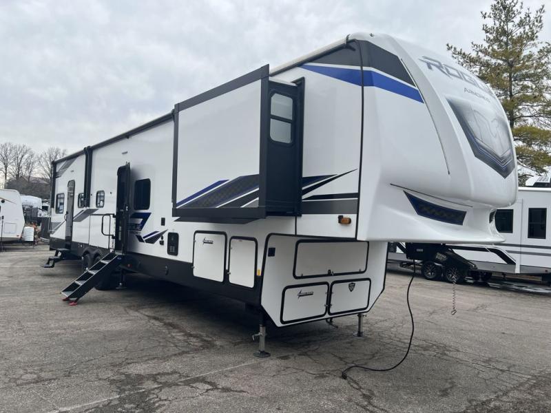 Every one of these Forest River Vengeance Rogue Armored fifth wheel toy haulers come with the features you want most at an affordable price tag! The DuraPoxy gas/oil resistant floor has 5,000 lb. tie downs to ensure your toys will arrive safely without damaging the flooring, plus the 3,000 lb. rated ramp door makes it easy to load them. Two 15,000 BTU A/Cs are "Super H Ducted" to keep you cool even on the hottest summer days, and an enclosed and heated underbelly keeps your unit's vitals protected all year long. The Rogue Armored package comes with a six point leveling system, a comfort plus adjustable powered king bed system, and a ramp door patio rail system. There are also two additional packages packed with features to make camping hassle-free!