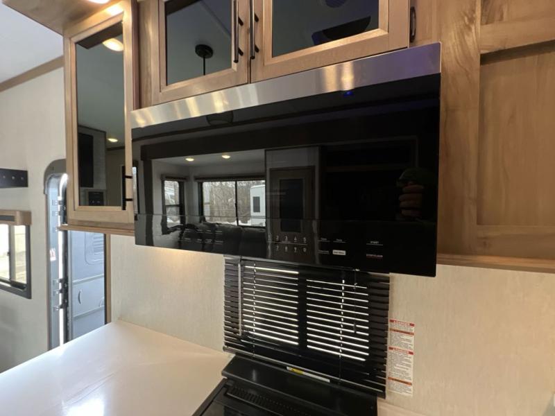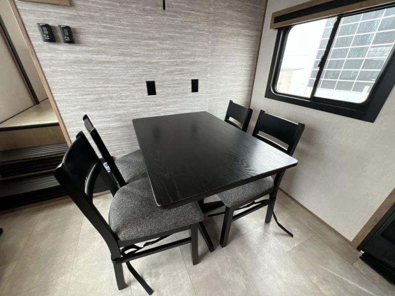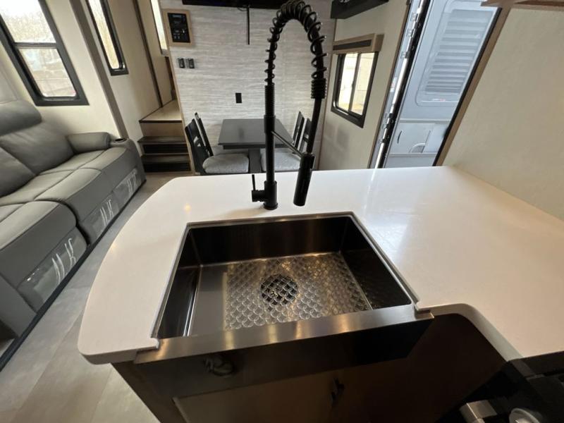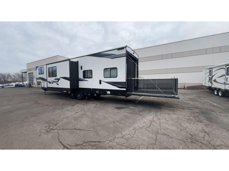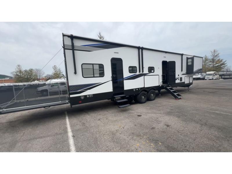 It won't be hard to find comforts throughout this toy hauler with a front master bedroom, a separate garage for guests and toys, and an outside kitchen! There are also two power awnings outdoors and two entry doors to make entering easier than ever. The main living area includes a sofa slide out, a free-standing table with chairs, plus a U-shaped kitchen the chef is sure to enjoy. Everyone can stay fresh each day thanks to the spacious dual entry bath, and you'll have the front master bedroom all to yourselves. Here, you'll find a king bed slide out, a front wardrobe, and a dresser to keep your clothes tidy!