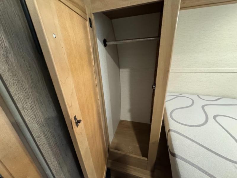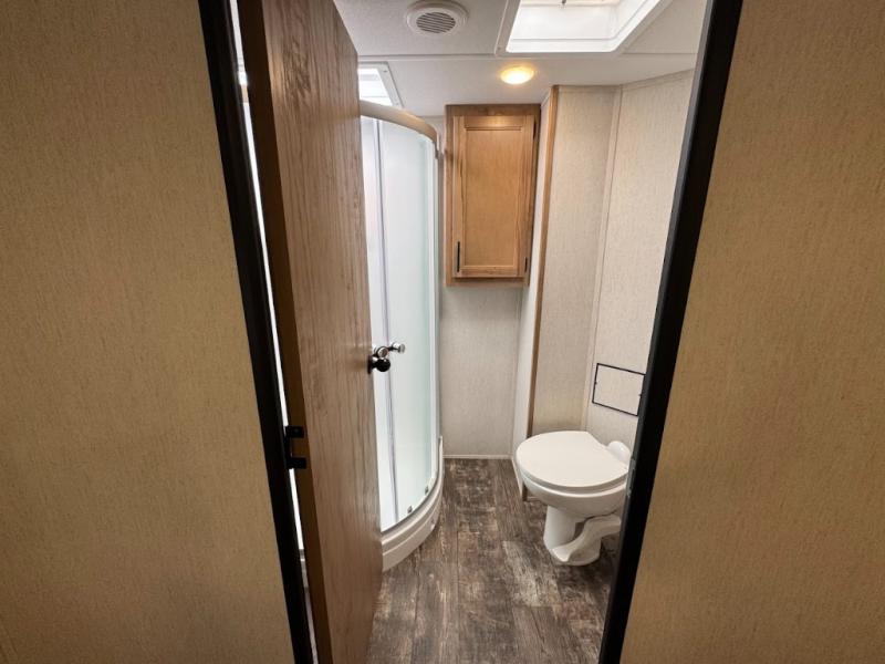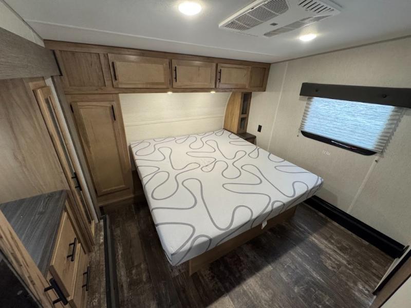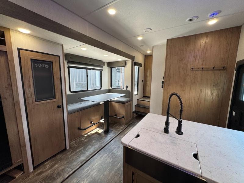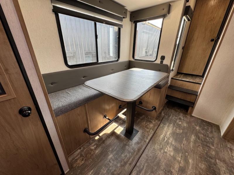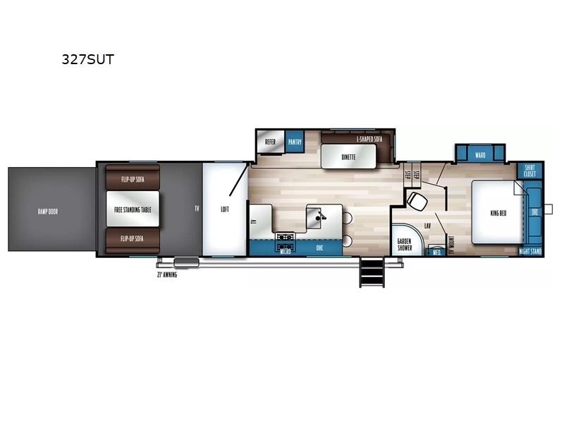 You'll love every minute spent in this spacious toy hauler. Once your toys are unloaded using the ramp door, relax on the dual flip-up sofas in the separate garage that also includes a free-standing table. There is also a loft here for more sleeping space or storage space, plus a TV to keep your guests entertained. Head to the main living/kitchen area to make a meal on the cooktop, dine at the L-shaped dinette, or visit with a friend on the counter with barstools. The front master bedroom will feel just like home with its king bed, wardrobe slide out, plus quick and easy access to the dual entry bath!