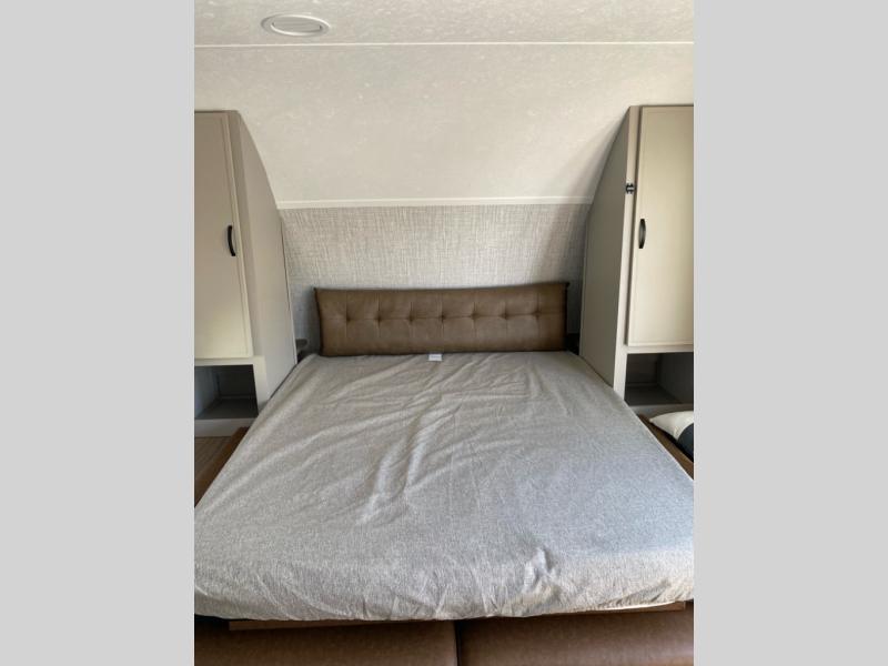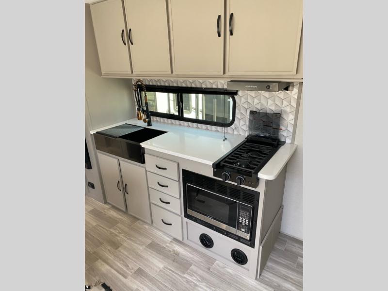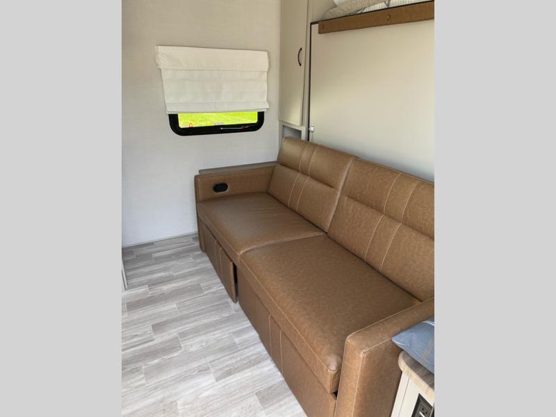 You will love camping every other weekend in this spacious travel trailer for three to four. There is a full rear bath with a spacious shower and medicine cabinet for your toiletries. You can relax on the jackknife sofa during the day and at night transform it into a Murphy bed. Easily prepare your meals in the kitchen on the three burner cooktop or in the oven. There is also an upgraded 10.7 cu. ft. residential refrigerator, plus a convection microwave oven for meals on the go. The bar top with two stools is the perfect place to enjoy your meals as you have a flip-open window to let in some fresh air. This model also includes an outside kitchen with an induction cooktop, a 14' power awning, plus an outside spray port for convenience!