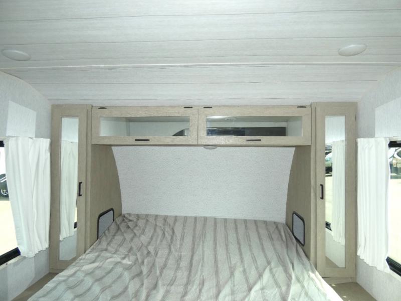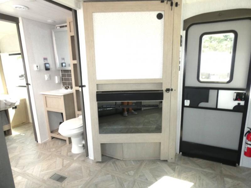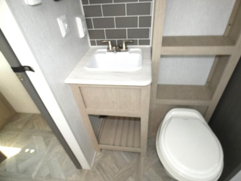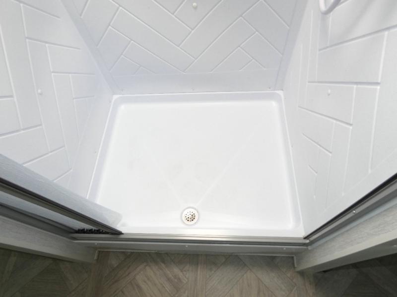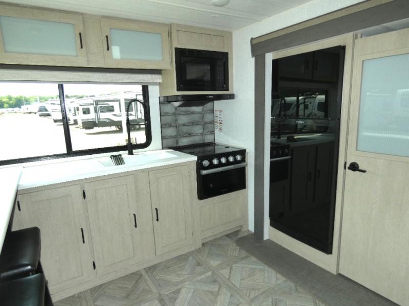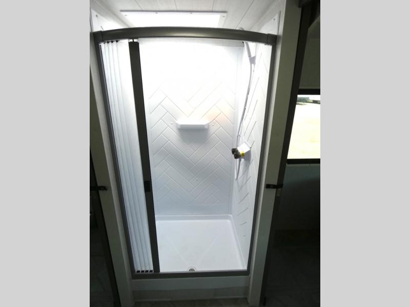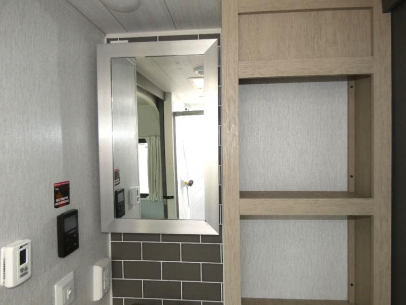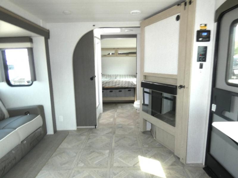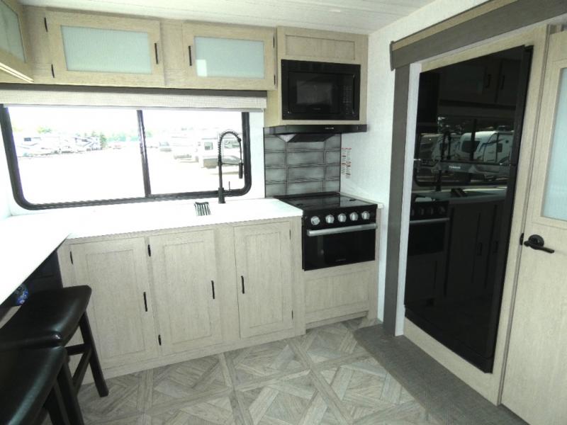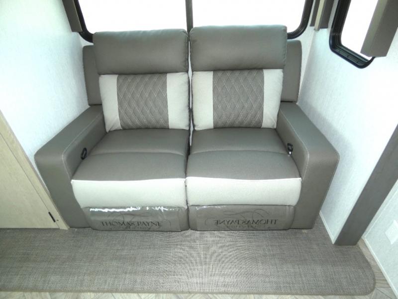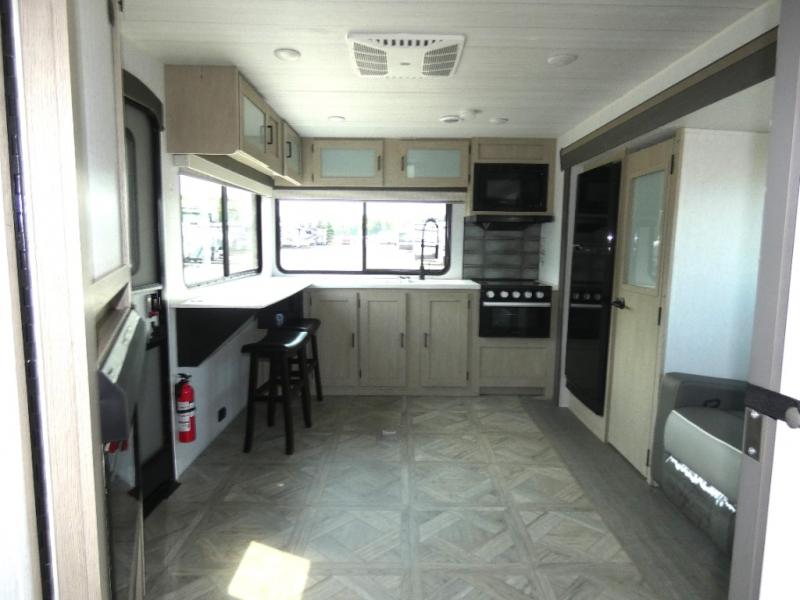 You're going to love cooking in the rear kitchen of this travel trailer! It has everything you need to prepare delicious home cooked meals including a large pantry and oversized fridge, plus there are two bar stools to sit on while you enjoy them. The theater seating is conveniently across from the swiveling entertainment center which has hidden shelves behind it for your games and movies. As you walk through the bathroom, you will notice a walk-in shower to the left and a toilet and sink to the right. It leads directly into the front private bedroom which has a Versa-Tilt custom king bed to lay your head on at night and wardrobes/nightstands on either side for your items!