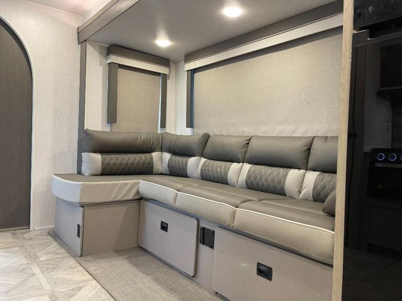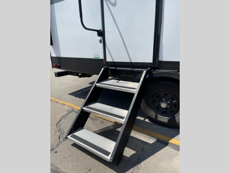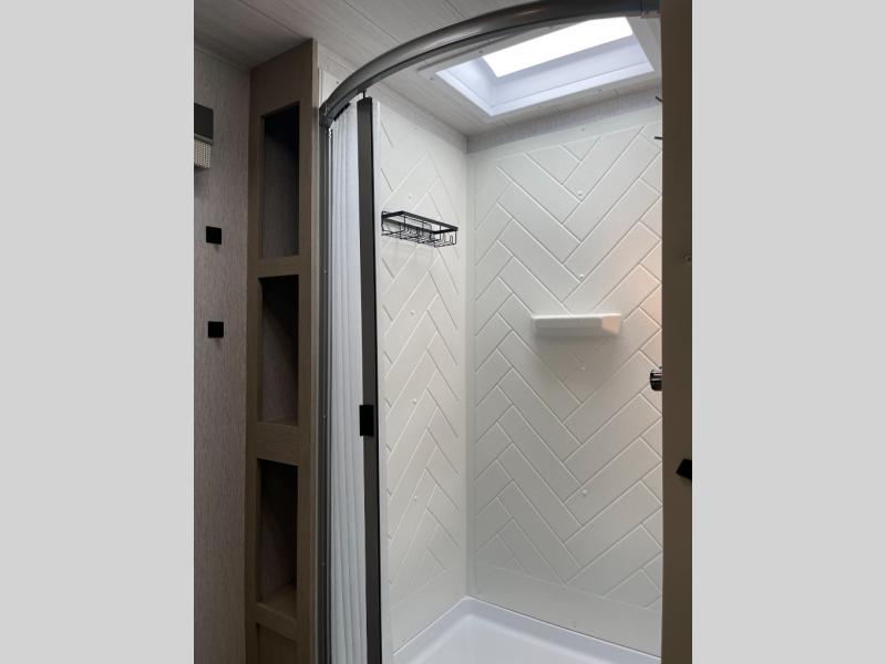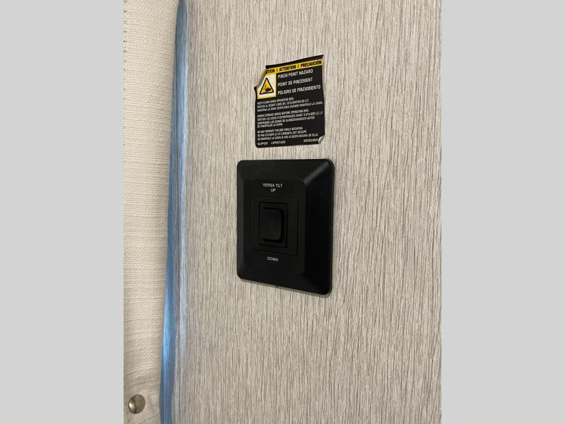 As you escape to the beautiful countryside, or embark across the country to visit family, you'll find that the modern amenities found in this Wildwood travel trailer will deliver the ultimate enjoyment all along the way! Relax on an 8' chaise lounge that includes a table in front so that you can enjoy your morning coffee. When you are ready to face the day ahead, you can grab a towel from the linen closet in the rear bathroom and enjoy the walk-in shower before heading out for a day full of adventure. At night, a custom king bed with Versa-Tilt for a great night's rest. You will appreciate the pass-through storage, entertainment center with fireplace, and walk-in pantry for all the goodies!