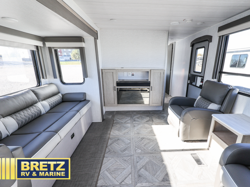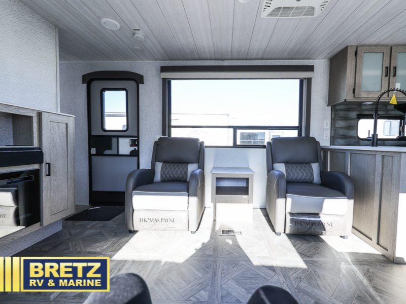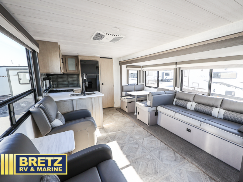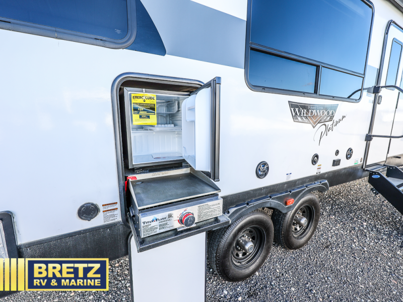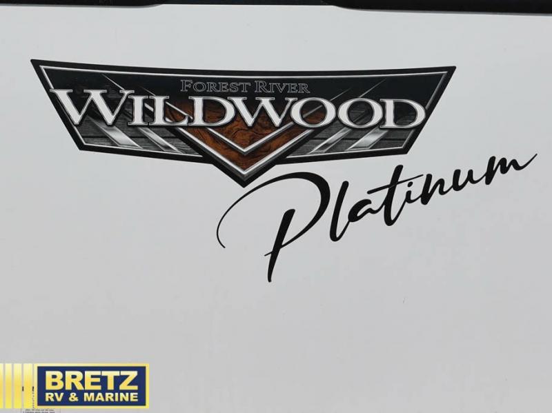 This Wildwood Platinum travel trailer is perfect for your family of five looking for a new adventure. You will enjoy the rear kitchen that includes an oversized refrigerator and a three-burner cooktop. The booth dinette within the slide out is perfect for enjoying meals, and when you're through, you can relax on the sofa. Both of these pieces of furniture are a part of the Versa Lounge which allows you to customize their function by moving the middle section to create a larger sofa or a larger dinette. This unit also includes two lounge chairs, so you'll feel right at home! You'll love the full bath in this unit, and the custom king bed in the private bedroom is perfect for a good night's rest.