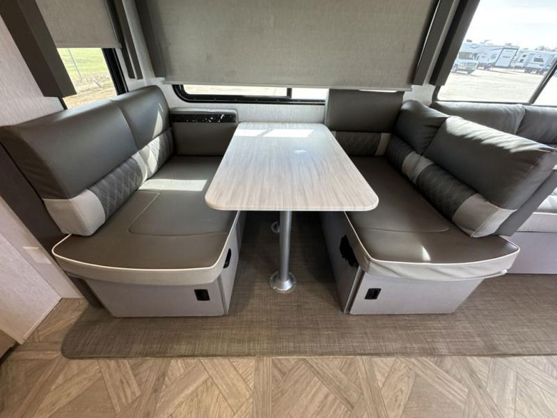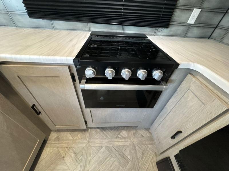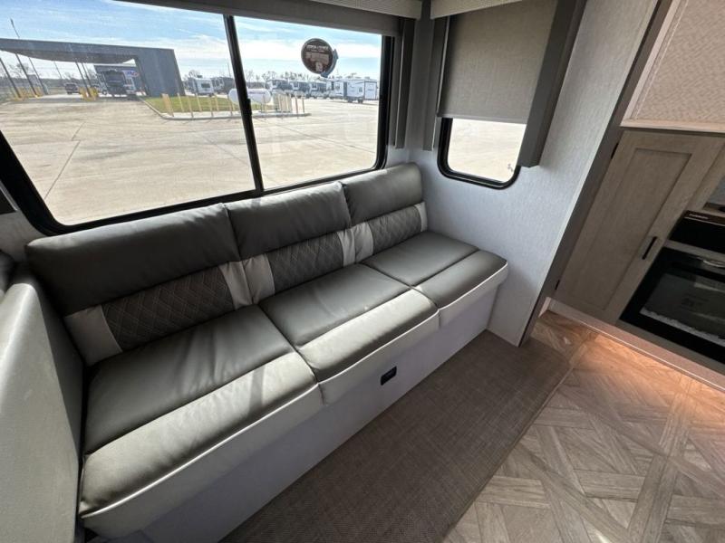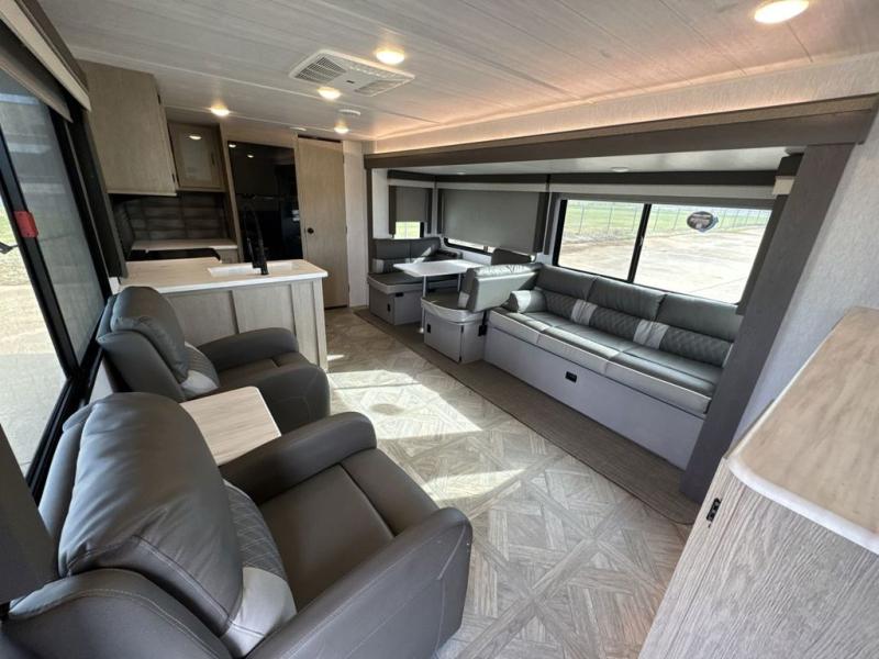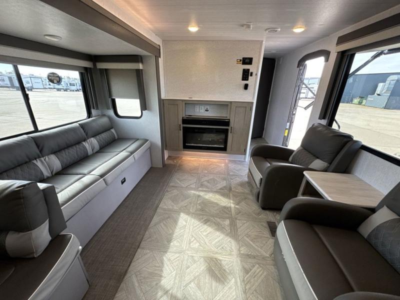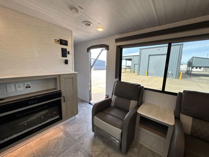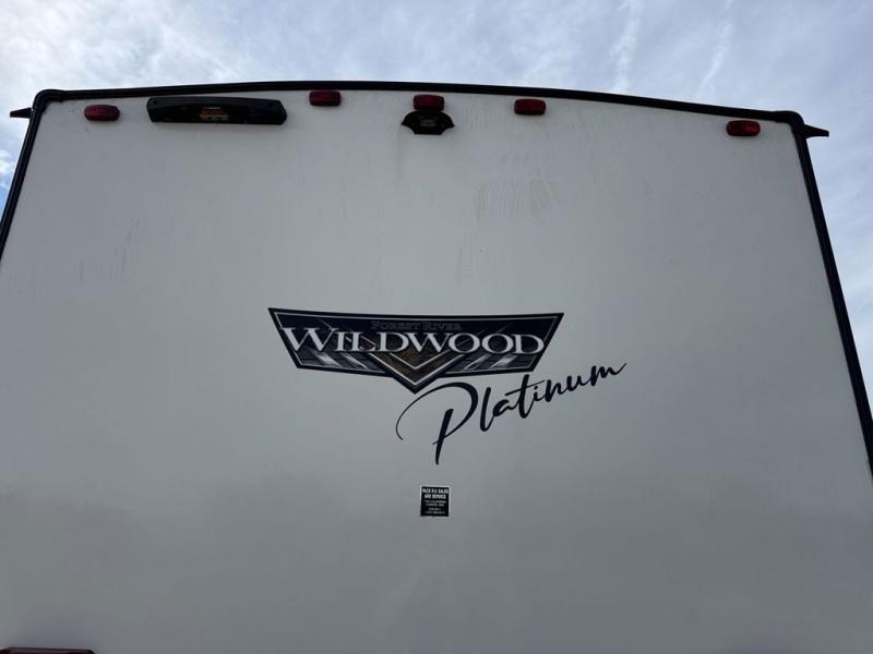 This Wildwood Platinum travel trailer is perfect for your family of five looking for a new adventure. You will enjoy the rear kitchen that includes an oversized refrigerator and a three-burner cooktop. The booth dinette within the slide out is perfect for enjoying meals, and when you're through, you can relax on the sofa. Both of these pieces of furniture are a part of the Versa Lounge which allows you to customize their function by moving the middle section to create a larger sofa or a larger dinette. This unit also includes two lounge chairs, so you'll feel right at home! You'll love the full bath in this unit, and the custom king bed in the private bedroom is perfect for a good night's rest.