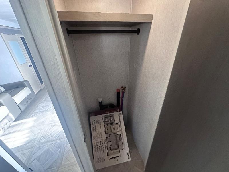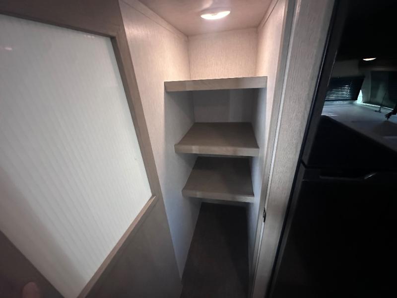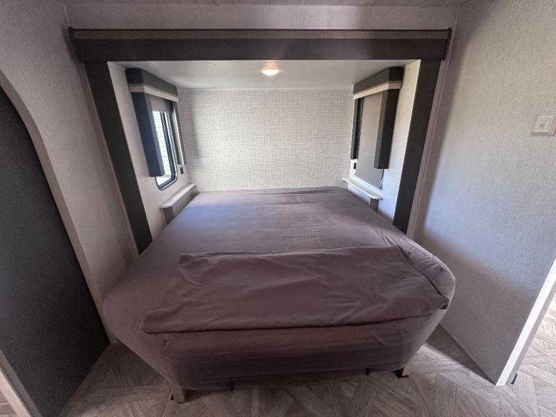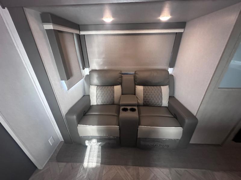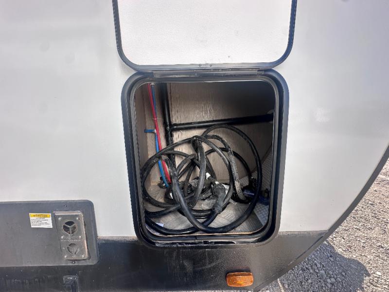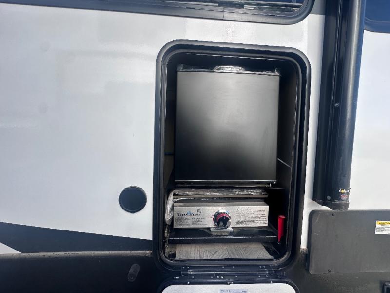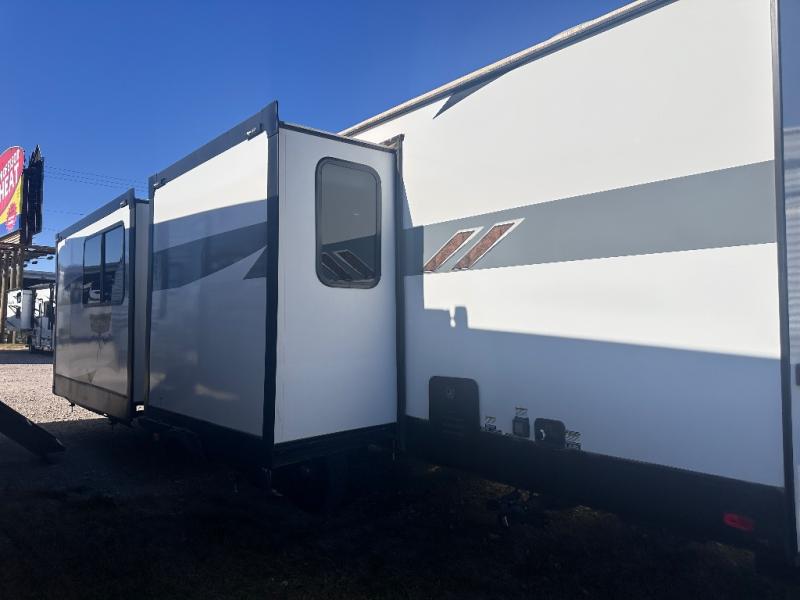 Grab your honey or your best camping friend for fun weekends in this travel trailer. There are two slide outs providing you with more space to relax, plus a front kitchen with ample counter space. The bar top with stools will provide a place to dine each morning, and the theater seat will be perfect for relaxing in the evenings. The middle master bedroom includes a custom king bed with Versa Tilt, a desk with TV prep above where you can work away from home if needed, and even a closet with washer and dryer prep if you plan to go RVing full-time! This model also includes a spacious full rear bath with its own exterior entry door, a walk-in shower, a linen closet for clean towels, and recessed storage for necessities. Don't overlook the exterior with its camp kitchen, 20' awning, and Versa garage for luggage, fishing poles, and more!
