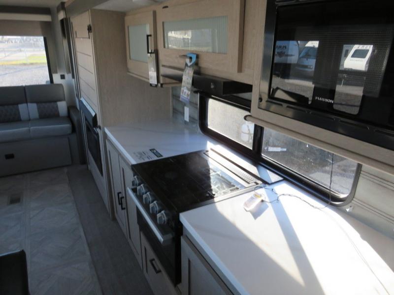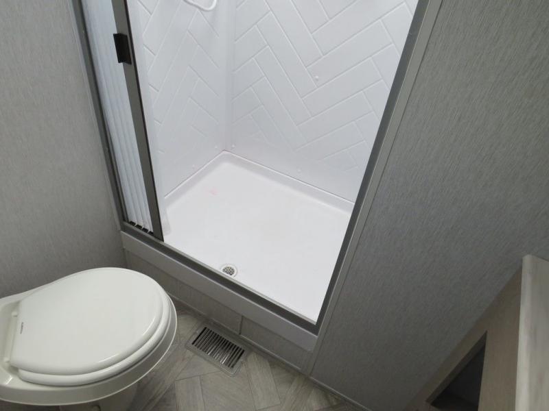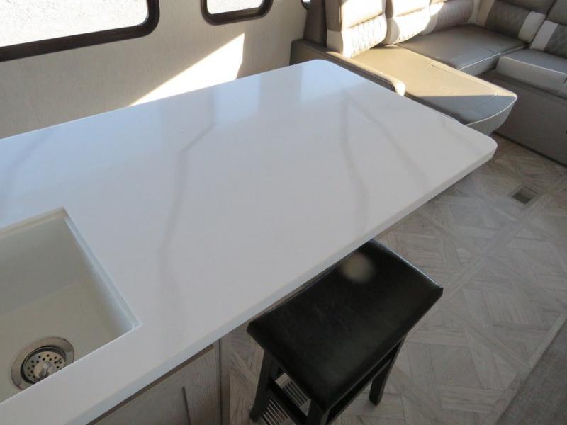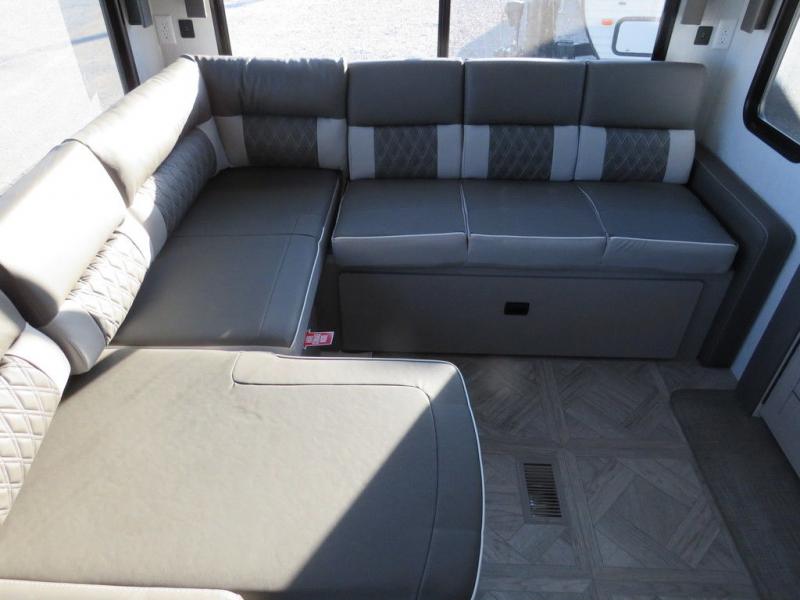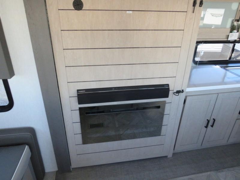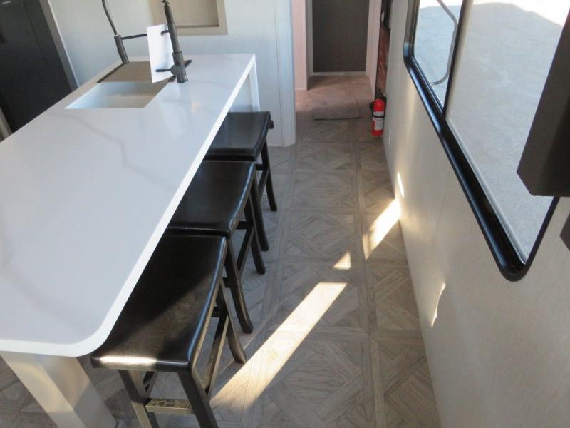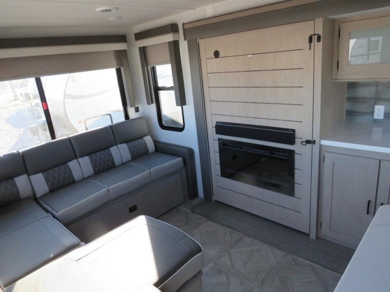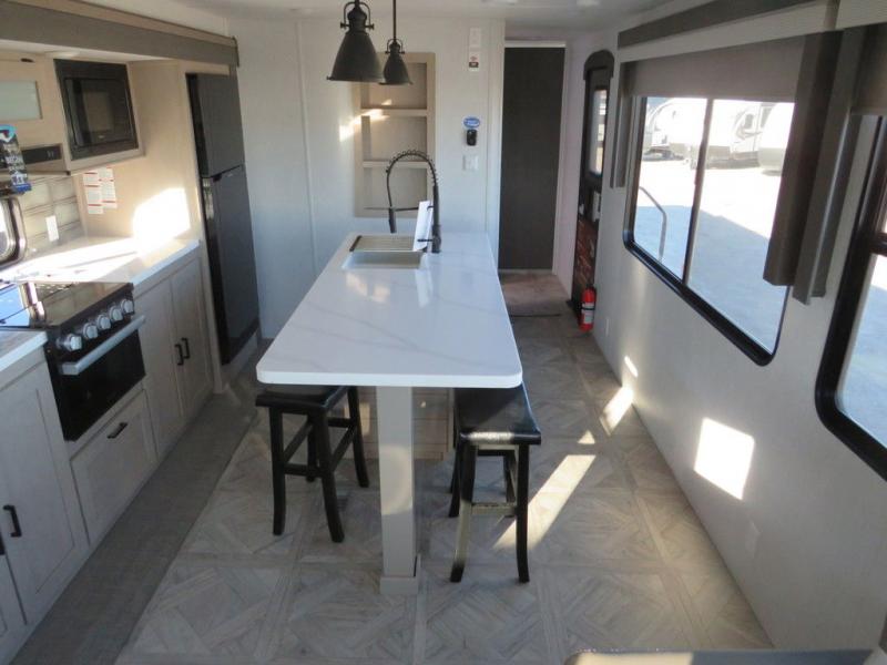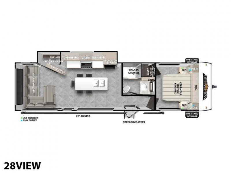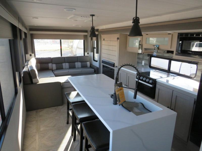 The perfect couple's coach with a view! This Wildwood View features a 7' kitchen island and five bar stools for dining and prep space. The island also houses a double kitchen sink for easy clean-up. Thanks to the island, you will enjoy 15 linear feet of countertop space throughout. The view will be of your choosing thanks to 95.5 square feet of windows that will easily bring the outdoors inside. A sectional sofa across the back of the unit provides ample seating to relax and enjoy a good book or the entertainment center. Behind the entertainment center, you will find hidden storage space with shelves so everything can be tucked out of sight, and an oversized refrigerator will provide enough space for your perishables while you are on vacation as well. A full bath is conveniently located near the main entry featuring StepAbove entry steps leading inside. The bath provides a walk-in shower, vanity with sink, toilet, and linen storage. In the private front bedroom, a Versa-Tilt custom king bed will allow you a relaxing and comfortable night's rest, and once again, a great view out the dual opposing windows. On the outside, a 23' awning offers additional living space protected from the elements, and a spacious pass-through storage compartment will allow you to stow away your camp chairs and outdoor equipment and games easily for transport.