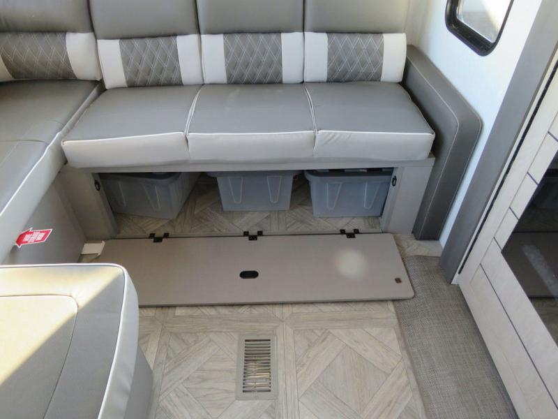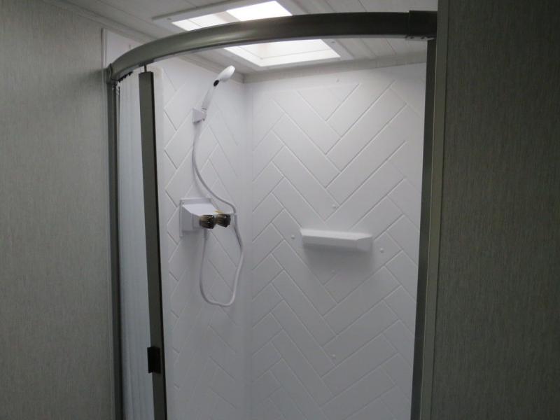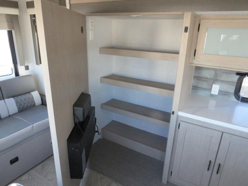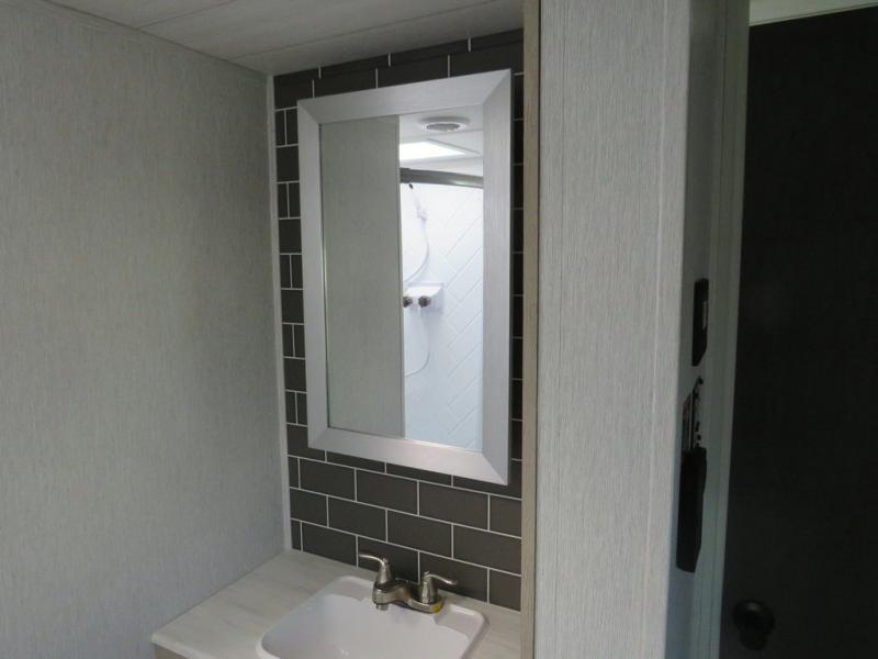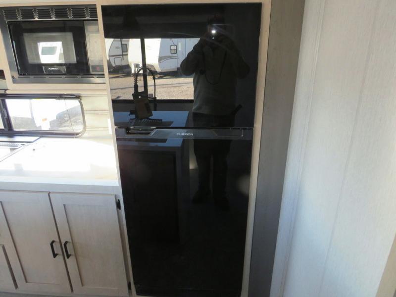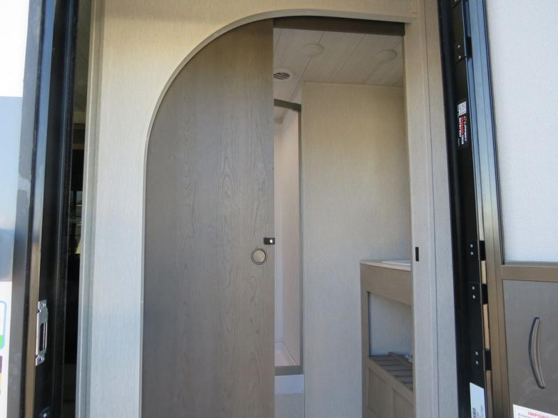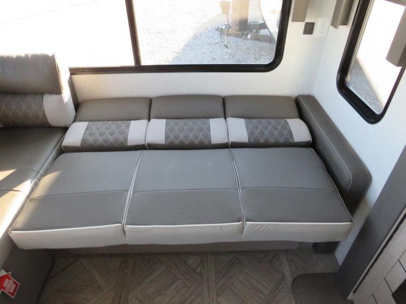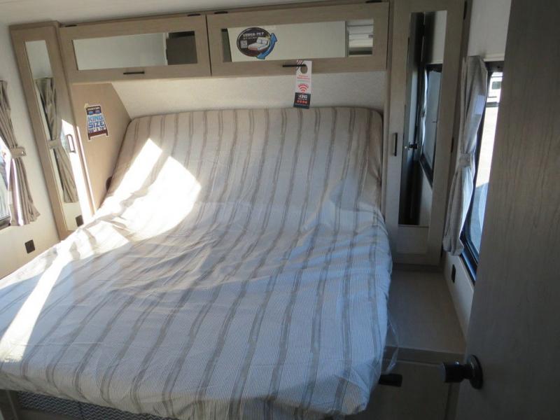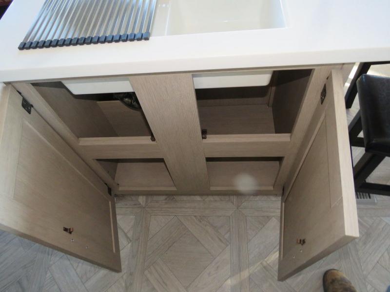 The perfect couple's coach with a view! This Wildwood View features a 7' kitchen island and five bar stools for dining and prep space. The island also houses a double kitchen sink for easy clean-up. Thanks to the island, you will enjoy 15 linear feet of countertop space throughout. The view will be of your choosing thanks to 95.5 square feet of windows that will easily bring the outdoors inside. A sectional sofa across the back of the unit provides ample seating to relax and enjoy a good book or the entertainment center. Behind the entertainment center, you will find hidden storage space with shelves so everything can be tucked out of sight, and an oversized refrigerator will provide enough space for your perishables while you are on vacation as well. A full bath is conveniently located near the main entry featuring StepAbove entry steps leading inside. The bath provides a walk-in shower, vanity with sink, toilet, and linen storage. In the private front bedroom, a Versa-Tilt custom king bed will allow you a relaxing and comfortable night's rest, and once again, a great view out the dual opposing windows. On the outside, a 23' awning offers additional living space protected from the elements, and a spacious pass-through storage compartment will allow you to stow away your camp chairs and outdoor equipment and games easily for transport.