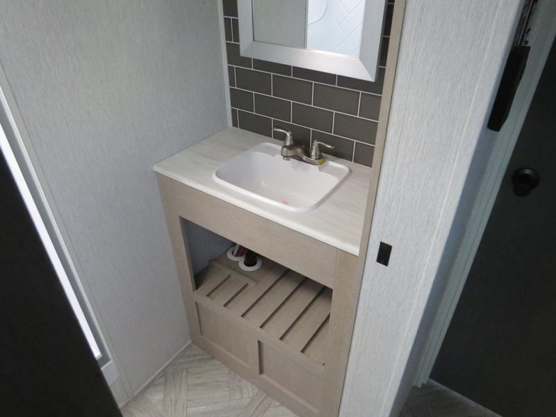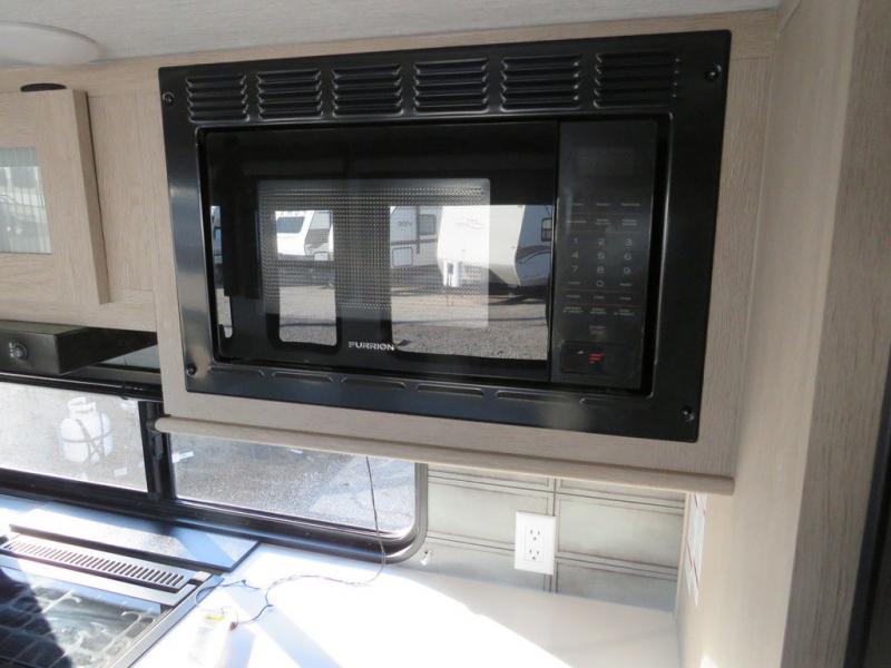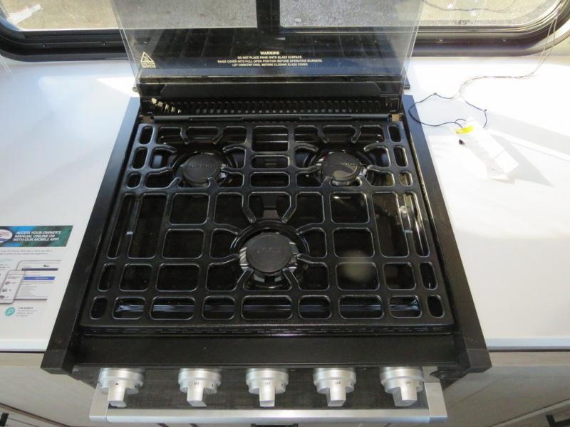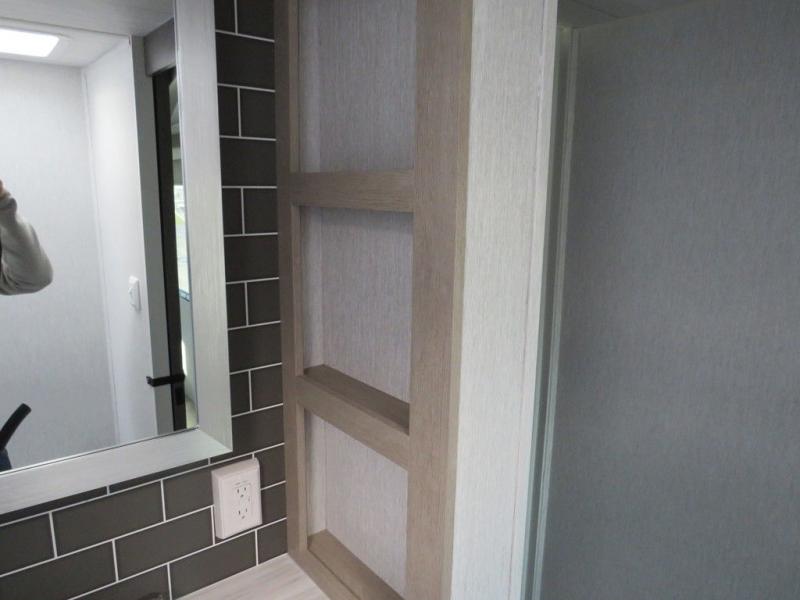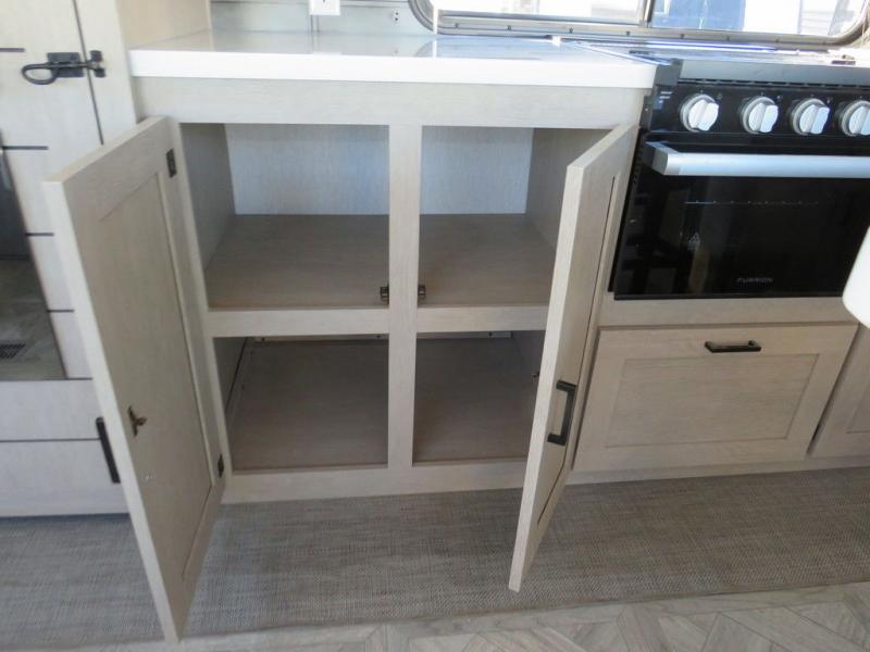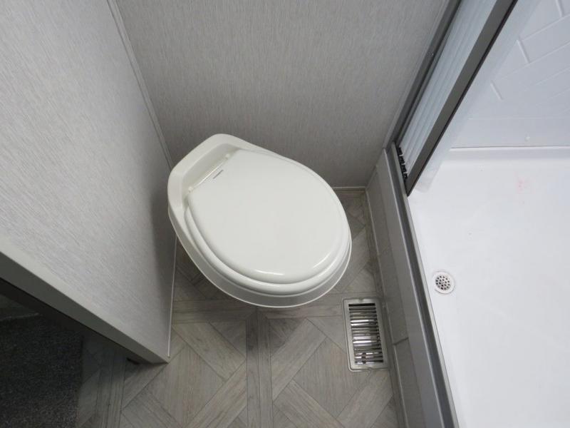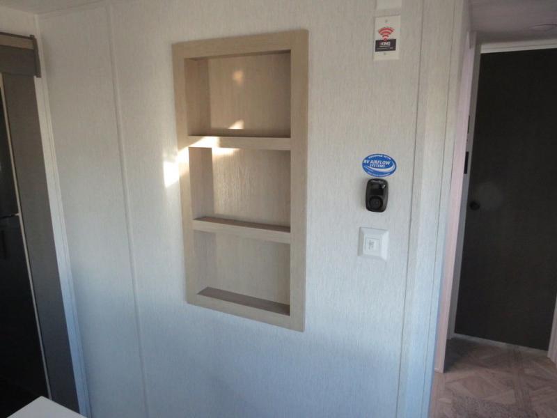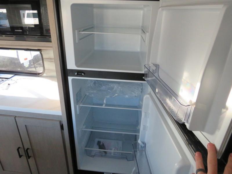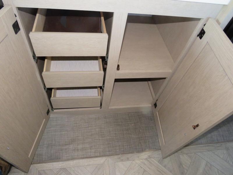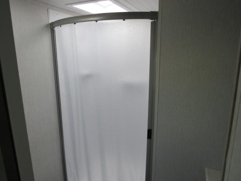 The perfect couple's coach with a view! This Wildwood View features a 7' kitchen island and five bar stools for dining and prep space. The island also houses a double kitchen sink for easy clean-up. Thanks to the island, you will enjoy 15 linear feet of countertop space throughout. The view will be of your choosing thanks to 95.5 square feet of windows that will easily bring the outdoors inside. A sectional sofa across the back of the unit provides ample seating to relax and enjoy a good book or the entertainment center. Behind the entertainment center, you will find hidden storage space with shelves so everything can be tucked out of sight, and an oversized refrigerator will provide enough space for your perishables while you are on vacation as well. A full bath is conveniently located near the main entry featuring StepAbove entry steps leading inside. The bath provides a walk-in shower, vanity with sink, toilet, and linen storage. In the private front bedroom, a Versa-Tilt custom king bed will allow you a relaxing and comfortable night's rest, and once again, a great view out the dual opposing windows. On the outside, a 23' awning offers additional living space protected from the elements, and a spacious pass-through storage compartment will allow you to stow away your camp chairs and outdoor equipment and games easily for transport.