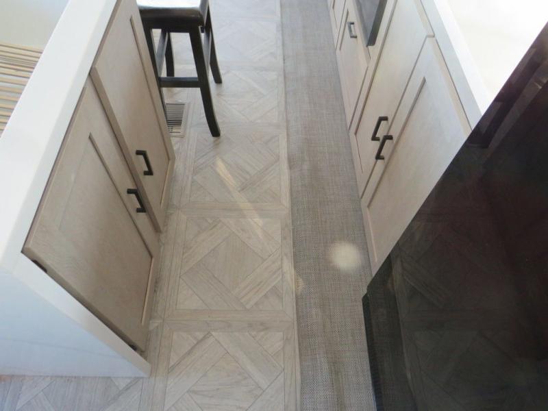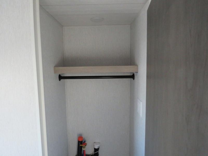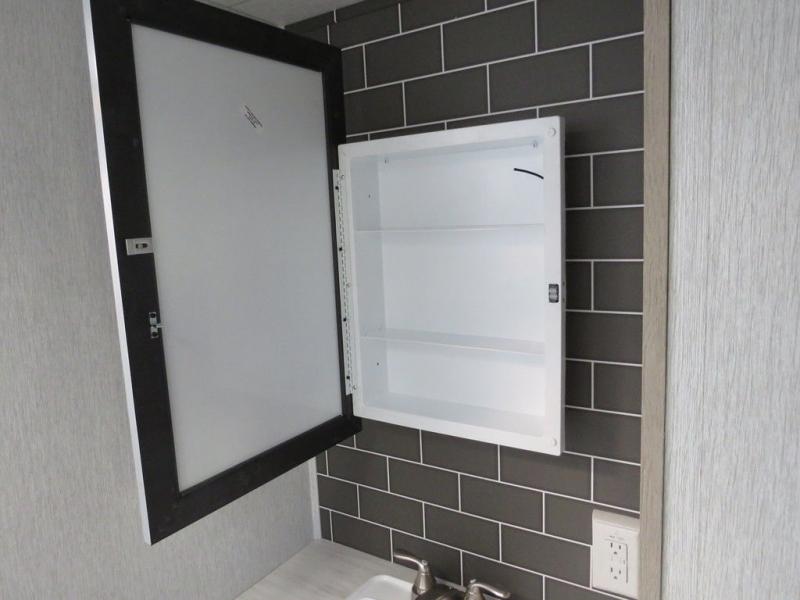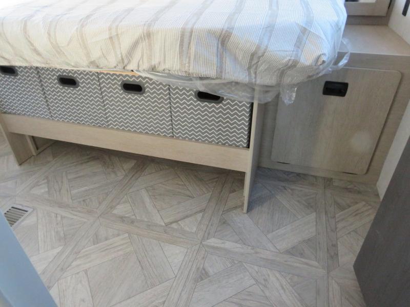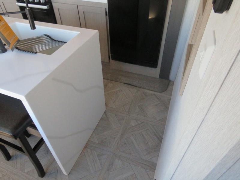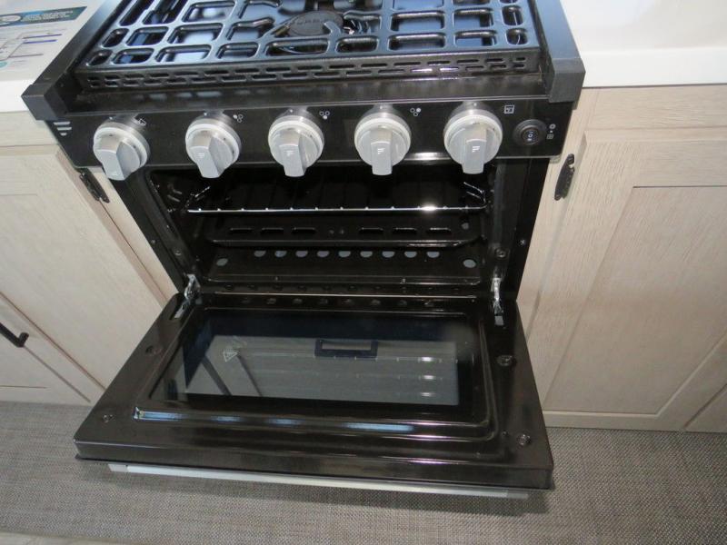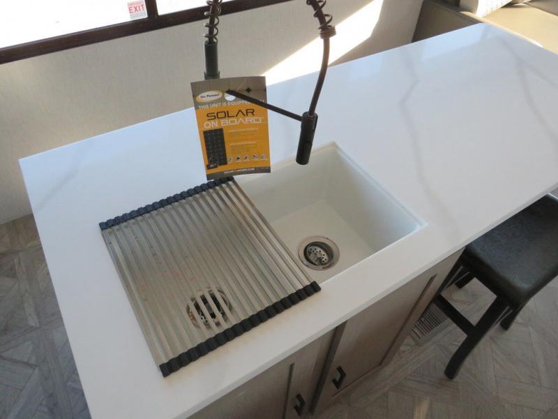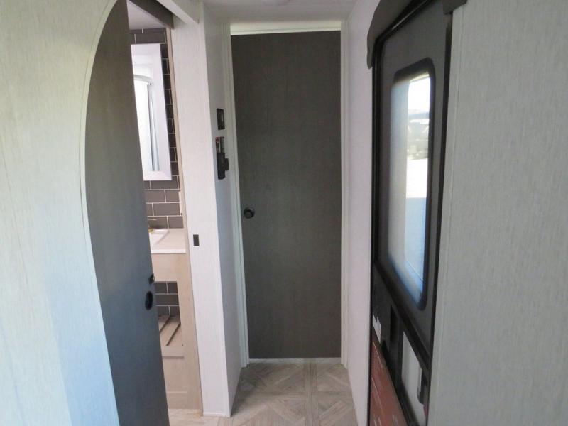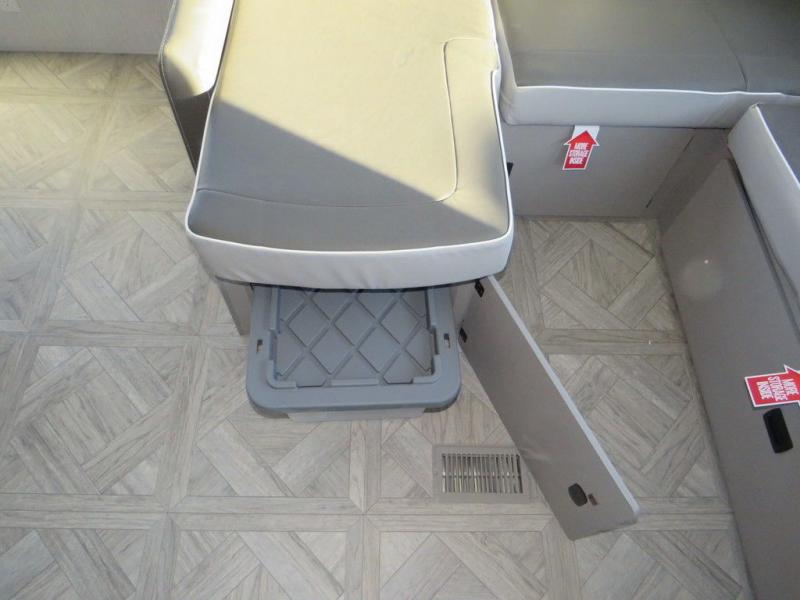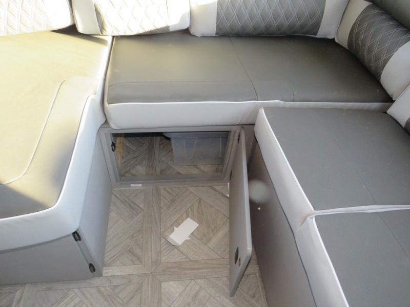 The perfect couple's coach with a view! This Wildwood View features a 7' kitchen island and five bar stools for dining and prep space. The island also houses a double kitchen sink for easy clean-up. Thanks to the island, you will enjoy 15 linear feet of countertop space throughout. The view will be of your choosing thanks to 95.5 square feet of windows that will easily bring the outdoors inside. A sectional sofa across the back of the unit provides ample seating to relax and enjoy a good book or the entertainment center. Behind the entertainment center, you will find hidden storage space with shelves so everything can be tucked out of sight, and an oversized refrigerator will provide enough space for your perishables while you are on vacation as well. A full bath is conveniently located near the main entry featuring StepAbove entry steps leading inside. The bath provides a walk-in shower, vanity with sink, toilet, and linen storage. In the private front bedroom, a Versa-Tilt custom king bed will allow you a relaxing and comfortable night's rest, and once again, a great view out the dual opposing windows. On the outside, a 23' awning offers additional living space protected from the elements, and a spacious pass-through storage compartment will allow you to stow away your camp chairs and outdoor equipment and games easily for transport.