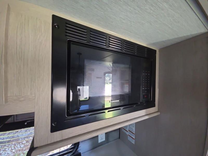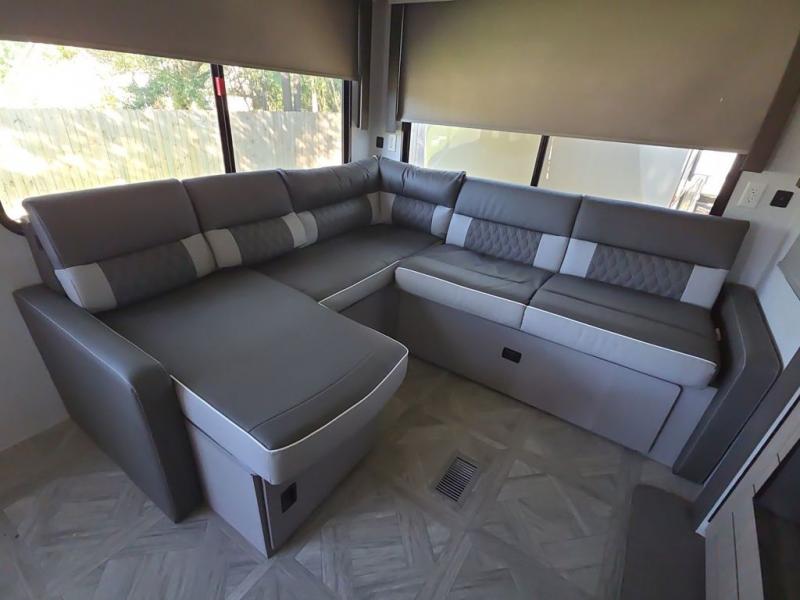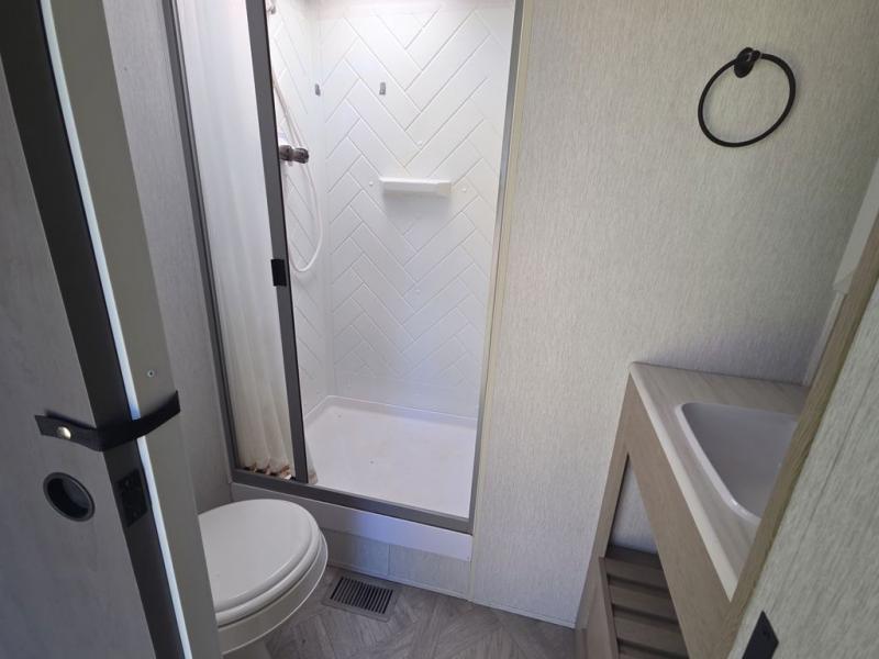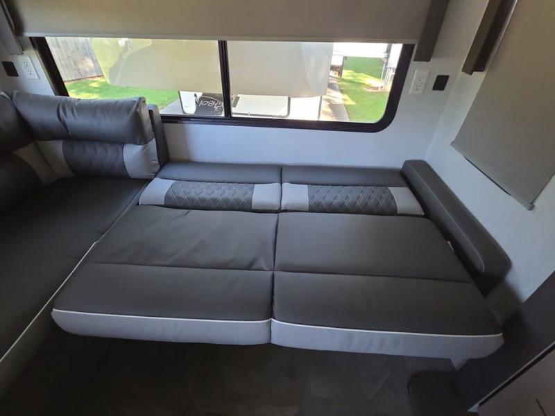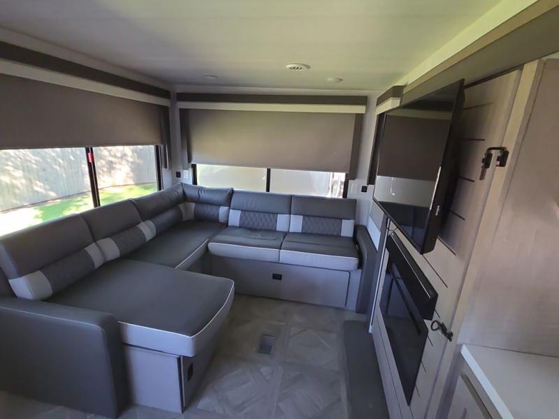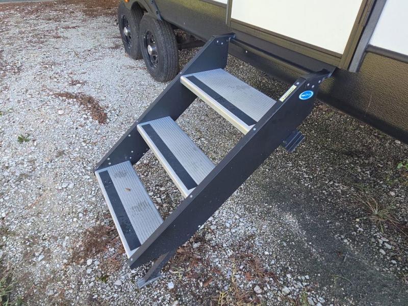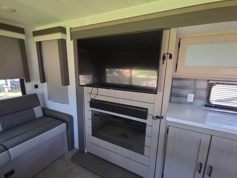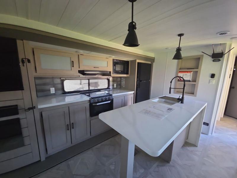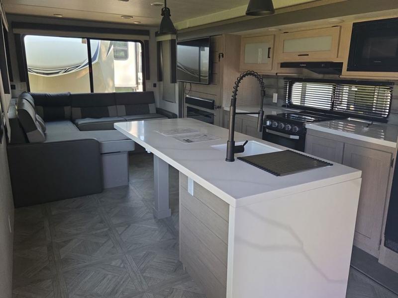 The perfect couple's coach with a view! This Wildwood View features a 7' kitchen island and five bar stools for dining and prep space. The island also houses a double kitchen sink for easy clean-up. Thanks to the island, you will enjoy 15 linear feet of countertop space throughout. The view will be of your choosing thanks to 95.5 square feet of windows that will easily bring the outdoors inside. A sectional sofa across the back of the unit provides ample seating to relax and enjoy a good book or the entertainment center. Behind the entertainment center, you will find hidden storage space with shelves so everything can be tucked out of sight, and an oversized refrigerator will provide enough space for your perishables while you are on vacation as well. A full bath is conveniently located near the main entry featuring StepAbove entry steps leading inside. The bath provides a walk-in shower, vanity with sink, toilet, and linen storage. In the private front bedroom, a Versa-Tilt custom king bed will allow you a relaxing and comfortable night's rest, and once again, a great view out the dual opposing windows. On the outside, a 23' awning offers additional living space protected from the elements, and a spacious pass-through storage compartment will allow you to stow away your camp chairs and outdoor equipment and games easily for transport.