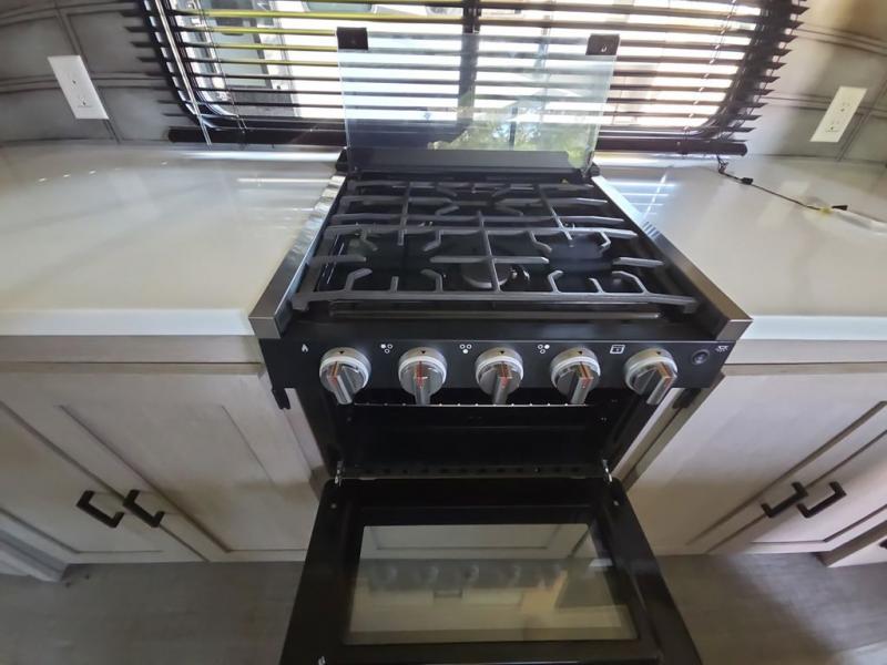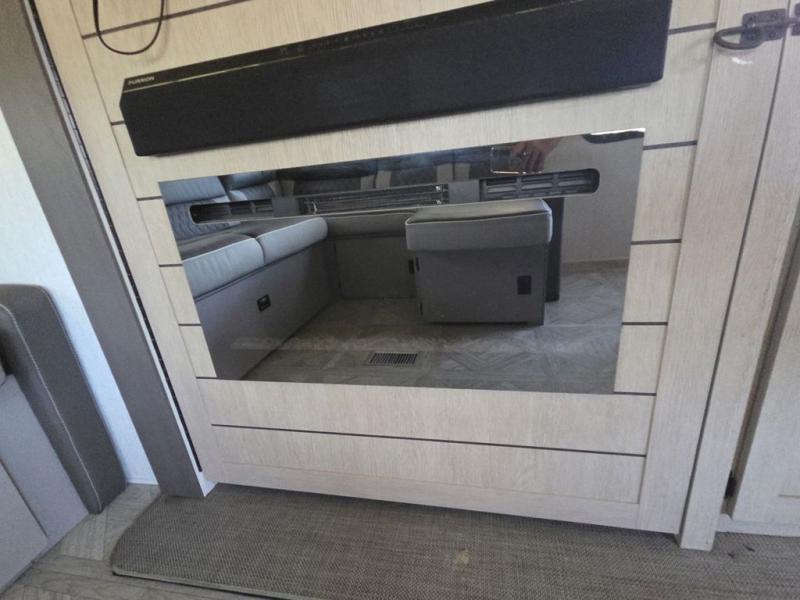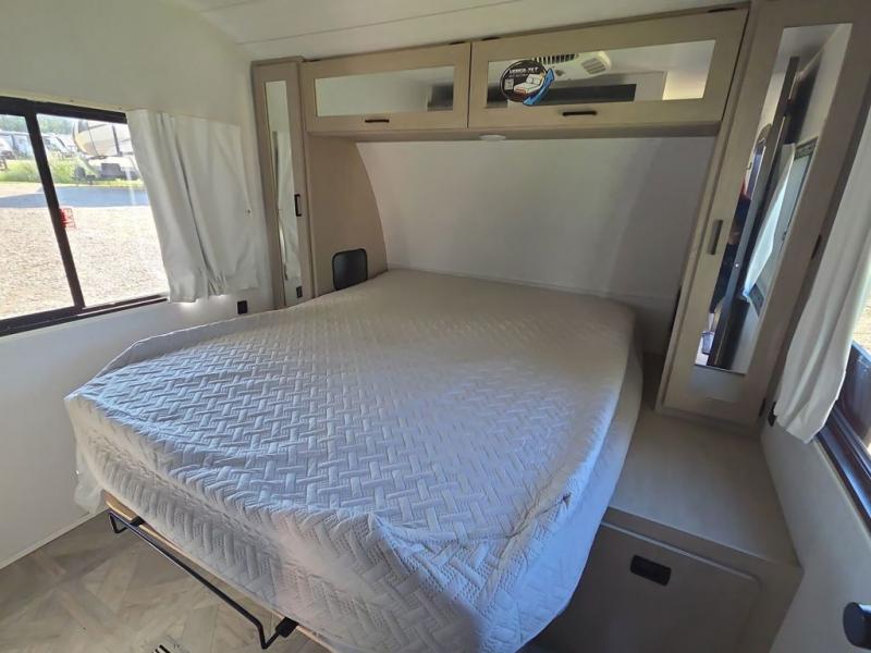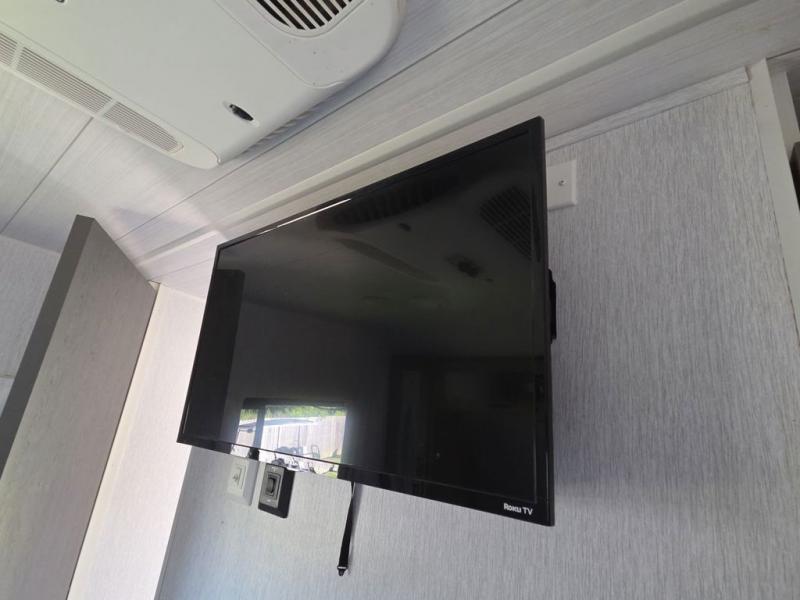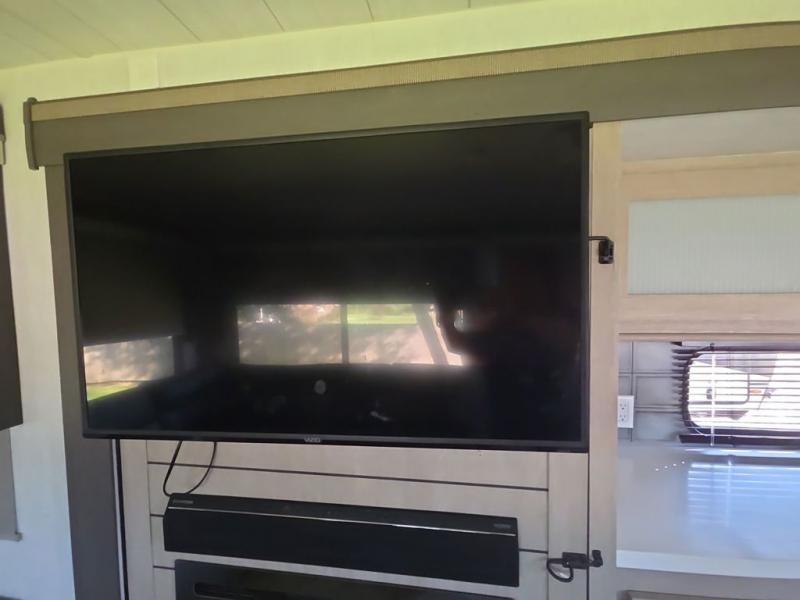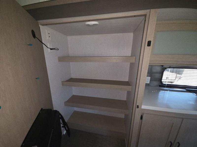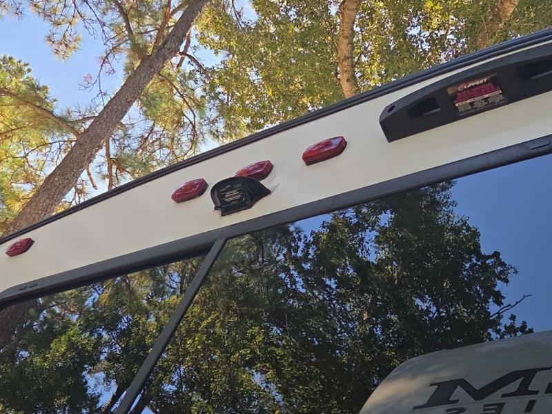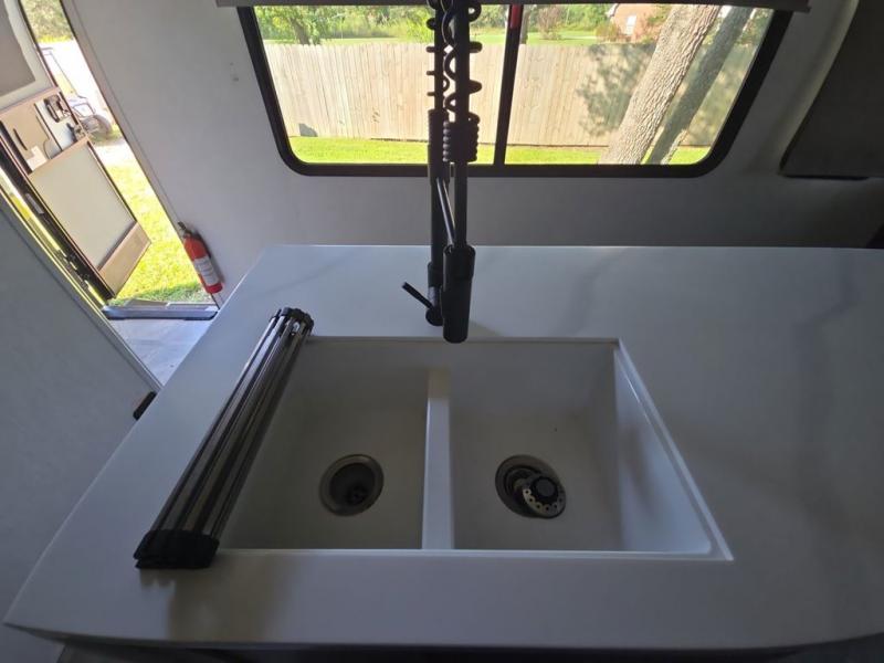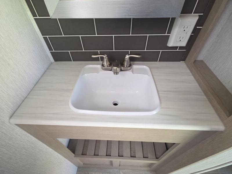 The perfect couple's coach with a view! This Wildwood View features a 7' kitchen island and five bar stools for dining and prep space. The island also houses a double kitchen sink for easy clean-up. Thanks to the island, you will enjoy 15 linear feet of countertop space throughout. The view will be of your choosing thanks to 95.5 square feet of windows that will easily bring the outdoors inside. A sectional sofa across the back of the unit provides ample seating to relax and enjoy a good book or the entertainment center. Behind the entertainment center, you will find hidden storage space with shelves so everything can be tucked out of sight, and an oversized refrigerator will provide enough space for your perishables while you are on vacation as well. A full bath is conveniently located near the main entry featuring StepAbove entry steps leading inside. The bath provides a walk-in shower, vanity with sink, toilet, and linen storage. In the private front bedroom, a Versa-Tilt custom king bed will allow you a relaxing and comfortable night's rest, and once again, a great view out the dual opposing windows. On the outside, a 23' awning offers additional living space protected from the elements, and a spacious pass-through storage compartment will allow you to stow away your camp chairs and outdoor equipment and games easily for transport.