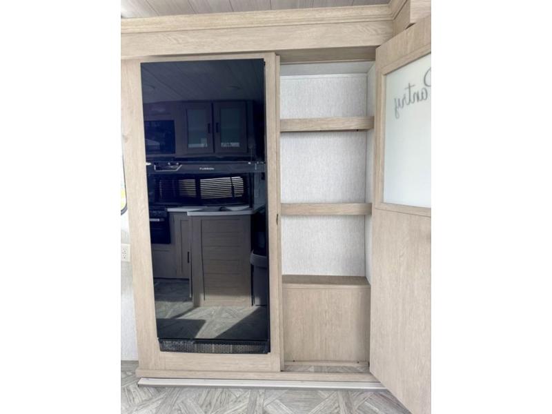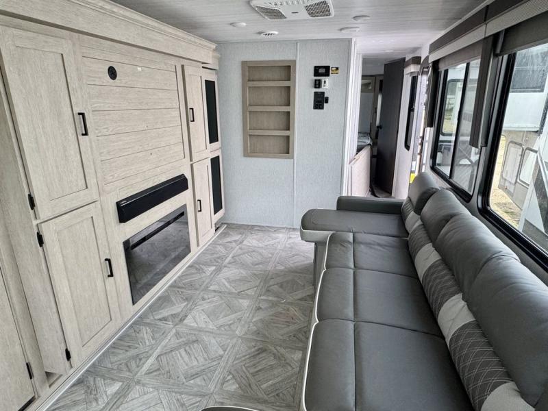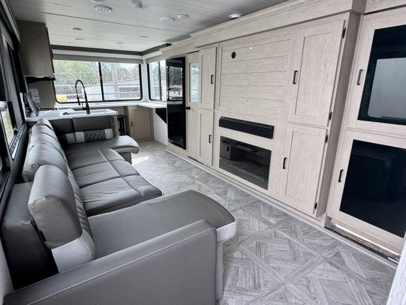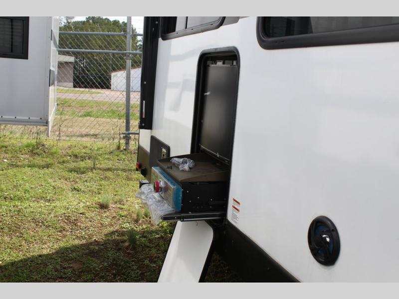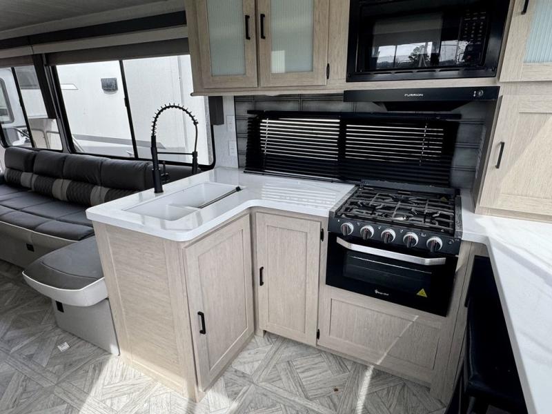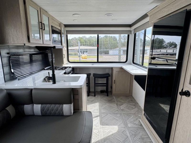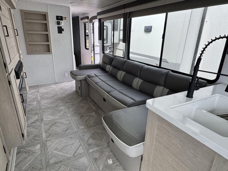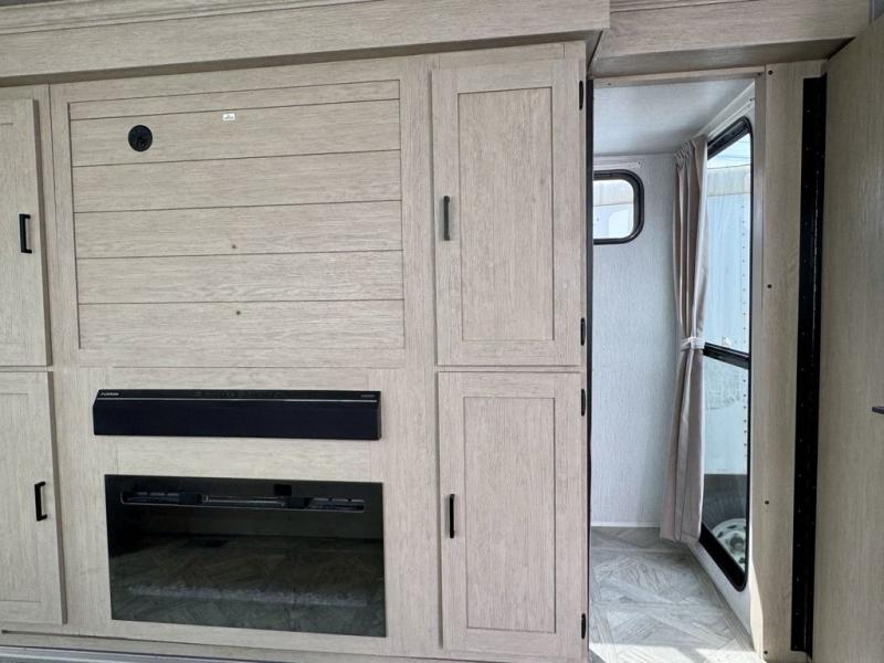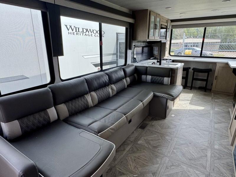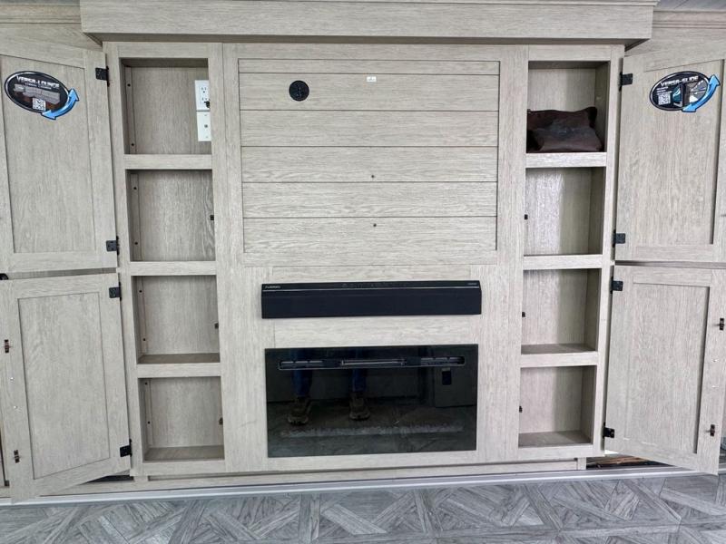 Your family of four or will enjoy this Wildwood View bunk model featuring 105 square feet of window space for unbelievable views of your surroundings. The Versa Slide features a refrigerator, pantry, and entertainment center with a door leading to a bunk space including a 30" x 70" flip-up bunk with a mattress pad below, storage cubbies for your things, and a desk with bar stool for any office work that you may need to do while you travel. All is neatly tucked away within the slide behind an entertainment wall with fireplace opposite the sectional sofa which is great for relaxing and entertaining family and friends indoors. The rear kitchen area offers 18 linear feet of countertop space with four bar stools, plus a three burner range and double sink. Your refrigerator and pantry will hold all of your perishables and dry goods, and those are nearby within the Versa slide. Up front, a private bedroom with Versa-Tilt custom king bed which provides 14-1/2" of additional walking around space, plus you will find a wardrobe that has been prepped for a washer and dryer if you choose to add, as well as dual nightstands beneath wardrobes on either side of the bed. A large pass-through storage compartment offers plenty of storage for your outdoor gear, and if you enjoy outdoor cooking, you might want to add the outside kitchen option as well.