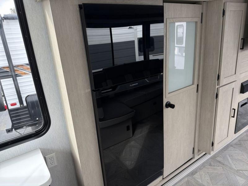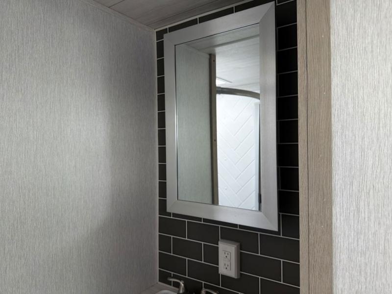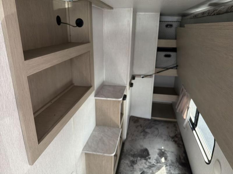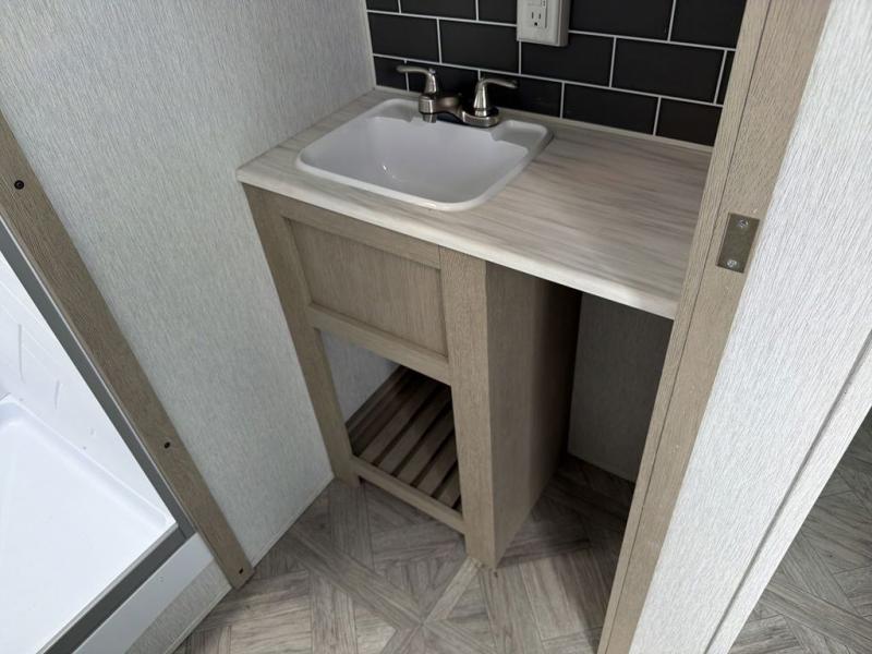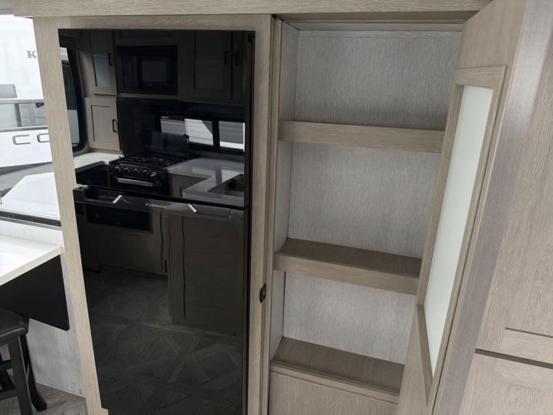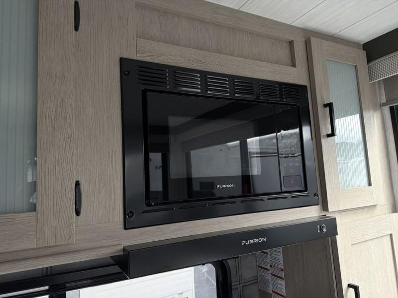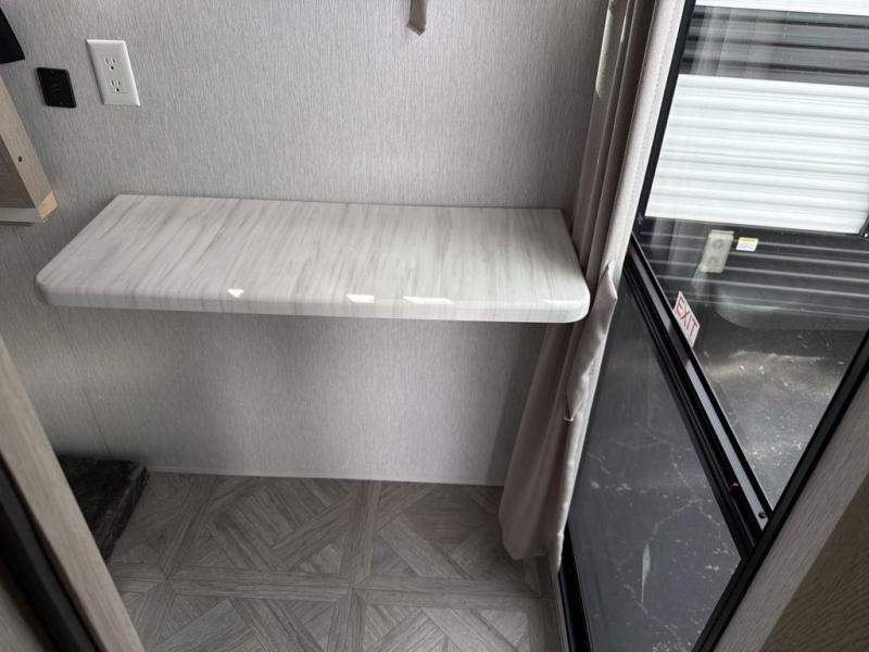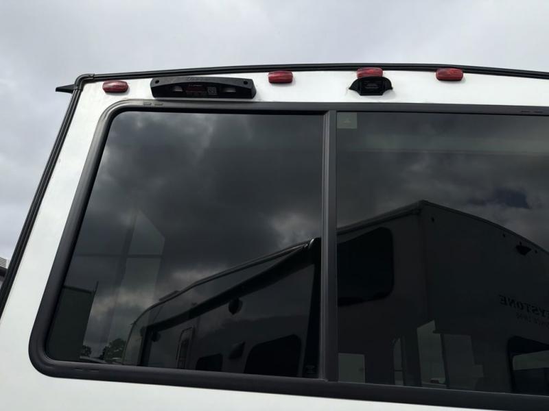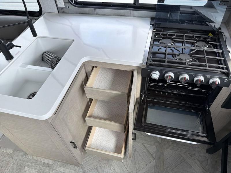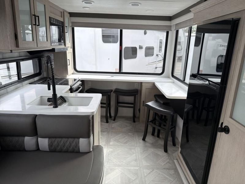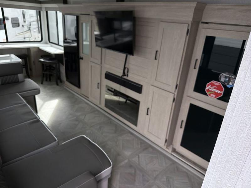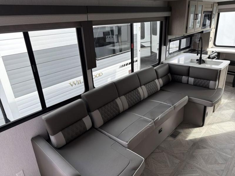 Your family of four or will enjoy this Wildwood View bunk model featuring 105 square feet of window space for unbelievable views of your surroundings. The Versa Slide features a refrigerator, pantry, and entertainment center with a door leading to a bunk space including a 30" x 70" flip-up bunk with a mattress pad below, storage cubbies for your things, and a desk with bar stool for any office work that you may need to do while you travel. All is neatly tucked away within the slide behind an entertainment wall with fireplace opposite the sectional sofa which is great for relaxing and entertaining family and friends indoors. The rear kitchen area offers 18 linear feet of countertop space with four bar stools, plus a three burner range and double sink. Your refrigerator and pantry will hold all of your perishables and dry goods, and those are nearby within the Versa slide. Up front, a private bedroom with Versa-Tilt custom king bed which provides 14-1/2" of additional walking around space, plus you will find a wardrobe that has been prepped for a washer and dryer if you choose to add, as well as dual nightstands beneath wardrobes on either side of the bed. A large pass-through storage compartment offers plenty of storage for your outdoor gear, and if you enjoy outdoor cooking, you might want to add the outside kitchen option as well.