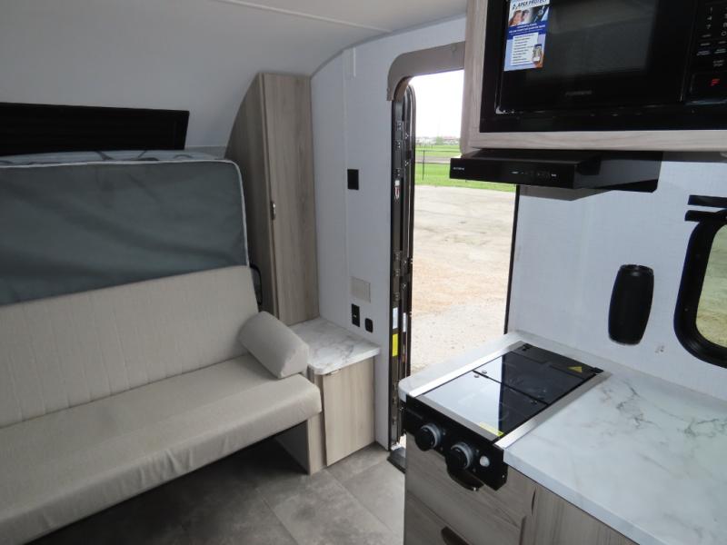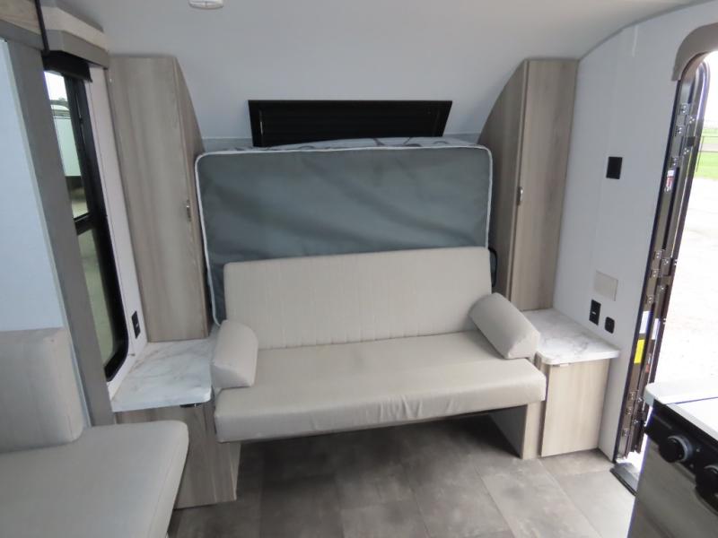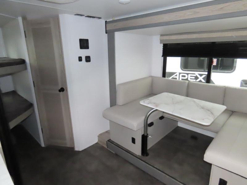 Once you've set up the 14' power awning with LED lights, make lunch on the outdoor kitchen. Explore some trails or take your fishing poles down to the river, then head back to the trailer to clean up in the full bath. The kids may want to rest on the double-size bunks, while the adults play a game around the U-shaped dinette. This model also includes a sofa plus a Murphy bed that lowers over the sofa when you're ready for bed. Don't let this travel trailer slip away!