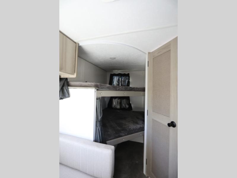 Find all you're looking for and more in this versatile travel trailer. The Murphy bed will be perfect for a great night's rest, and in the morning you can easily fold it up to relax on the sofa. The chef of your group can prepare breakfast on the two burner cooktop, or head outdoors to cook on the outside kitchen and enjoy the 14' power awning. The full bath allows you to stay clean all week, and the double-size bunks will be perfect for extra guests!