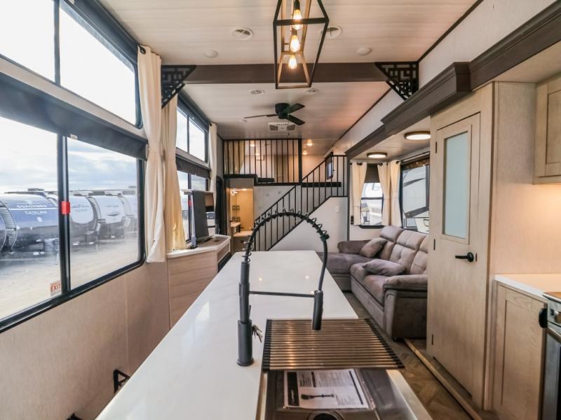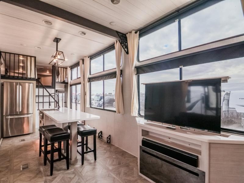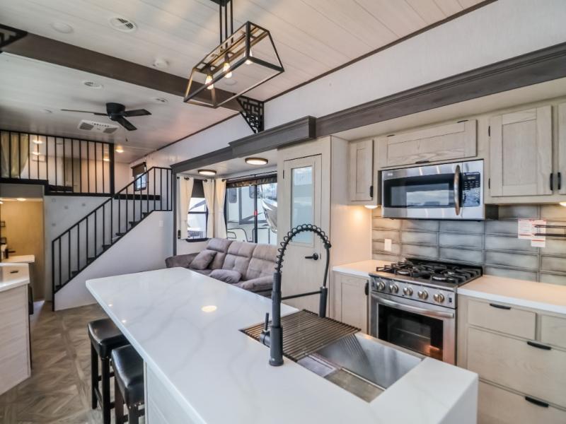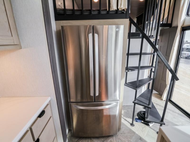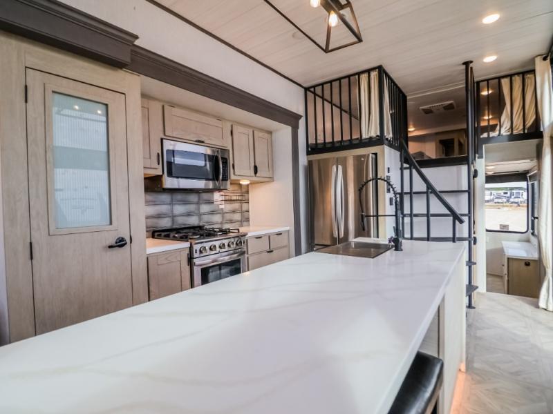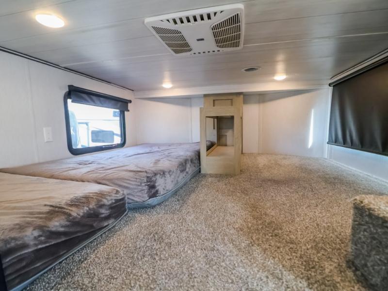 You will feel right at home in this destination trailer! It not only has one loft in the rear with two 42" x 74" bunk mats, but also a second loft in the front with spiral steps leading up to two bunk mats. The front private bedroom has a king bed slide with versa-tilt to lay your head on at night with front windows to let in lots of natural lighting and sunshine in the morning. Relax in true comfort at night on the L-shaped sectional sofa across from the entertainment center with a fireplace. The kitchen island provides extra space to prepare delicious meals and comes with four bar stools to enjoy your breakfast each morning. Everyone will stay fresh and clean with a walk-in shower in the rear private bedroom, plus there is an area prepped so you could add an optional washer and dryer. Head outside through either the patio door or the second entry/exit door each day!