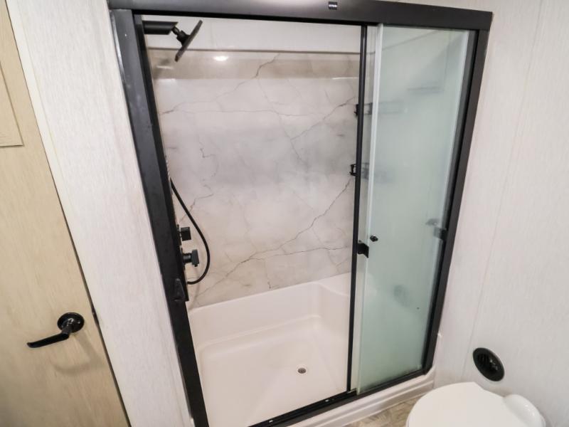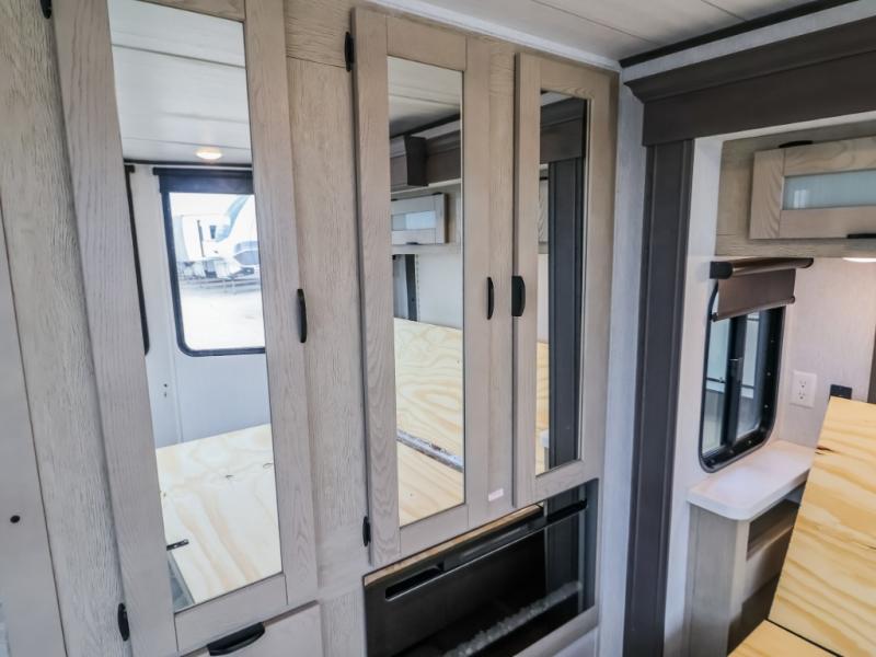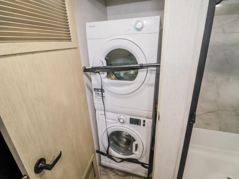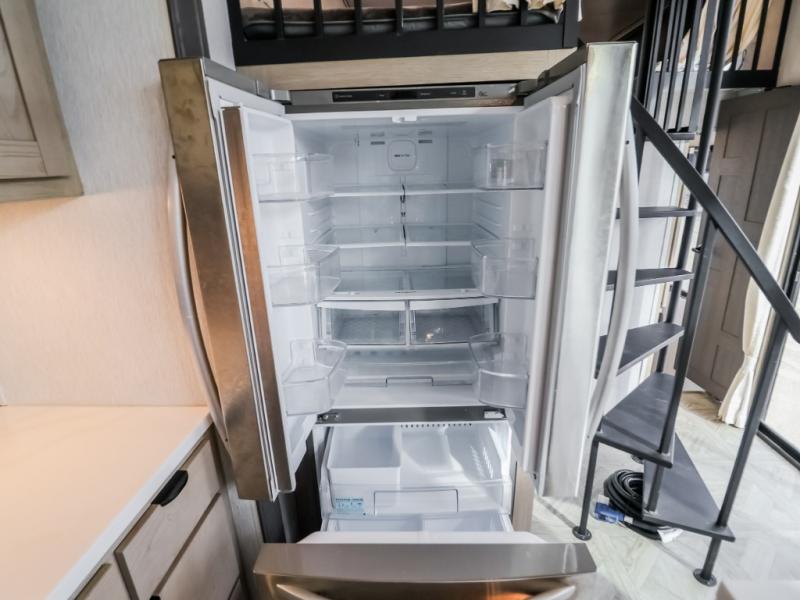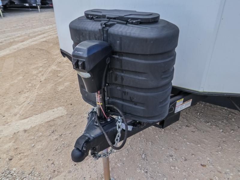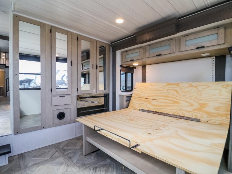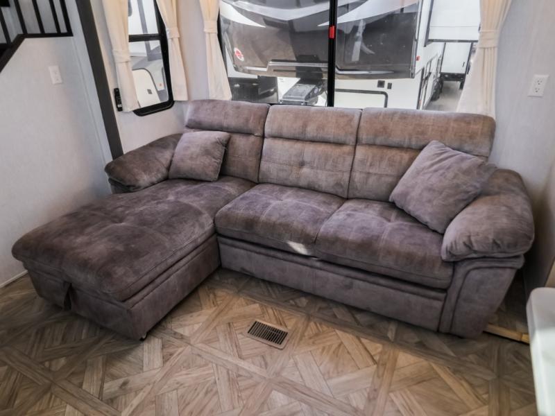 You will feel right at home in this destination trailer! It not only has one loft in the rear with two 42" x 74" bunk mats, but also a second loft in the front with spiral steps leading up to two bunk mats. The front private bedroom has a king bed slide with versa-tilt to lay your head on at night with front windows to let in lots of natural lighting and sunshine in the morning. Relax in true comfort at night on the L-shaped sectional sofa across from the entertainment center with a fireplace. The kitchen island provides extra space to prepare delicious meals and comes with four bar stools to enjoy your breakfast each morning. Everyone will stay fresh and clean with a walk-in shower in the rear private bedroom, plus there is an area prepped so you could add an optional washer and dryer. Head outside through either the patio door or the second entry/exit door each day!