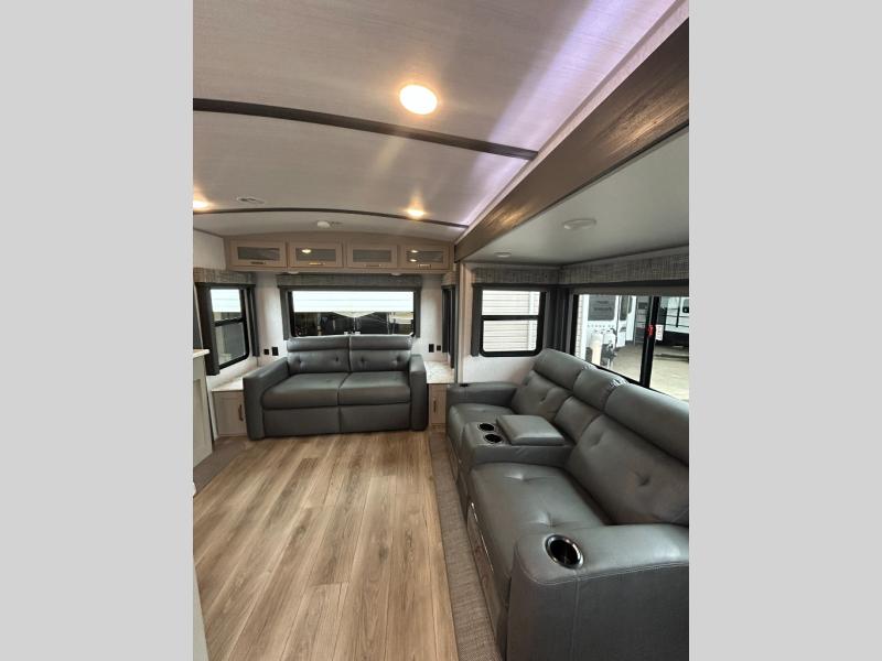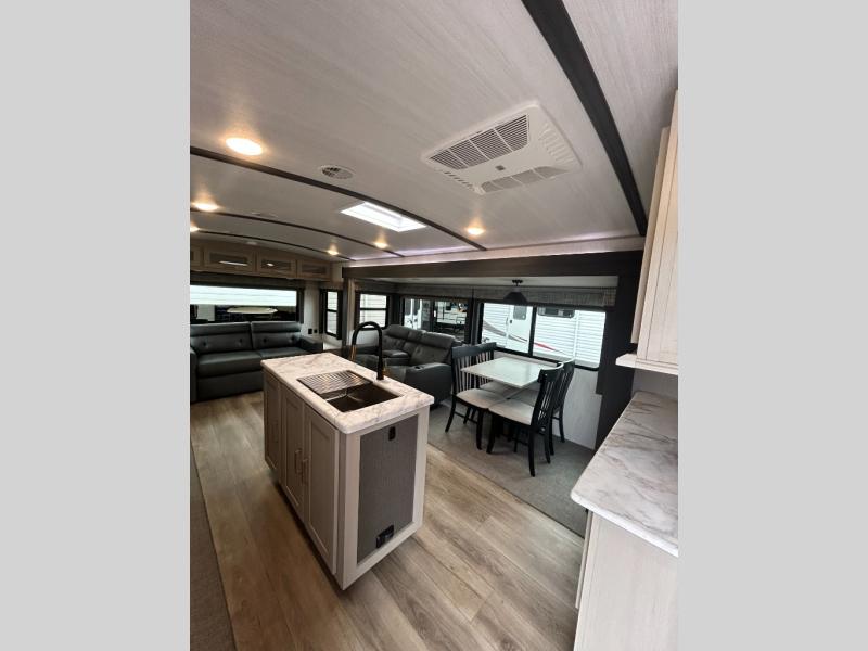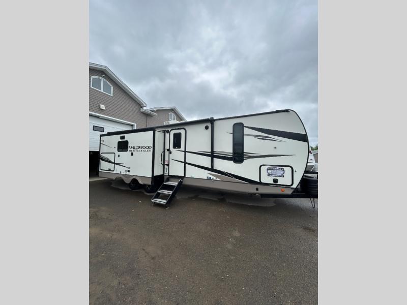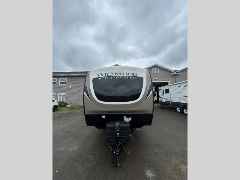 It's time to head to your destination with this Wildwood Heritage Glen travel trailer, whether it be a state park, RV resort, or your own land. Once you arrive, you can easily open up the dual opposing slides for more interior space and start planning your day. You might like to cook a meal, wash dishes using the kitchen island, and dine at the booth dinette, or you can choose the free-standing table option instead. Your guests may choose to relax in the theatre seats or the tri-fold sofa while watching TV, and the outside kitchen/bar will surely be a useful area when wanting to be outside. Don't worry about storage because the extra large pass-through compartment is available for your camping chairs, tables, fishing rods, and such.