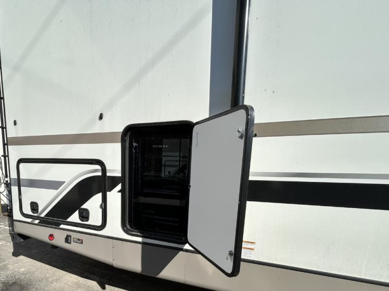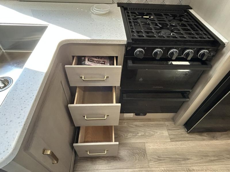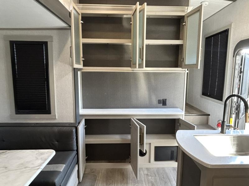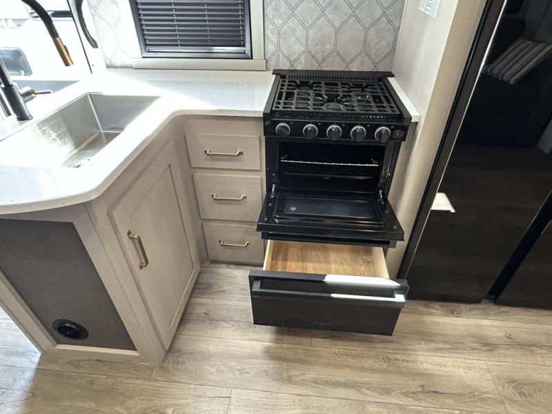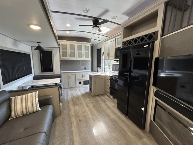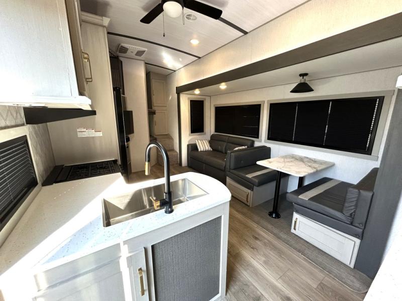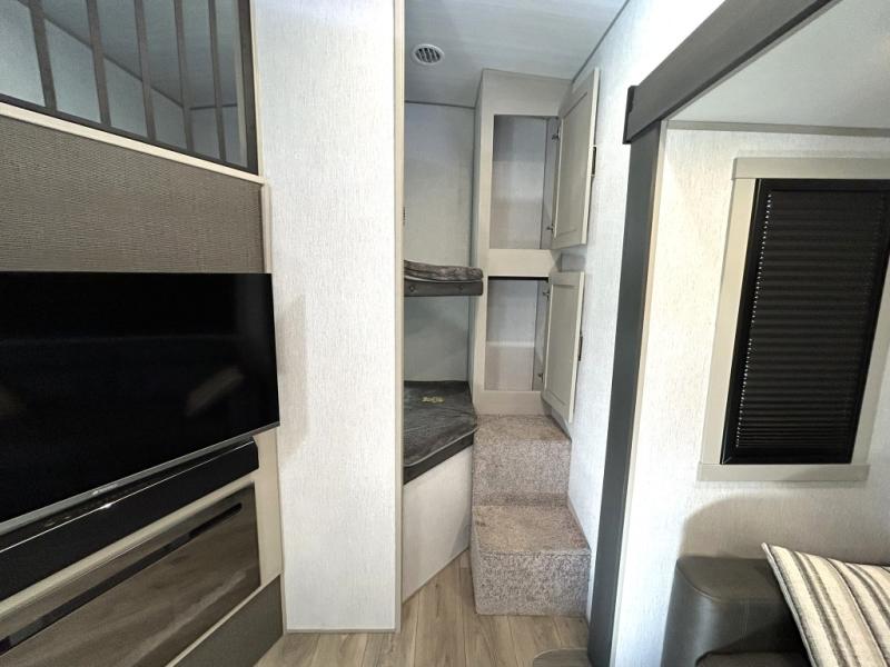 Step inside and be greeted by a bright, open floorplan with dual slide-outs that expand the living area, creating generous room for relaxing, dining, and entertaining. The rear bunkhouse is a standout feature, offering multiple sleeping spaces and storage that make this trailer ideal for kids, guests, or even extra gear. The main living area flows seamlessly into the well-equipped kitchen, complete with a large refrigerator, three-burner cooktop, oven, microwave, and plenty of countertop space — perfect for preparing meals on the go.