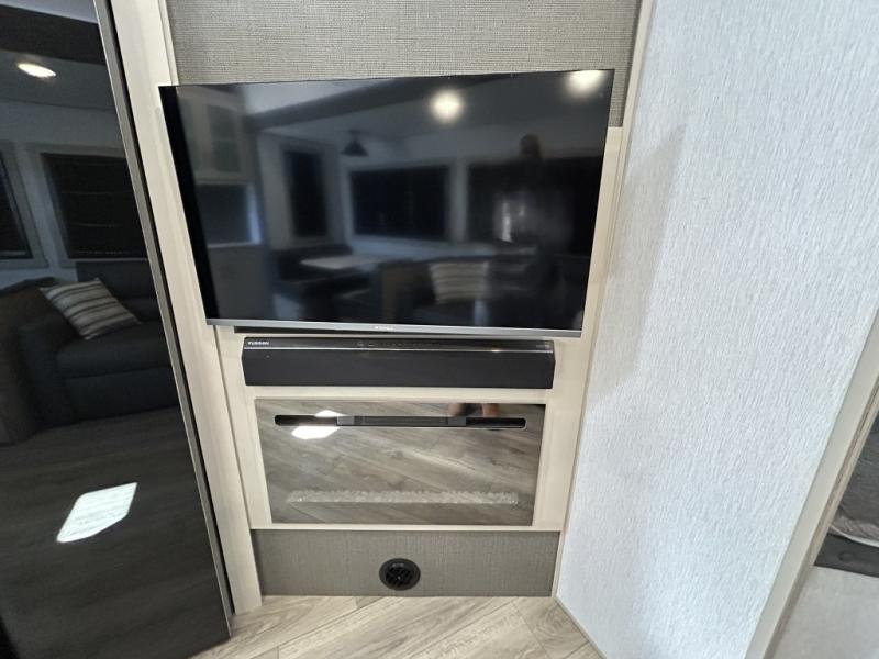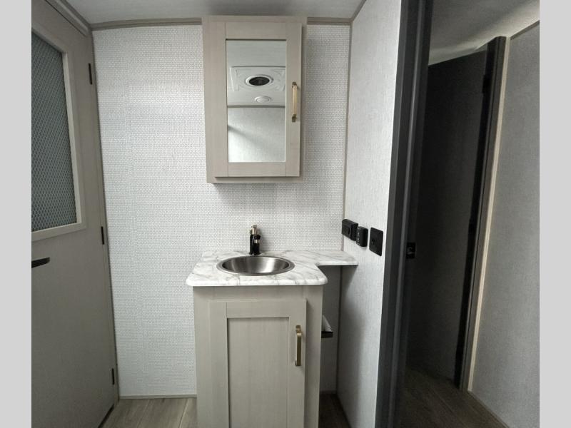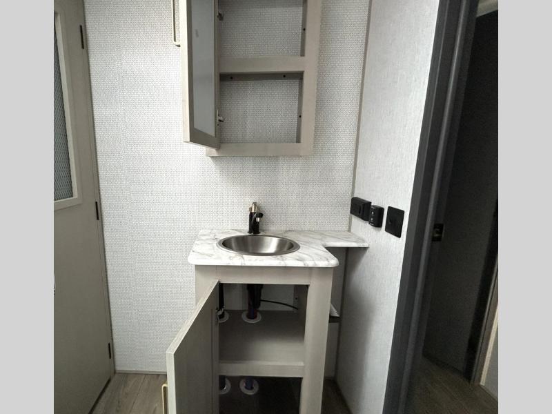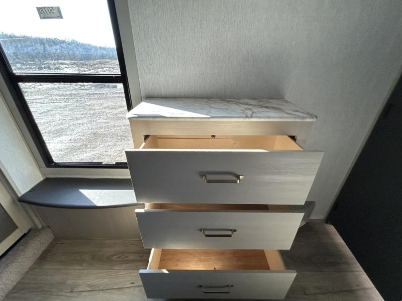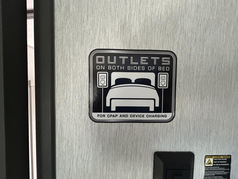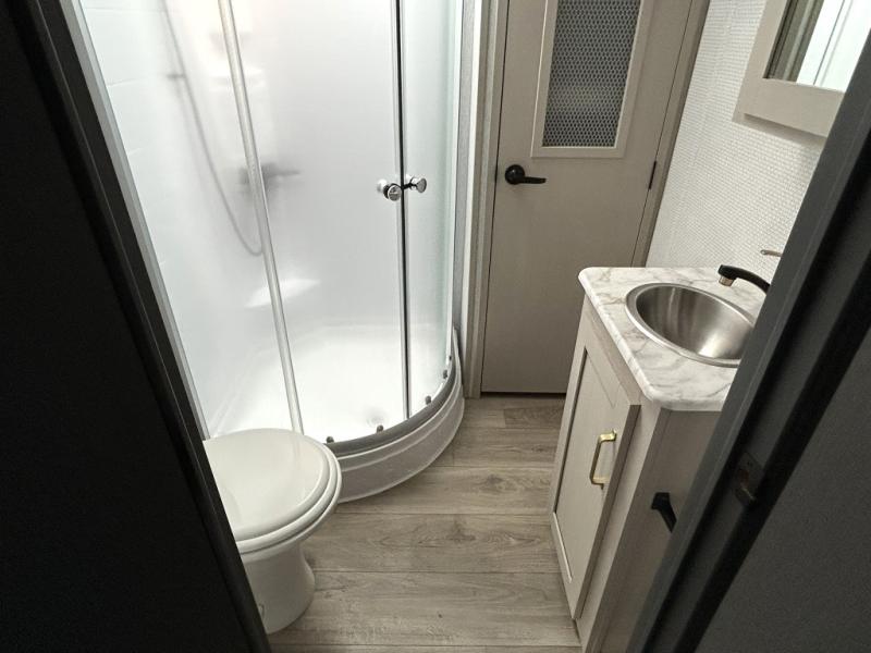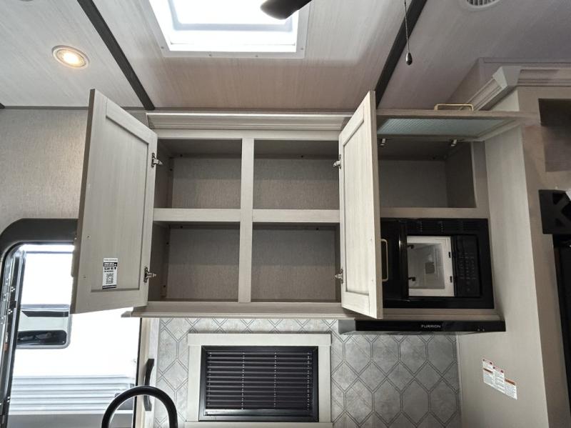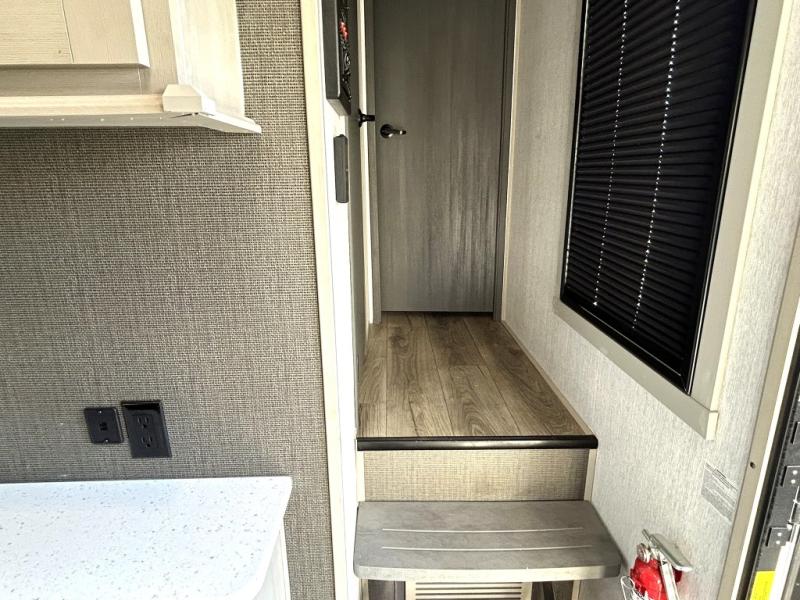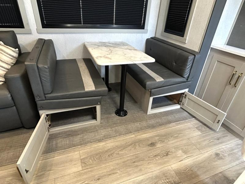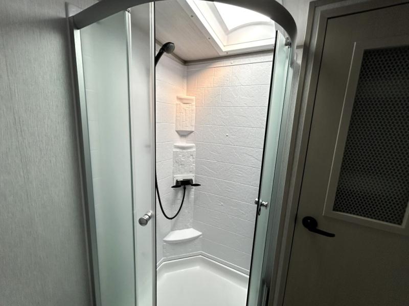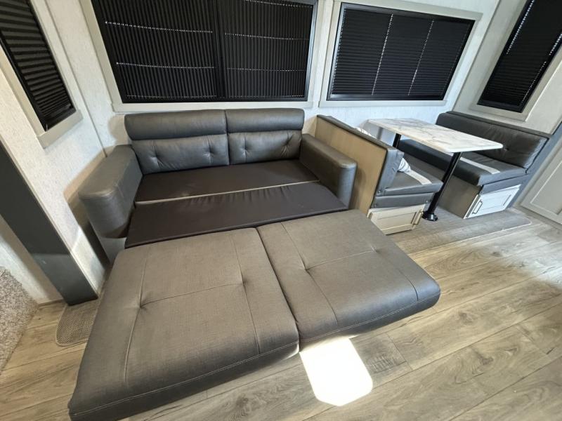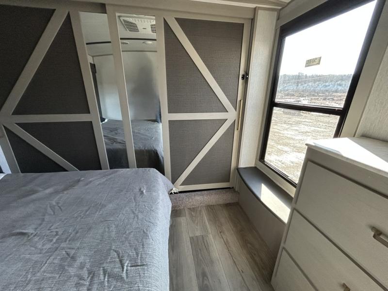Gather around the cozy dinette for meals or game nights, then relax on the sofa after a day of hiking, kayaking, or sightseeing. Large panoramic windows let in natural light and scenic views, making every campground feel like home. When it’s time for rest, the private front bedroom offers a comfortable queen bed with storage and wardrobe space, ensuring peaceful nights under the stars.