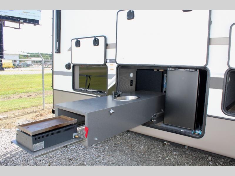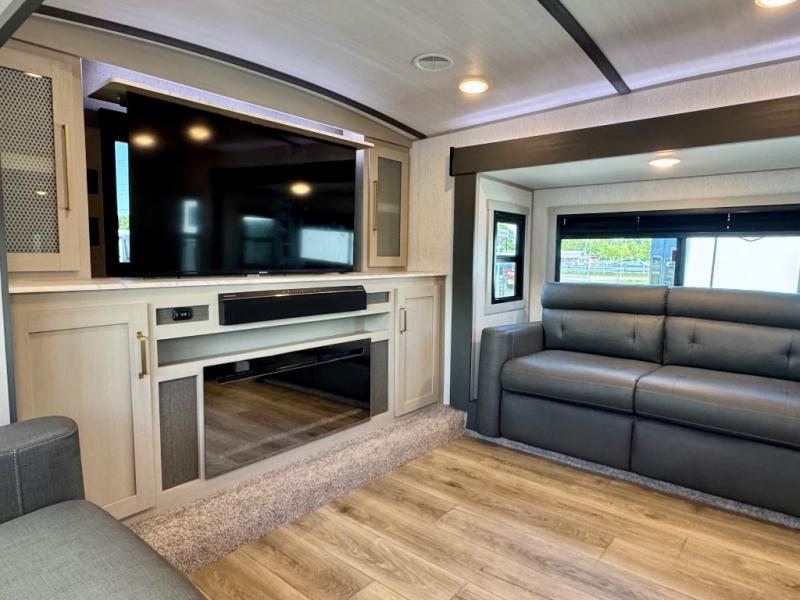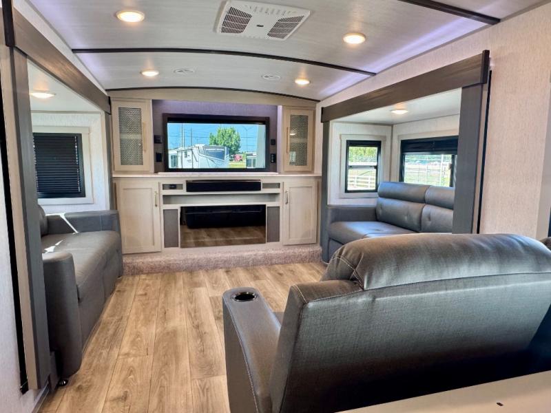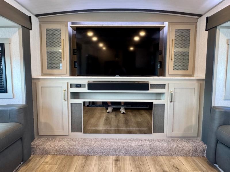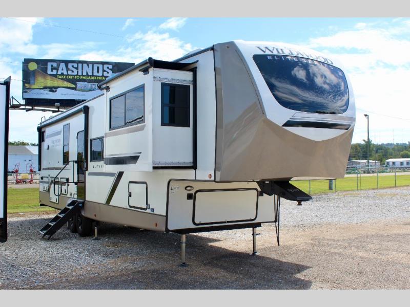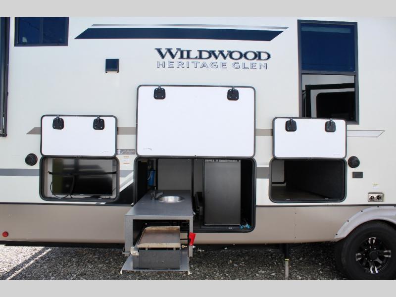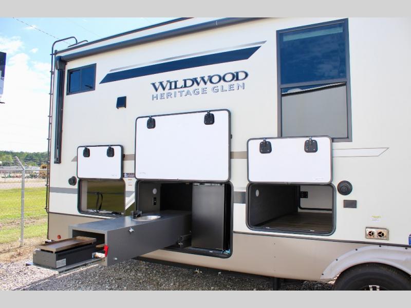 Invite the grandkids or your neighbor friends for your next camping trip in this Wildwood Heritage Glen Elite fifth wheel that features a front entertainment center and living area. Your guests will love the two tri-fold sofas within dual opposing slides to make the room their own. You'll also enjoy theatre seats and a fireplace for an even more at-home feel. The large pantry in the kitchen is very handy as well as the breakfast bar with swivel bar stools. This unit also includes a full and half bath for your convenience, and a king bed with Versa-Tilt on an Elite extra-wide bed slide in the private bedroom. There is abundant storage with multiple pass-through compartments included, so you don't have to leave any of your larger gear behind. Outdoors, you can also enjoy the 20' awning, the strut-assisted steps when entering and exiting, and the Elite outdoor bar and entertainment center which includes a 32" TV, a griddle, and a refrigerator.