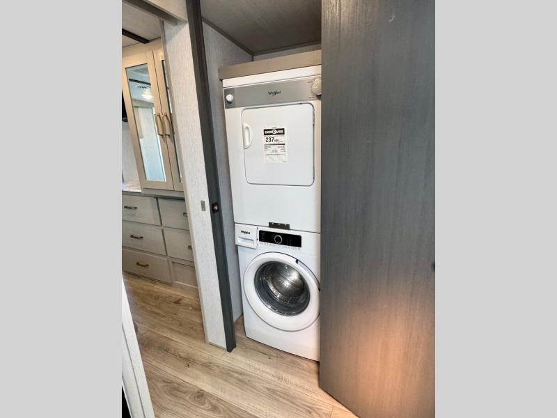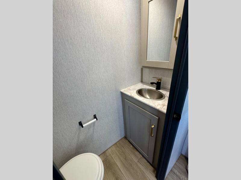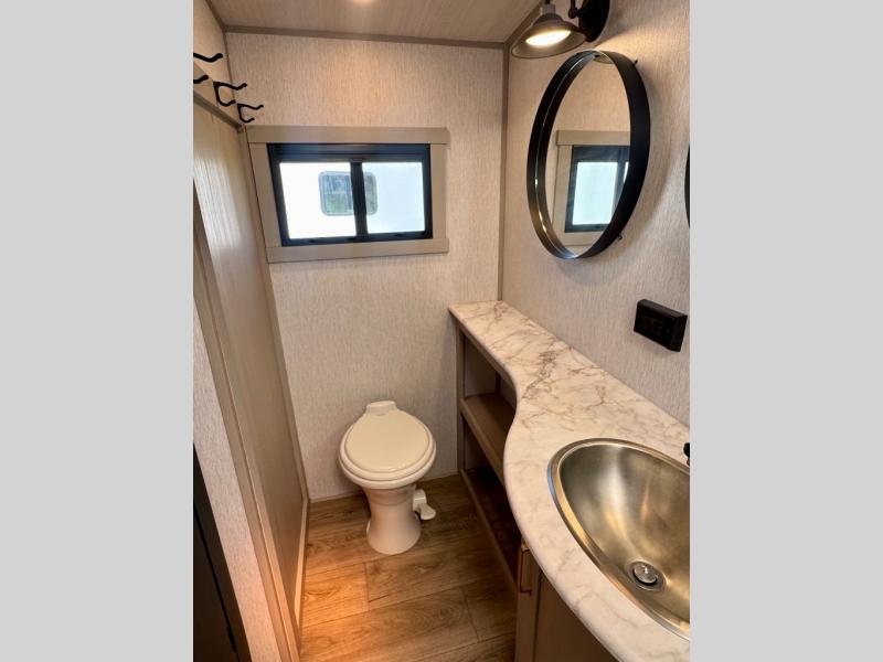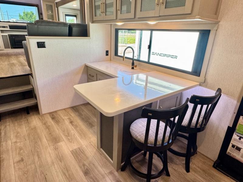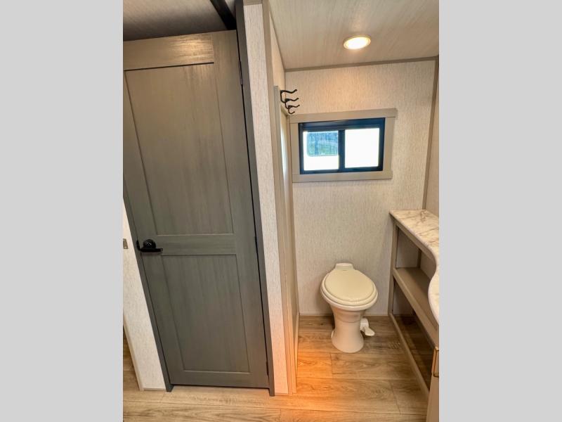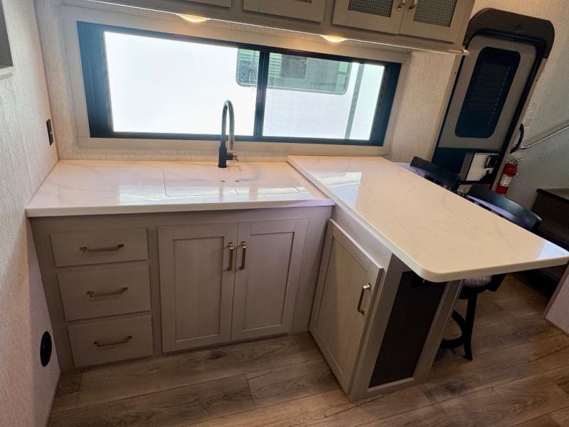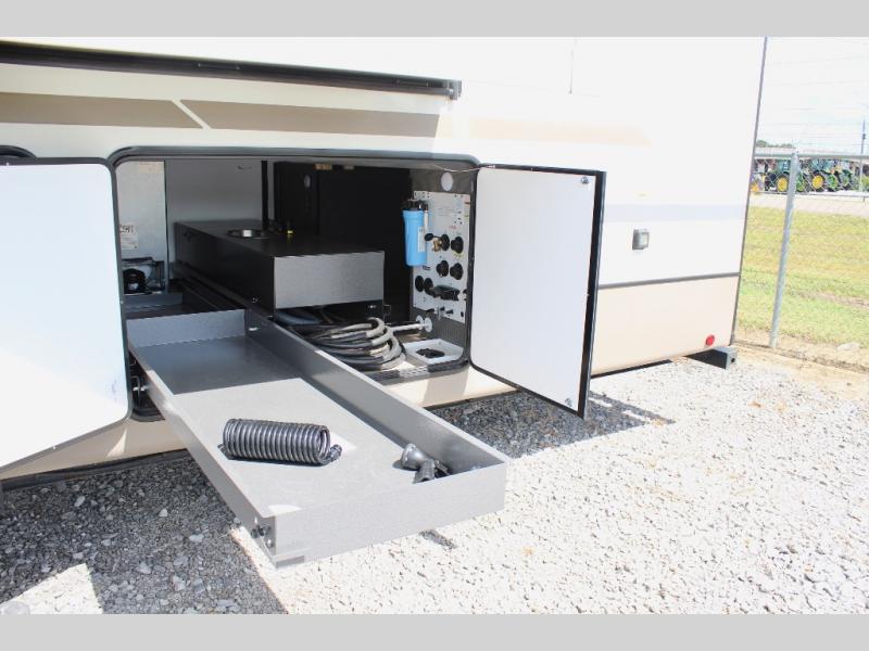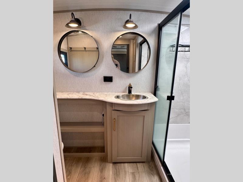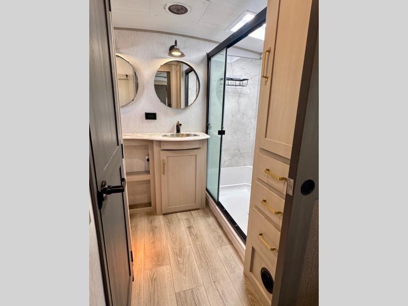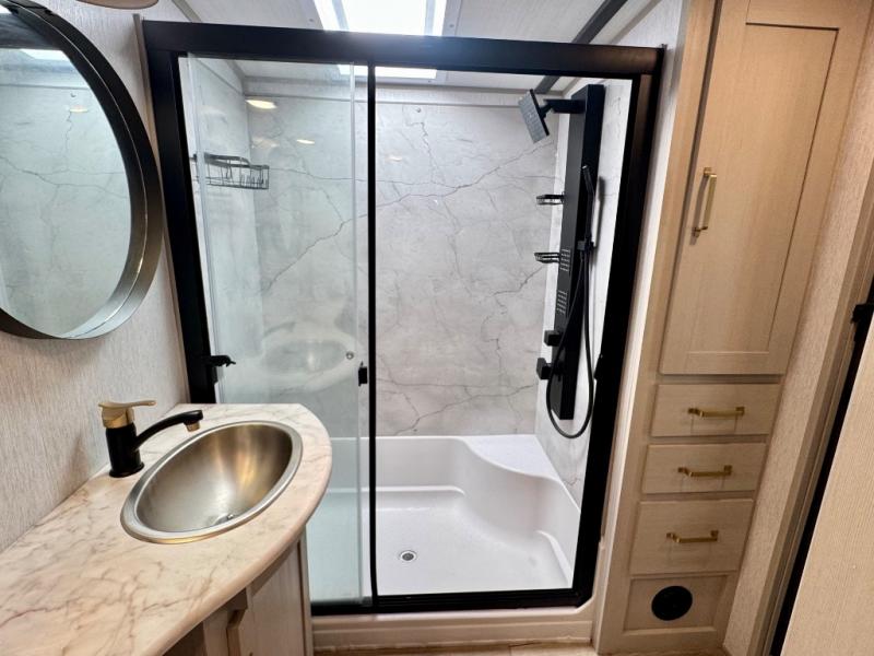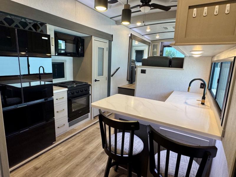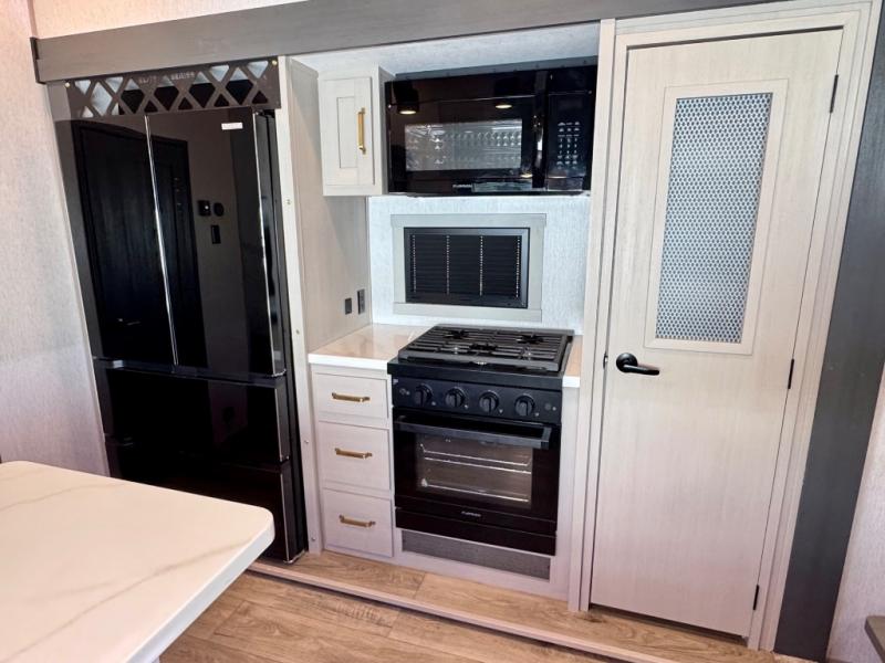 Each Wildwood Heritage Glen Elite Series fifth wheel by Forest River is constructed with vacuum bonded "Aluma Frame" sidewalls and floor, block foam insulation, and an AccessiBelly underbelly with 12V tank heaters on all holding tanks to help extend your camping season. There is an exterior docking station with hot and cold water, along with power stabilizer jacks and landing gear, and Goodyear radial tires with black accented rims. There is also an in-line water filtration system, an RV Airflow system, and an extra large pass-through storage with Slam Latch baggage doors and magnetic catches for hassle-free packing. You will love the high-end solid surface countertops inside, along with gold-accented faucets with stainless steel sinks in all bathrooms, and European oak colored horizontal plank linoleum flooring that is both stylish and easy to keep clean!
