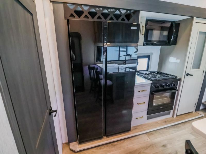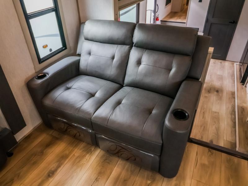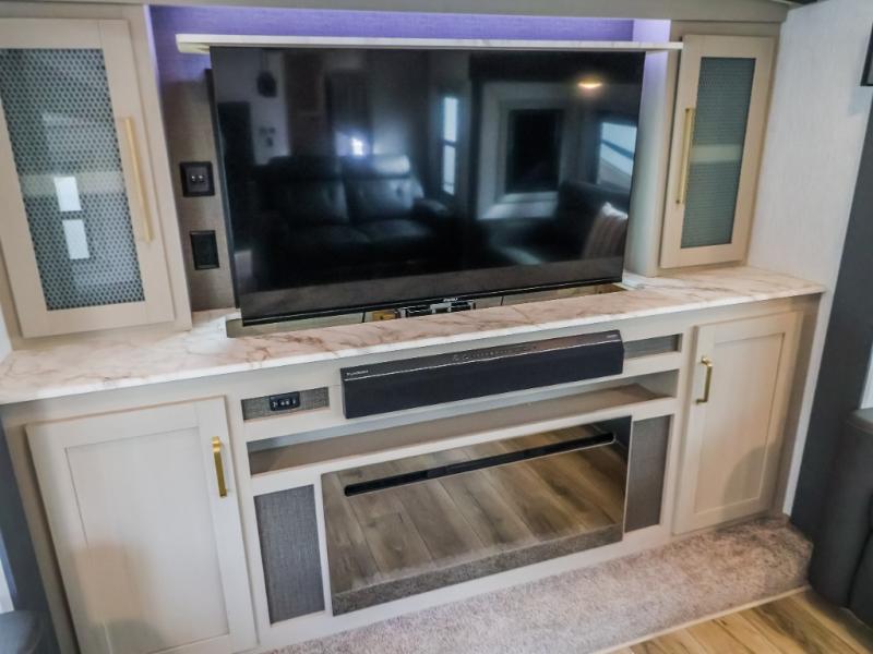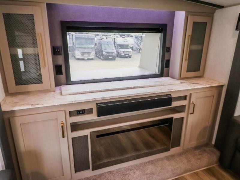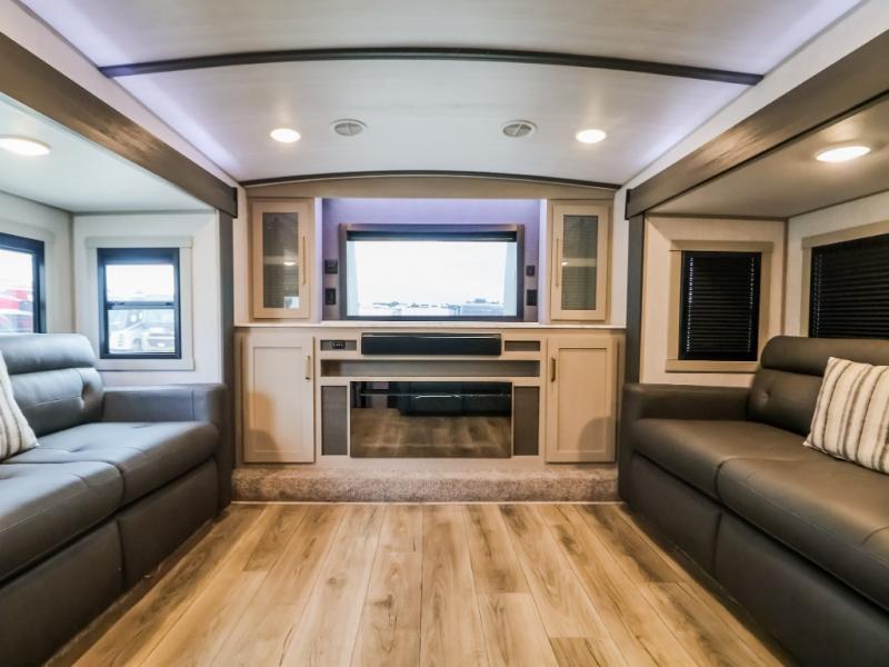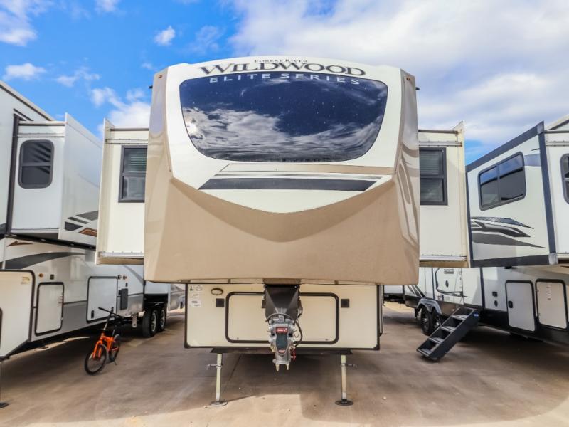 Invite the grandkids or your neighbor friends for your next camping trip in this Wildwood Heritage Glen Elite fifth wheel that features a front entertainment center and living area. Your guests will love the two tri-fold sofas within dual opposing slides to make the room their own. You'll also enjoy theatre seats and a fireplace for an even more at-home feel. The large pantry in the kitchen is very handy as well as the breakfast bar with swivel bar stools. This unit also includes a full and half bath for your convenience, and a king bed with Versa-Tilt on an Elite extra-wide bed slide in the private bedroom. There is abundant storage with multiple pass-through compartments included, so you don't have to leave any of your larger gear behind. Outdoors, you can also enjoy the 20' awning, the strut-assisted steps when entering and exiting, and the Elite outdoor bar and entertainment center which includes a 32" TV, a griddle, and a refrigerator.