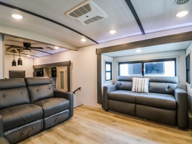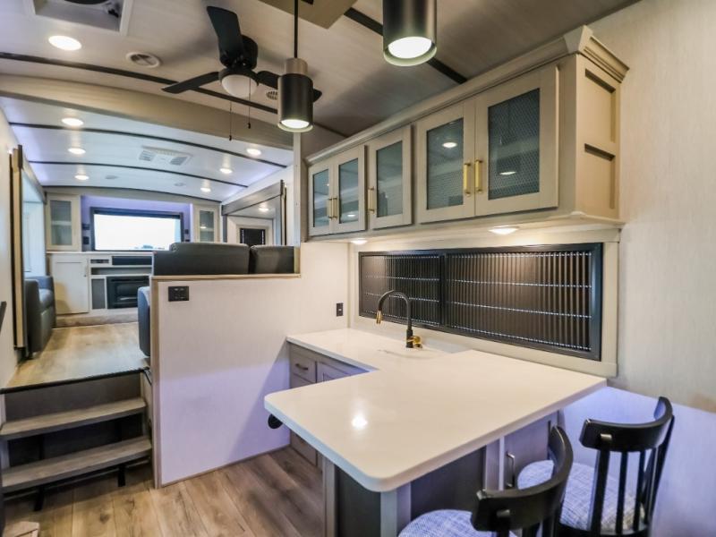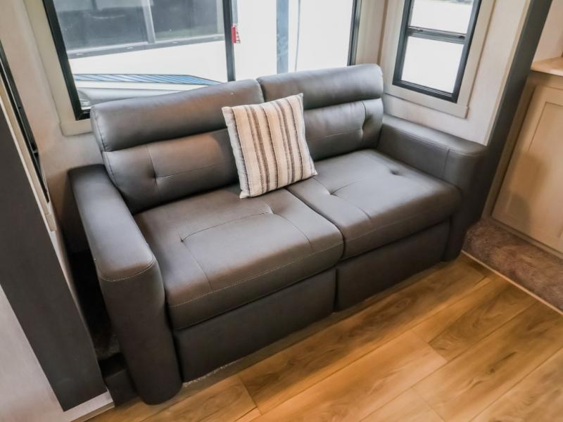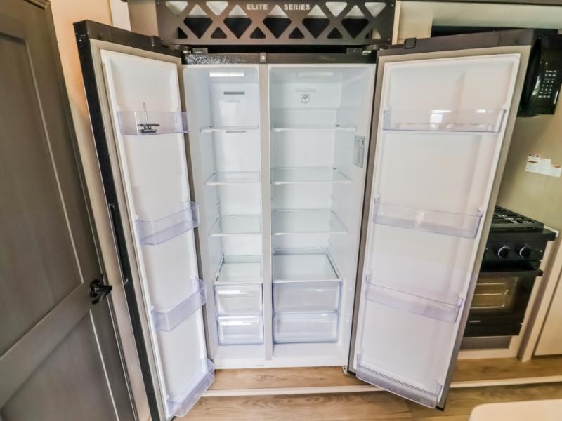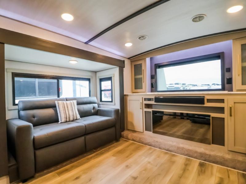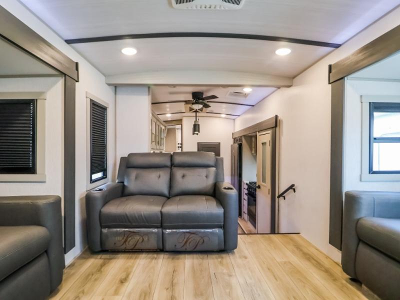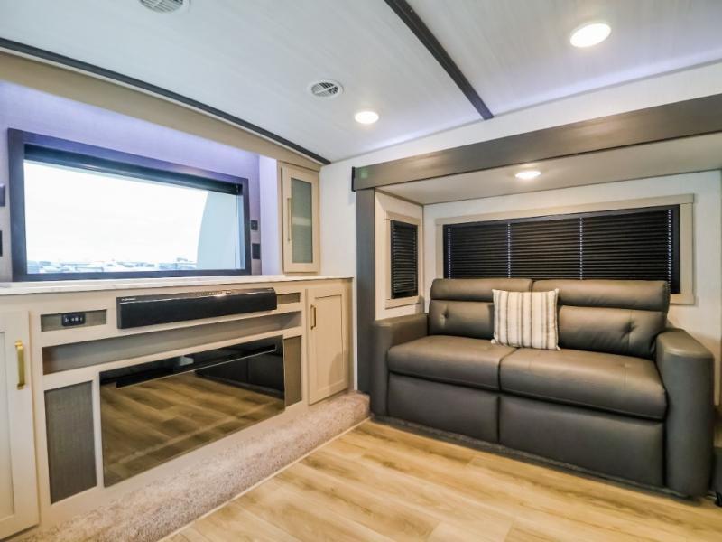 Invite the grandkids or your neighbor friends for your next camping trip in this Wildwood Heritage Glen Elite fifth wheel that features a front entertainment center and living area. Your guests will love the two tri-fold sofas within dual opposing slides to make the room their own. You'll also enjoy theatre seats and a fireplace for an even more at-home feel. The large pantry in the kitchen is very handy as well as the breakfast bar with swivel bar stools. This unit also includes a full and half bath for your convenience, and a king bed with Versa-Tilt on an Elite extra-wide bed slide in the private bedroom. There is abundant storage with multiple pass-through compartments included, so you don't have to leave any of your larger gear behind. Outdoors, you can also enjoy the 20' awning, the strut-assisted steps when entering and exiting, and the Elite outdoor bar and entertainment center which includes a 32" TV, a griddle, and a refrigerator.