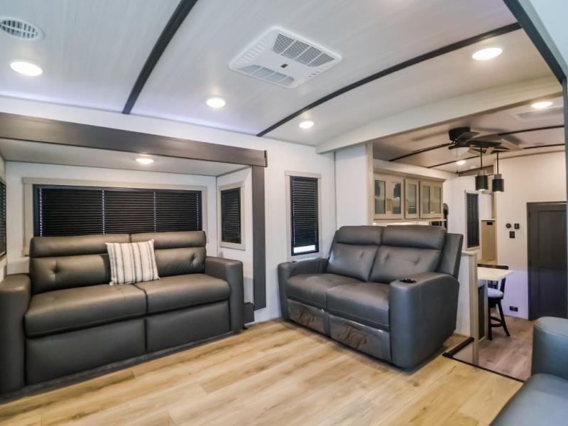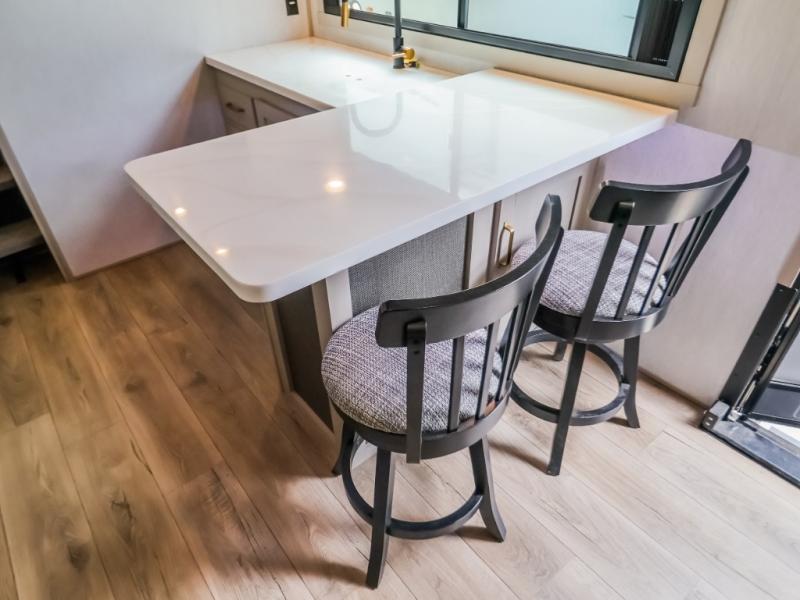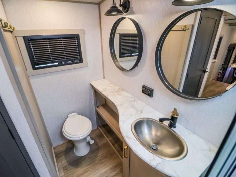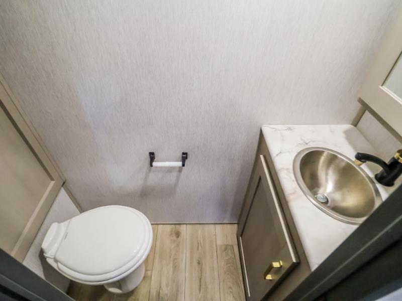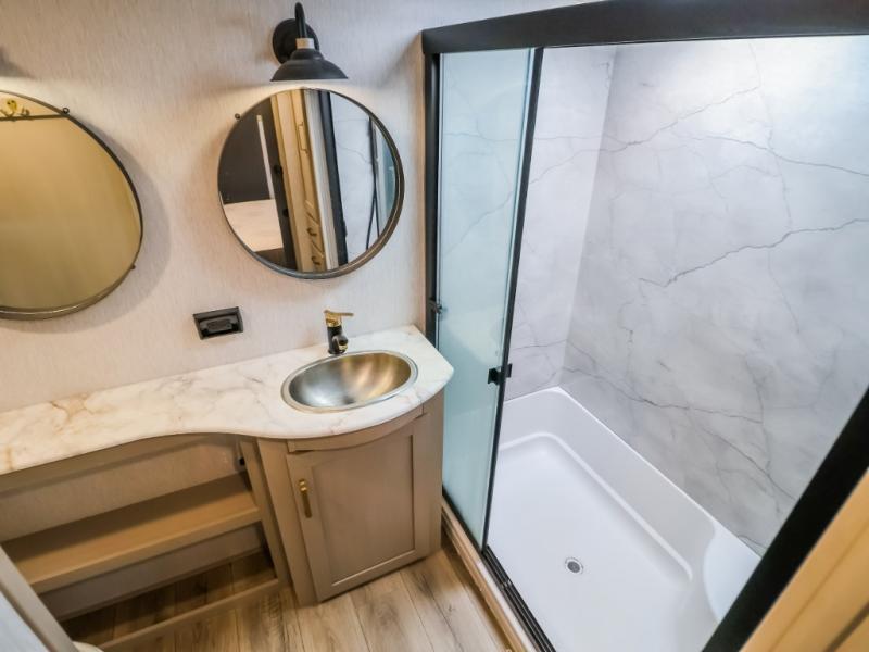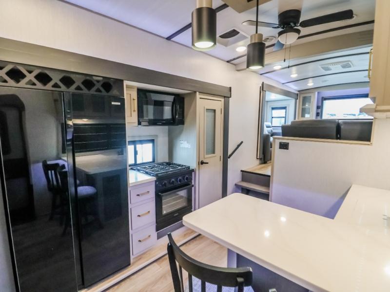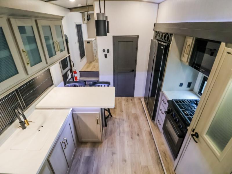 Each Wildwood Heritage Glen Elite Series fifth wheel by Forest River is constructed with vacuum bonded "Aluma Frame" sidewalls and floor, block foam insulation, and an AccessiBelly underbelly with 12V tank heaters on all holding tanks to help extend your camping season. There is an exterior docking station with hot and cold water, along with power stabilizer jacks and landing gear, and Goodyear radial tires with black accented rims. There is also an in-line water filtration system, an RV Airflow system, and an extra large pass-through storage with Slam Latch baggage doors and magnetic catches for hassle-free packing. You will love the high-end solid surface countertops inside, along with gold-accented faucets with stainless steel sinks in all bathrooms, and European oak colored horizontal plank linoleum flooring that is both stylish and easy to keep clean!