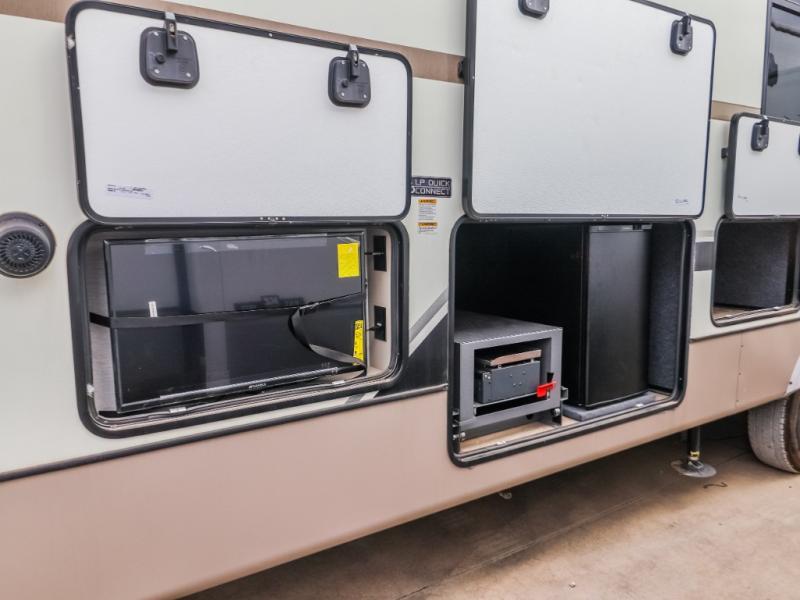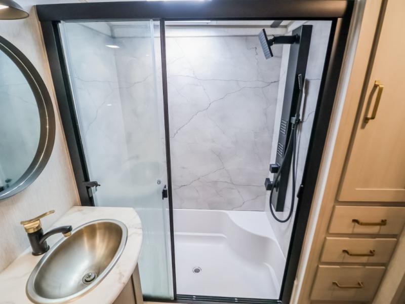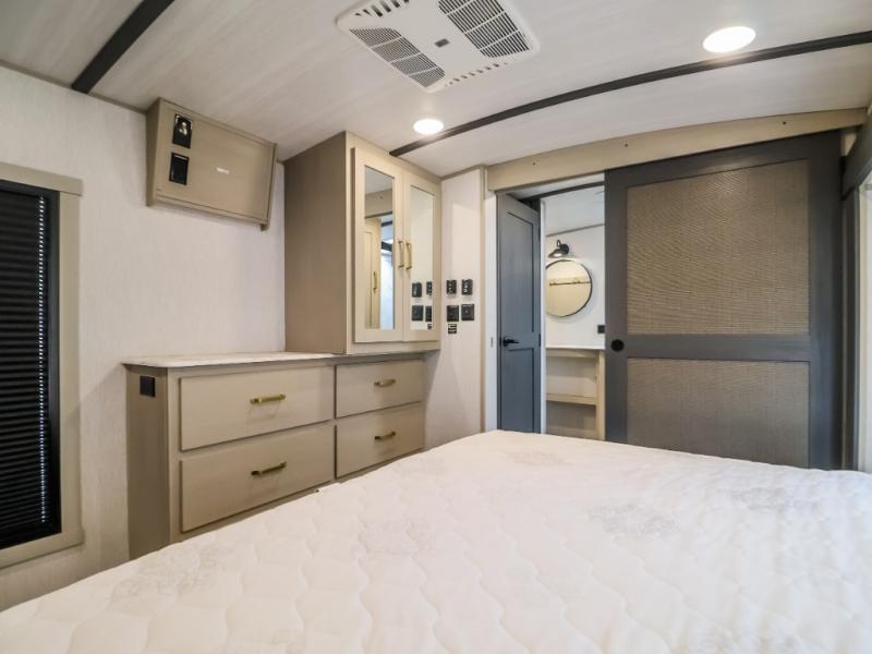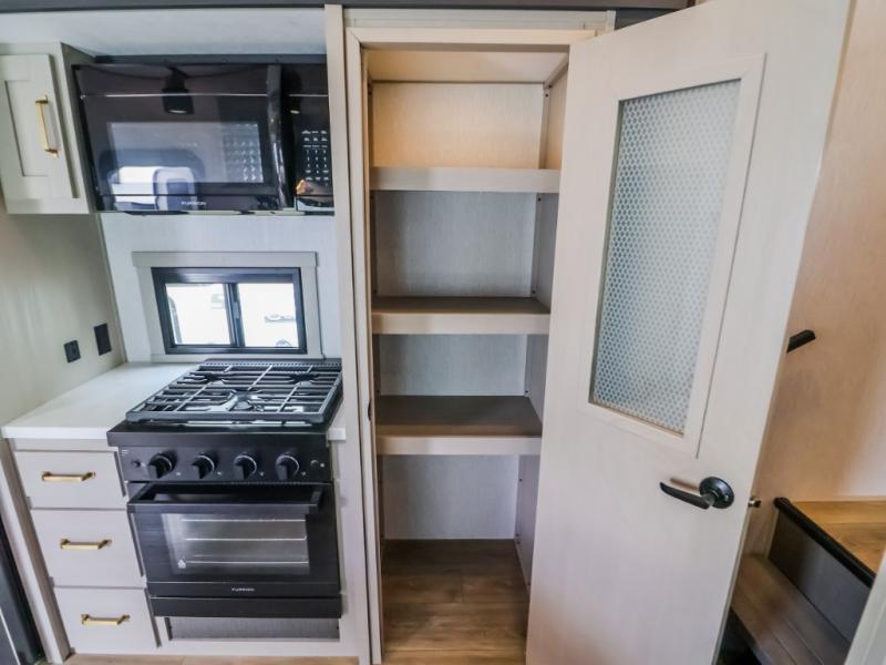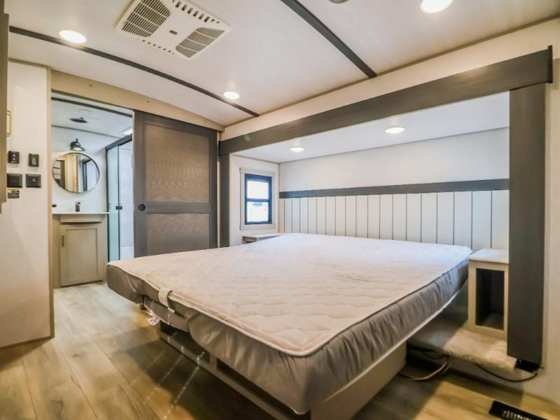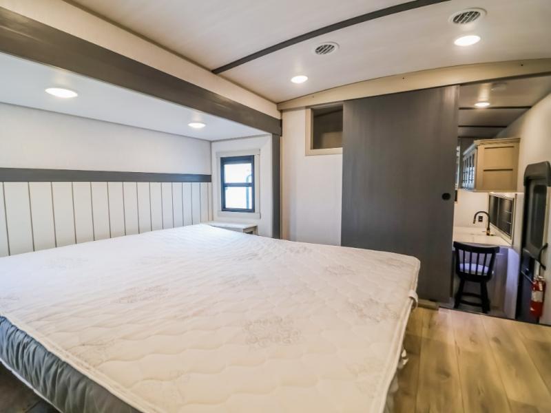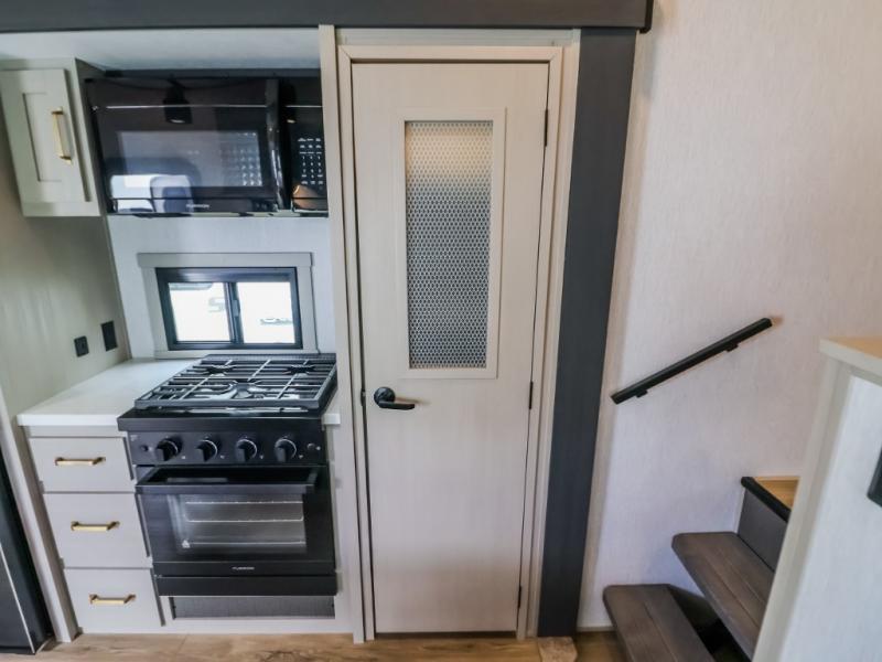 Each Wildwood Heritage Glen Elite Series fifth wheel by Forest River is constructed with vacuum bonded "Aluma Frame" sidewalls and floor, block foam insulation, and an AccessiBelly underbelly with 12V tank heaters on all holding tanks to help extend your camping season. There is an exterior docking station with hot and cold water, along with power stabilizer jacks and landing gear, and Goodyear radial tires with black accented rims. There is also an in-line water filtration system, an RV Airflow system, and an extra large pass-through storage with Slam Latch baggage doors and magnetic catches for hassle-free packing. You will love the high-end solid surface countertops inside, along with gold-accented faucets with stainless steel sinks in all bathrooms, and European oak colored horizontal plank linoleum flooring that is both stylish and easy to keep clean!