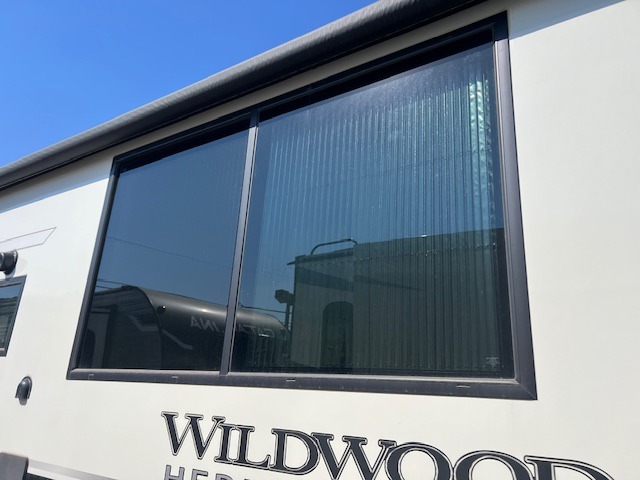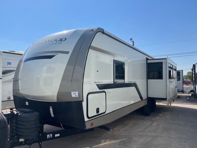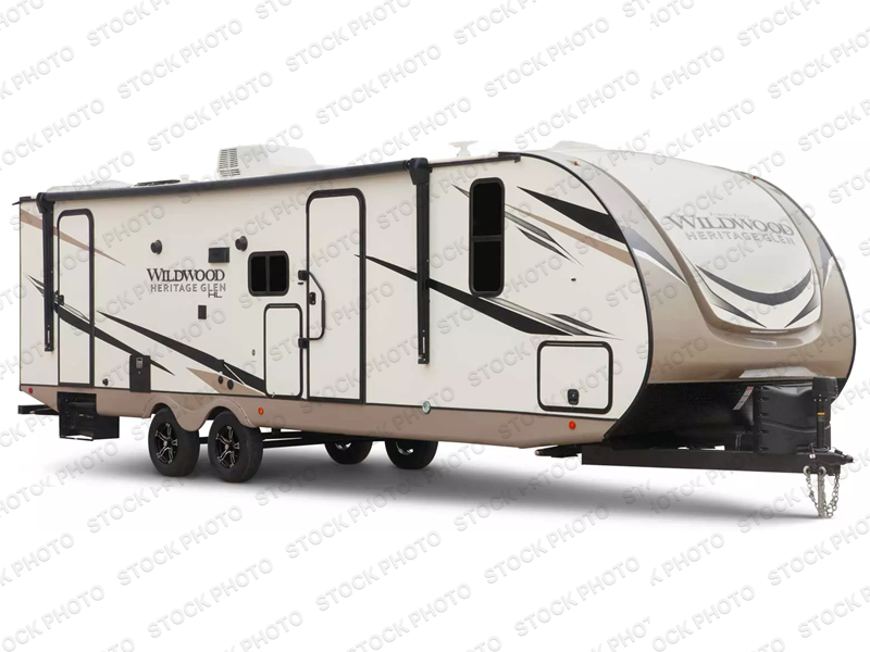 The Wildwood Heritage Glen Hyper-Lyte travel trailer by Forest River offers stability with a wide stance axle system, easy setup with a power tongue jack with an LED docking light, and safe entry with the Step Above aluminum entry steps. The XL Max-Tint panoramic window(s) in the main slide bring the outside inside, plus the kitchen offers a recessed glass stove top cover, a Midnight glass range hood and microwave, plus more. You will also find a back-up camera prep and solar prep, an outdoor shower, black-accented upgraded aluminum wheels, and many more exterior conveniences.